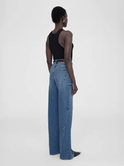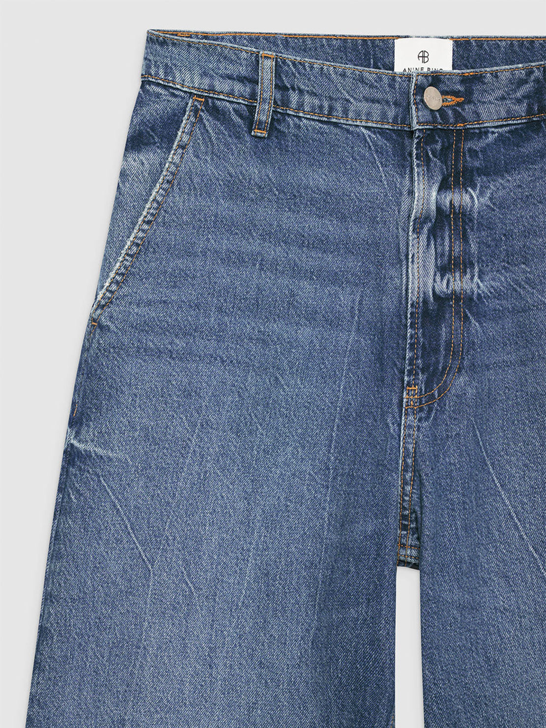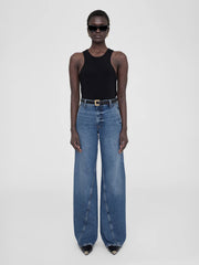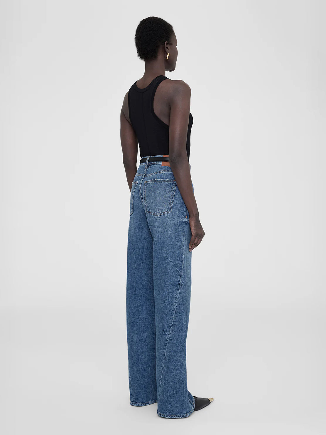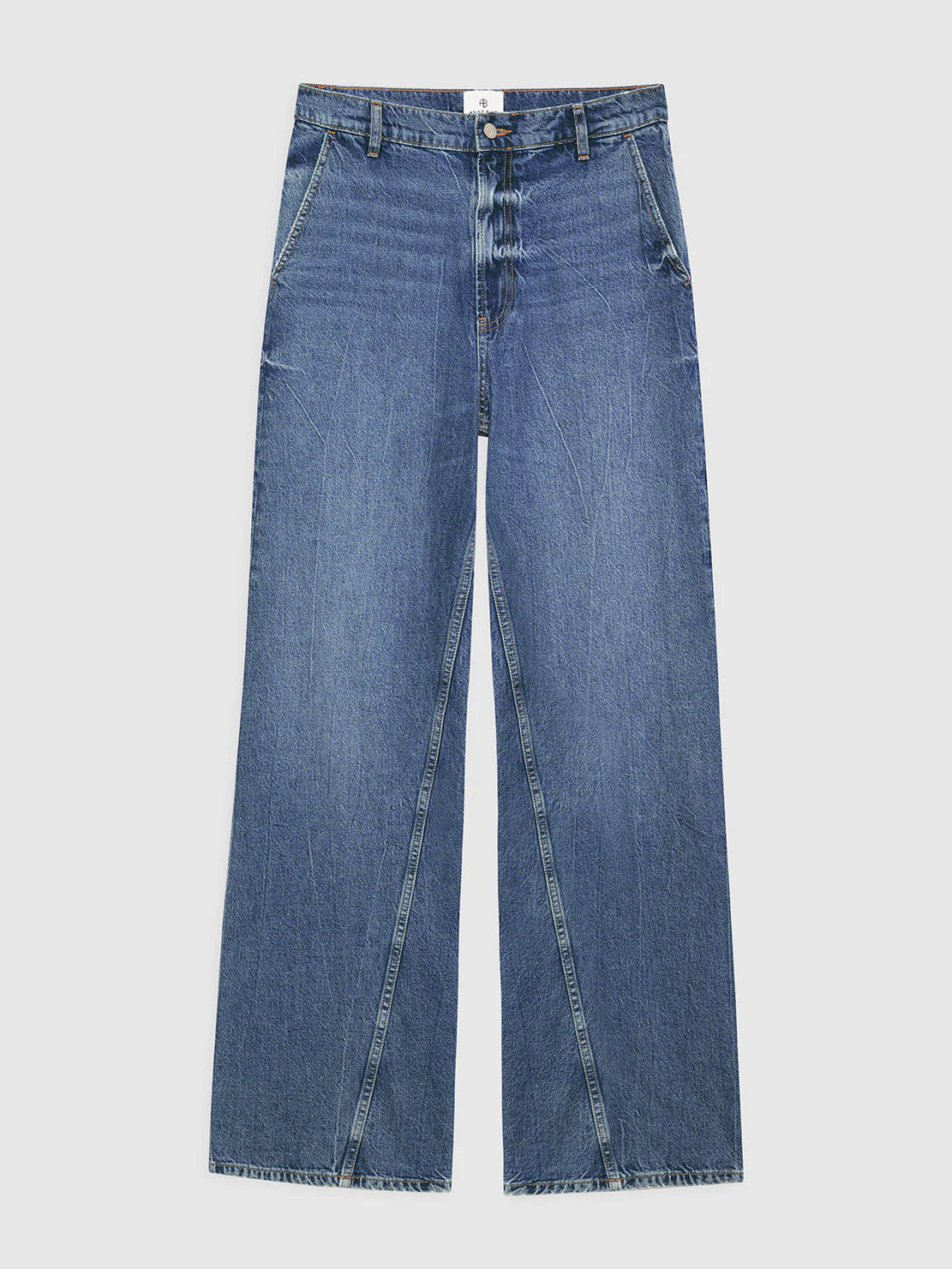 The Anine Bing Briley Jean is constructed from lightweight rigid denim with a soft hand and slight drape in a medium vintage blue wash with subtle veining throughout. Its relaxed, trouser-inspired silhouette features slanted front pockets and twisted inseam and outseam detailing.
