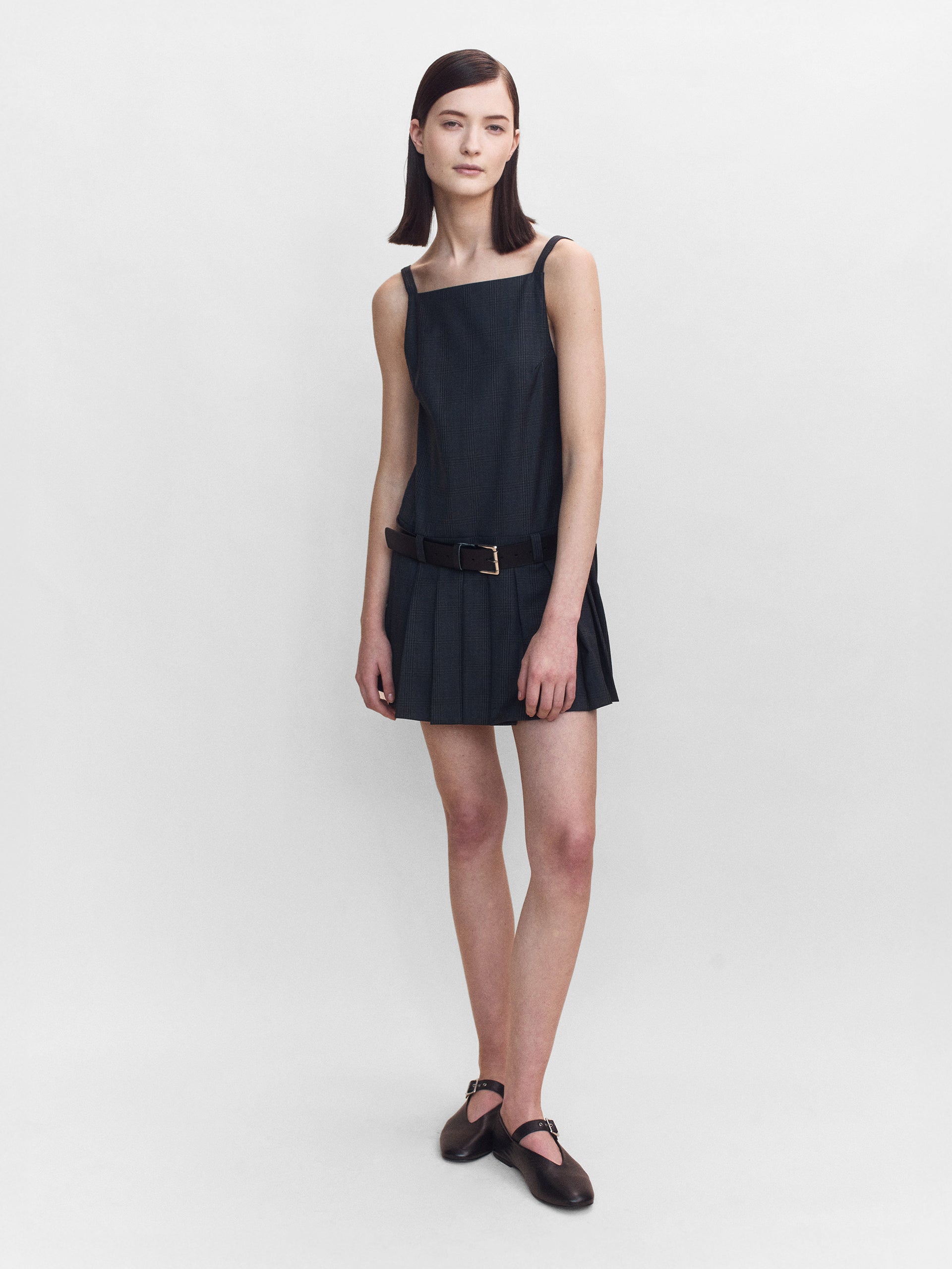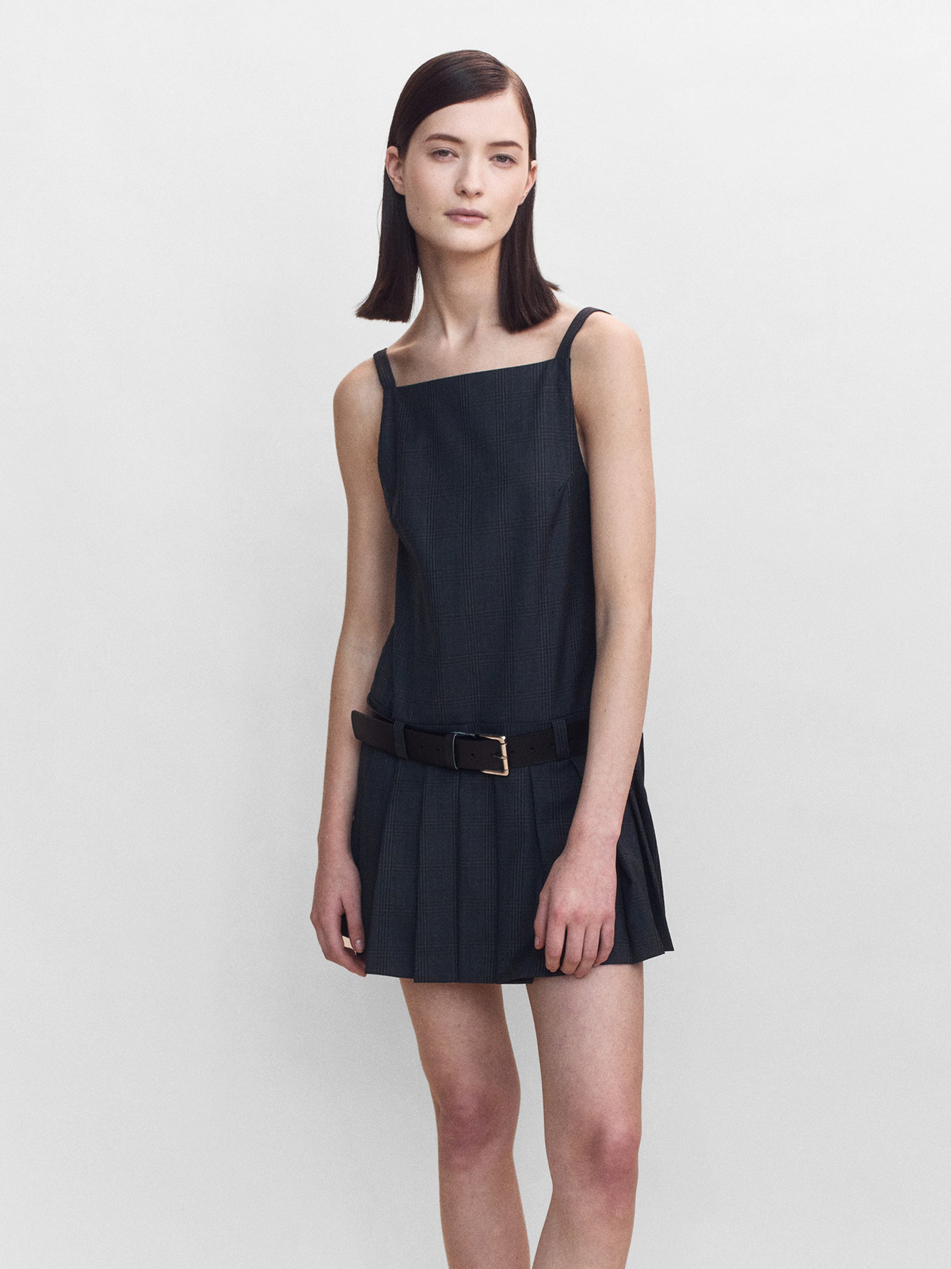 The Dana Wool Check Mini Dress features a pinafore-style neckline and a drop waist pleated skirt, cut in a luxurious Prince of Wales wool. Paying homage to the founders' schoolgirl days and modern codes of femininity.