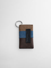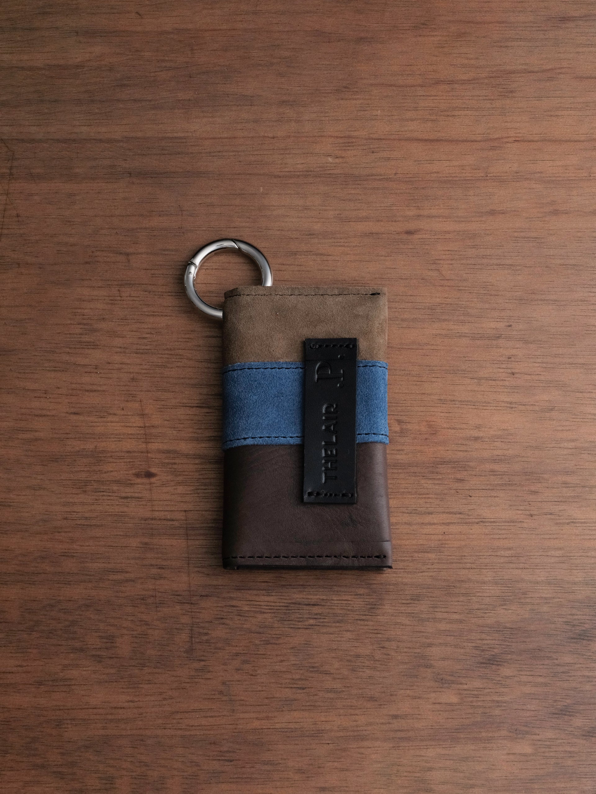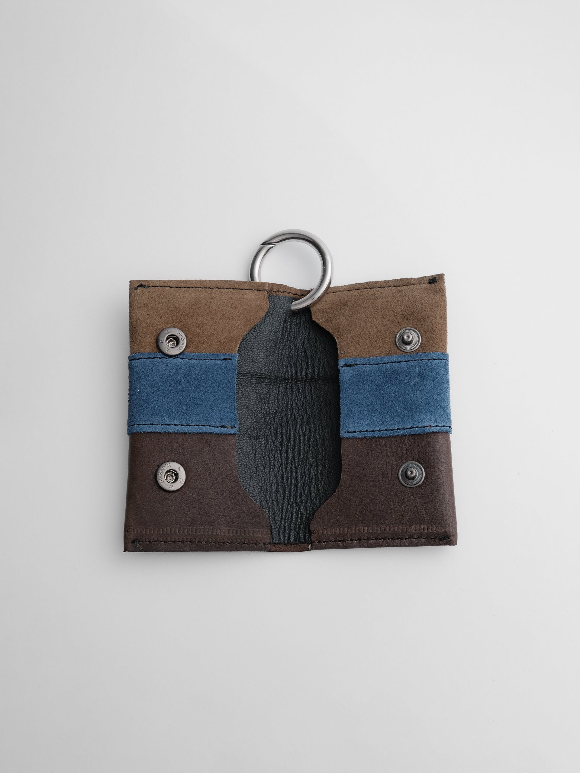 The Gwen Wallet Patchwork edition transforms a simple cardholder into a small act of collage - panels of leather and suede in moody tones of blue, brown, black, and red cut and pieced together into unique arrangements. Finished with a pierced O-ring at the corner, no two are alike.