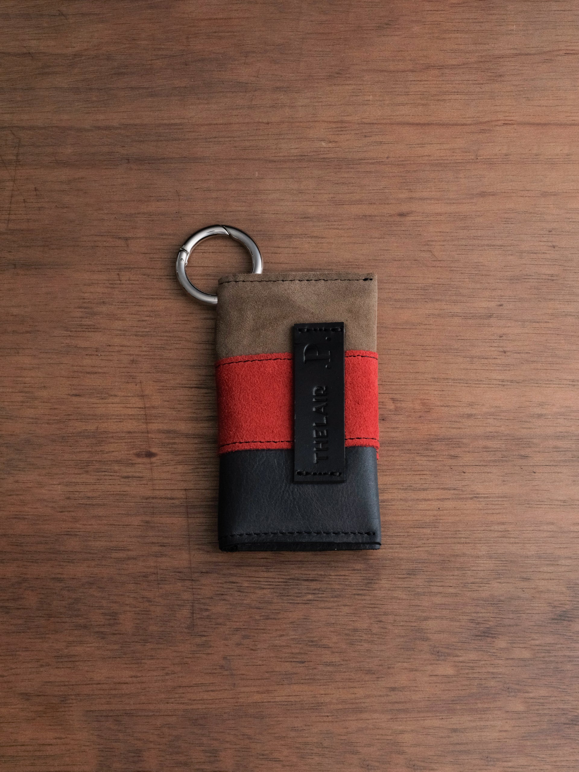 The Gwen Wallet Patchwork edition transforms a simple cardholder into a small act of collage - panels of leather and suede in moody tones of blue, brown, black, and red cut and pieced together into unique arrangements. Finished with a pierced O-ring at the corner, no two are alike.