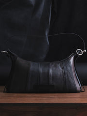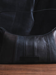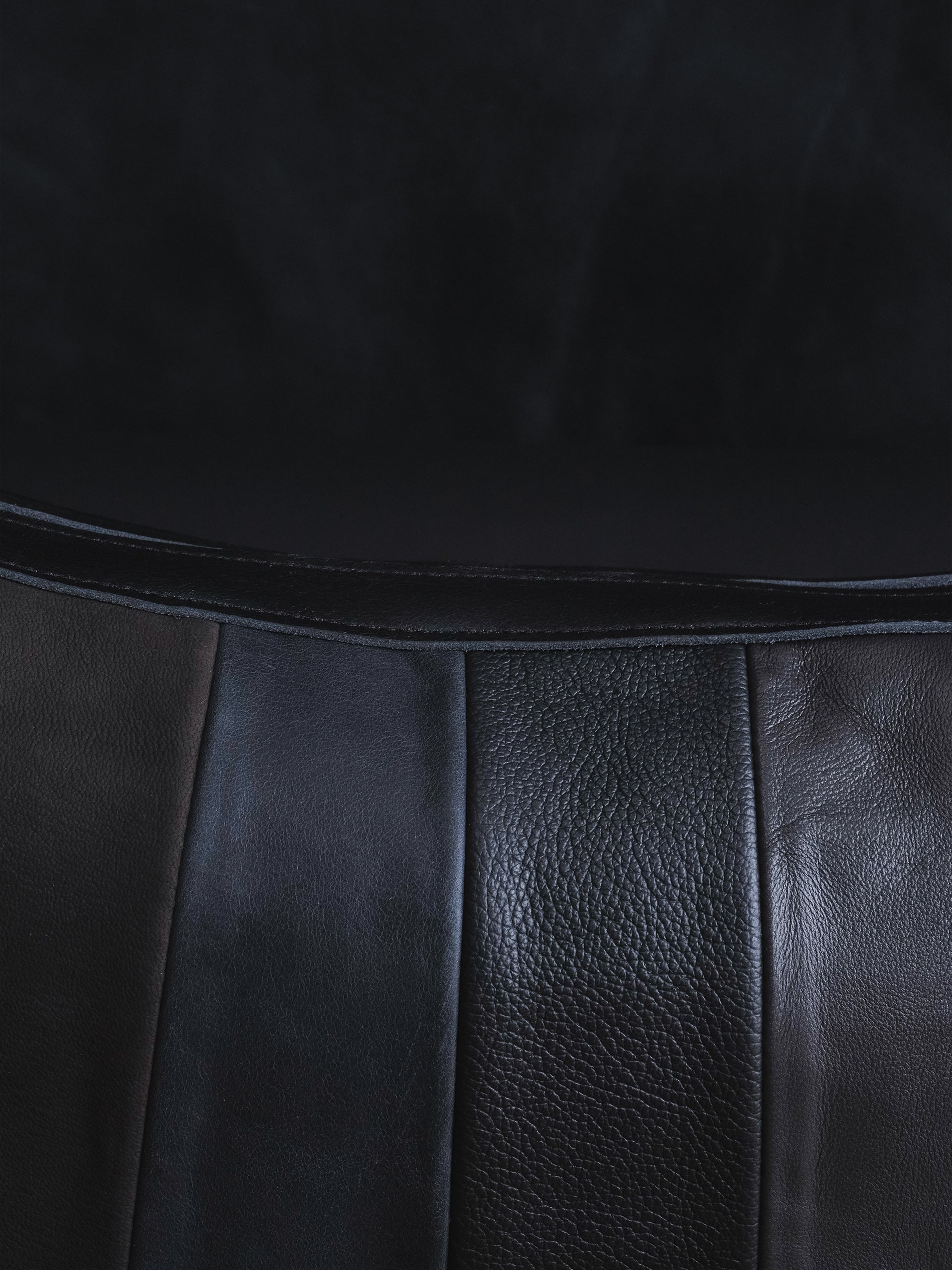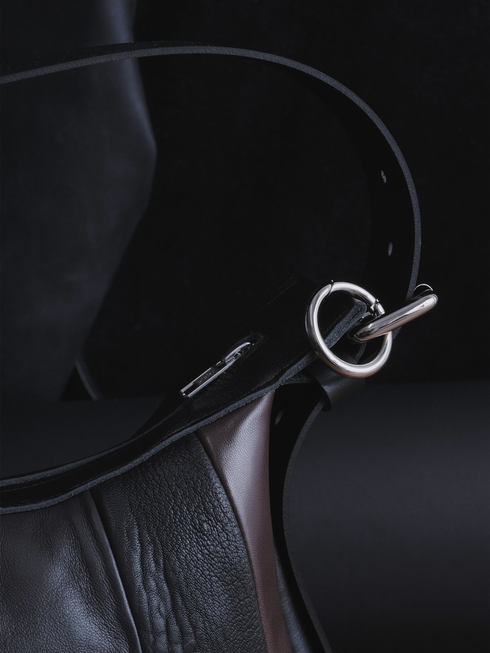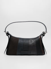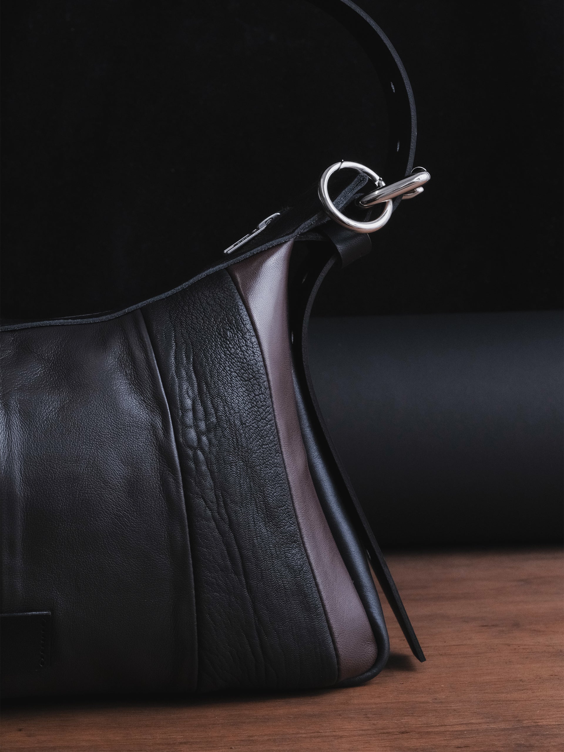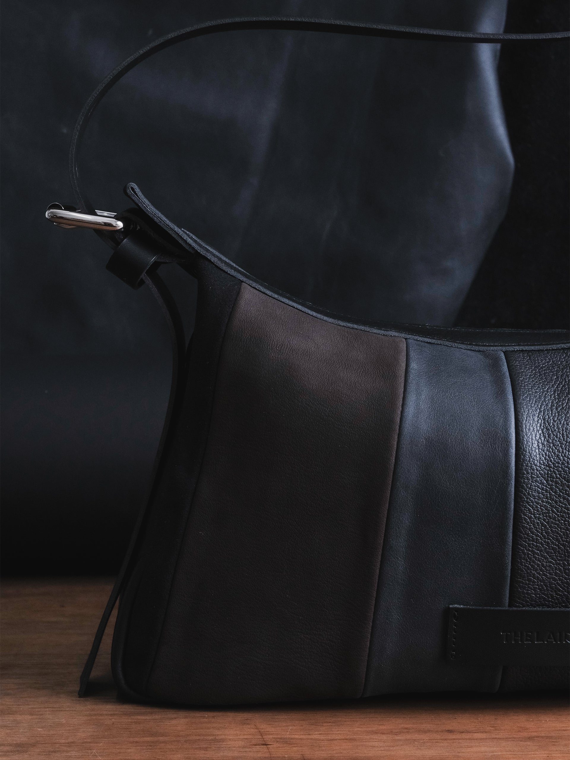 Designed and handcrafted in The Lair Studio, Newcastle, the Gwen Collage Handbag is a structured trapezoidal silhouette in Italian leather and suede. Its vertical collaged front panel is a one-off composition - strips of leather and suede in moody shades of blue, brown, black, and red, arranged as an intentional study in colour. Each palette is unique, created to either mirror the wearer’s mood or set it in motion. The reverse, cut in solid black leather, provides contrast and grounding. A chunky adjustable strap with dual buckle detailing at each side anchors the form, while a three-dimensional leather tag on the front carries The Lair and PIECES insignia. The interior holds an extra internal slip pocket and an external zip pocket on the back, balancing minimal design with daily function. A chunky split ring allows clasping any add-ons with ease, such as your phone, wallet or drinkbottle - an everyday piece elevated by collage.