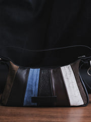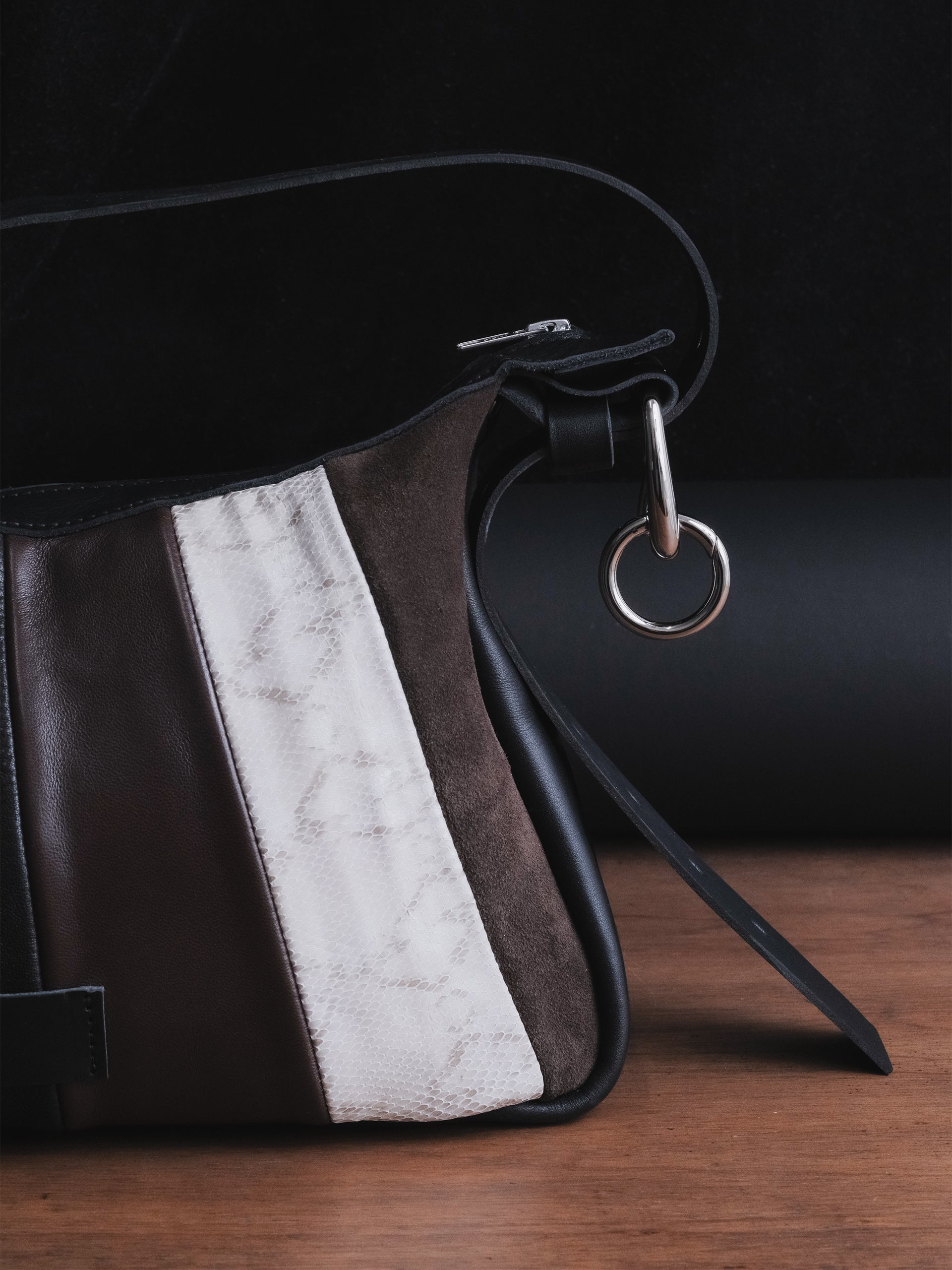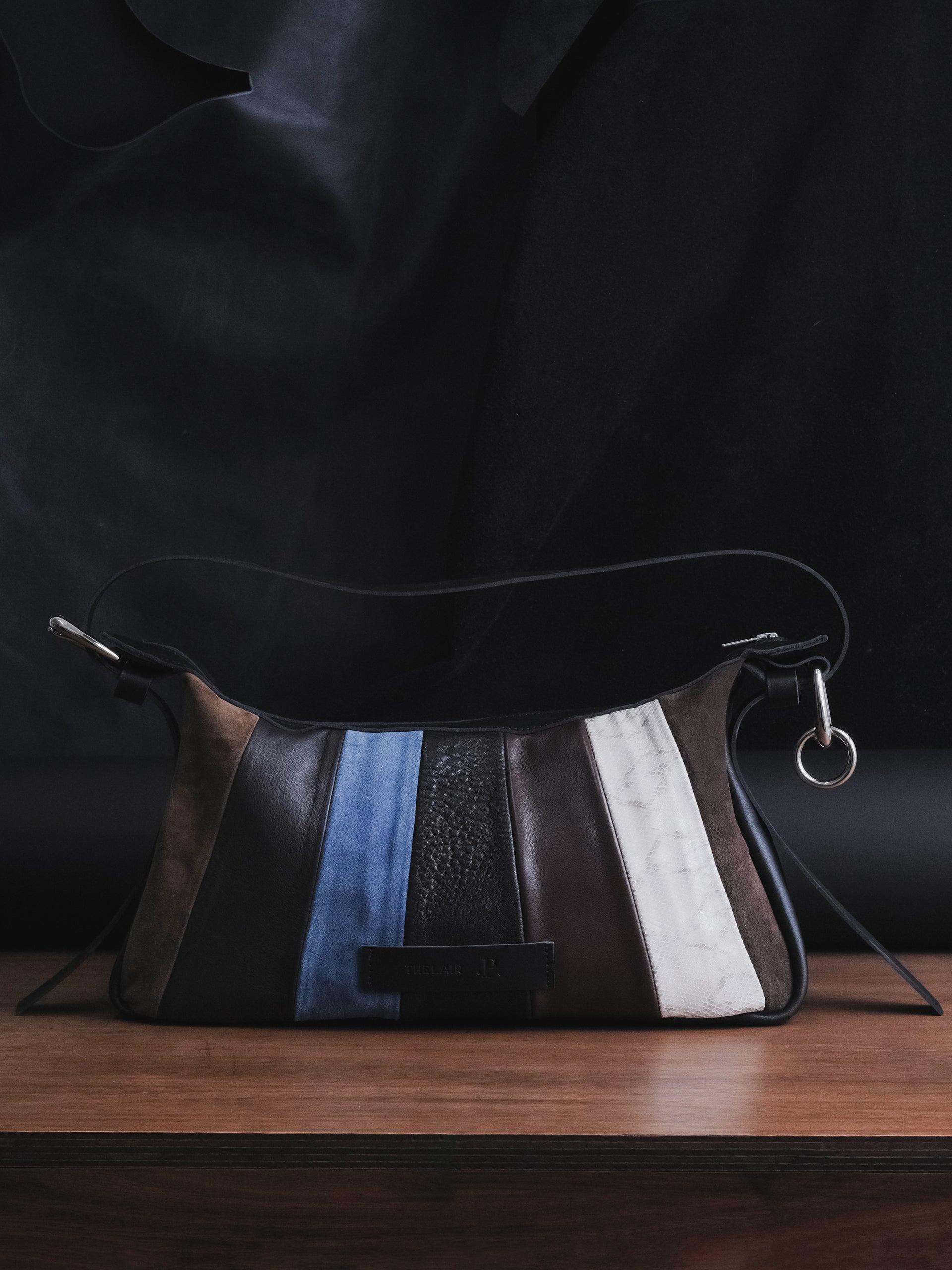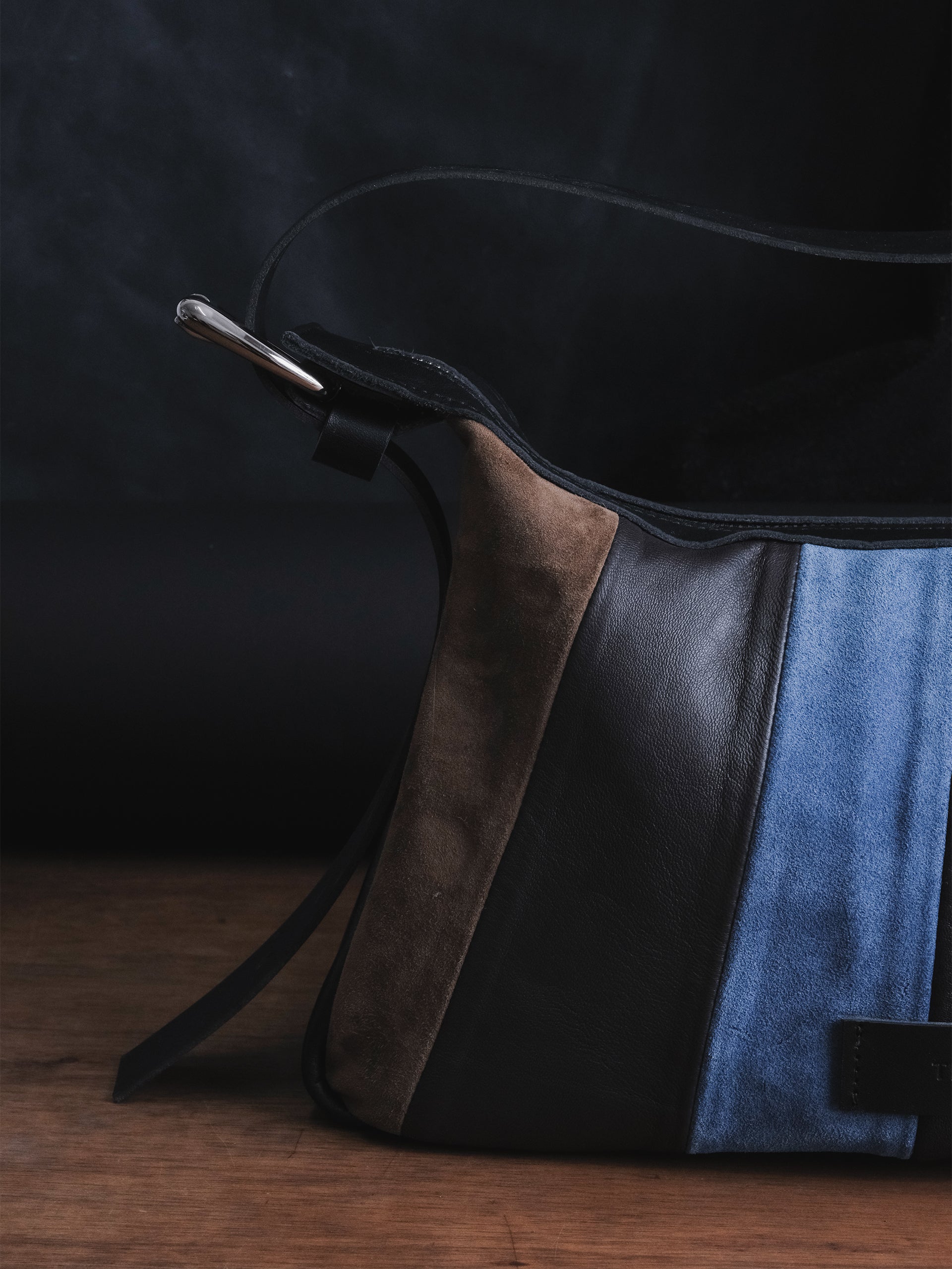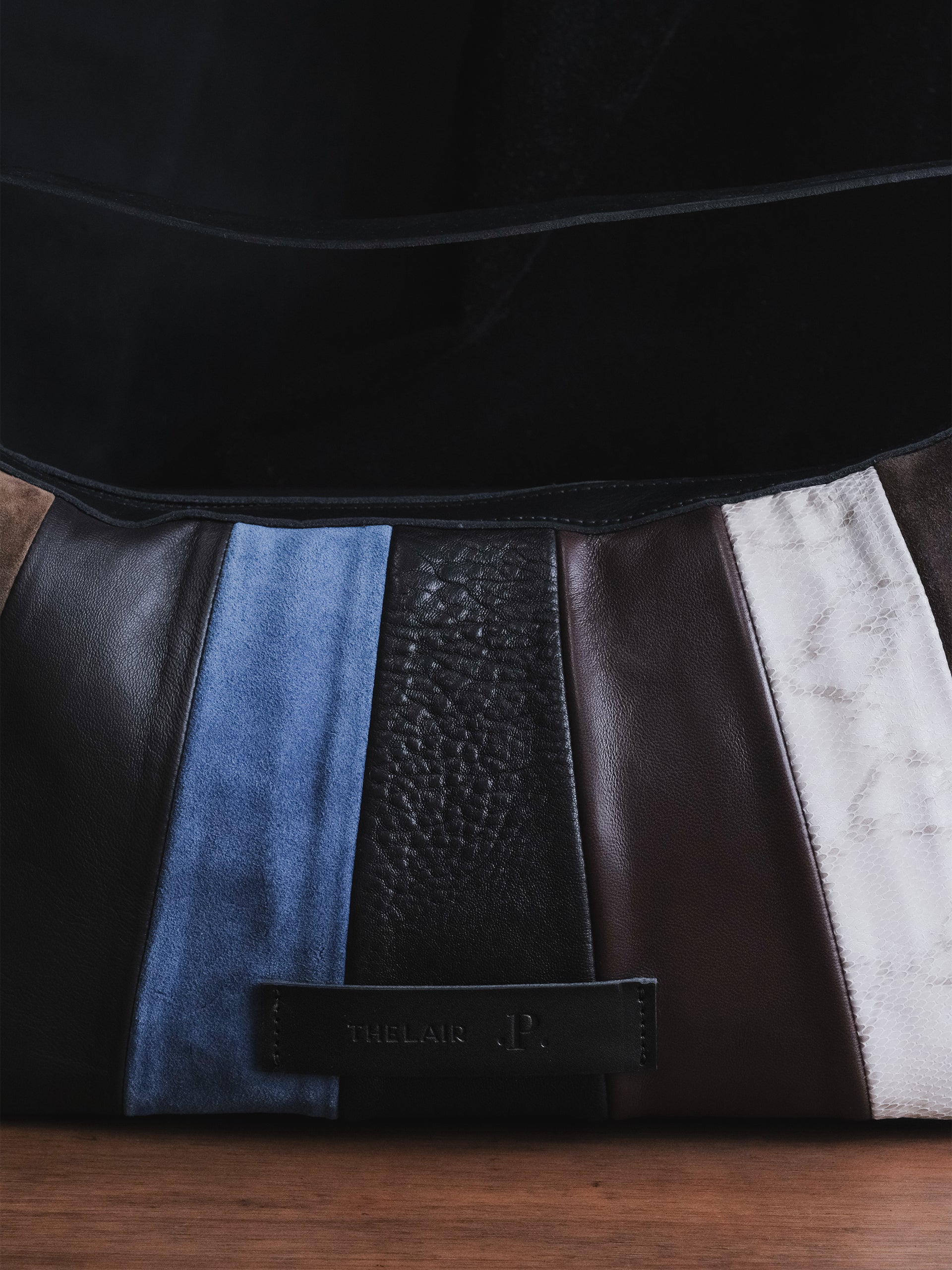 Designed and handcrafted in The Lair Studio, Newcastle, the Gwen Collage Handbag is a structured trapezoidal silhouette in Italian leather and suede. Its vertical collaged front panel is a one-off composition - strips of leather and suede in moody shades of blue, brown, black, and red, arranged as an intentional study in colour. Each palette is unique, created to either mirror the wearer’s mood or set it in motion. The reverse, cut in solid black leather, provides contrast and grounding. A chunky adjustable strap with dual buckle detailing at each side anchors the form, while a three-dimensional leather tag on the front carries The Lair and PIECES insignia. The interior holds an extra internal slip pocket and an external zip pocket on the back, balancing minimal design with daily function. A chunky split ring allows clasping any add-ons with ease, such as your phone, wallet or drinkbottle - an everyday piece elevated by collage.