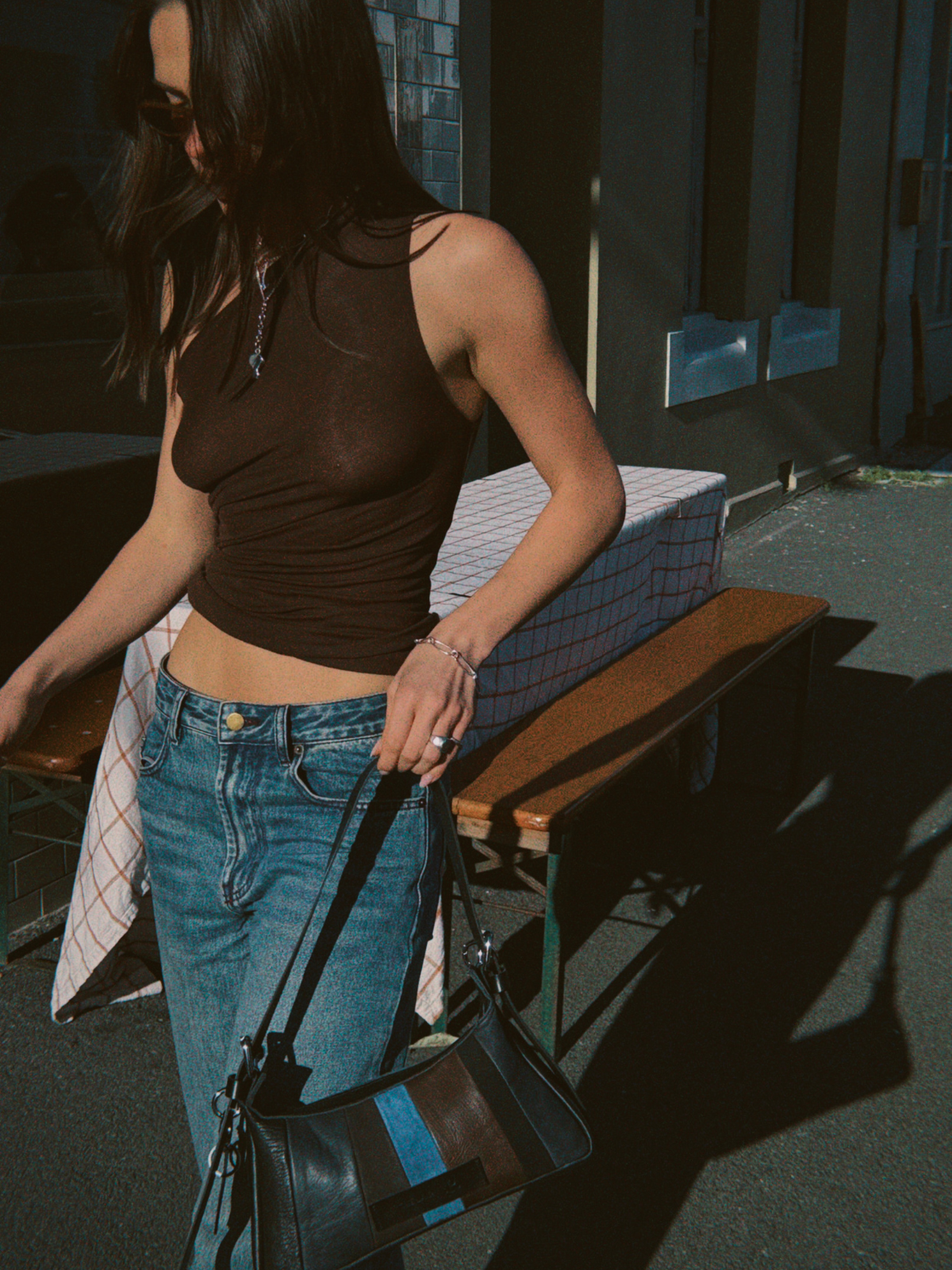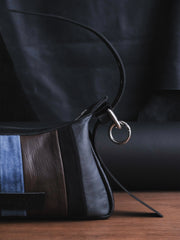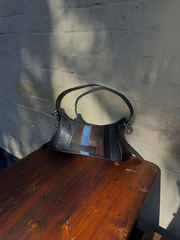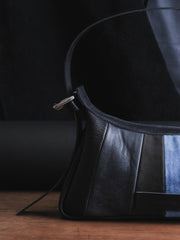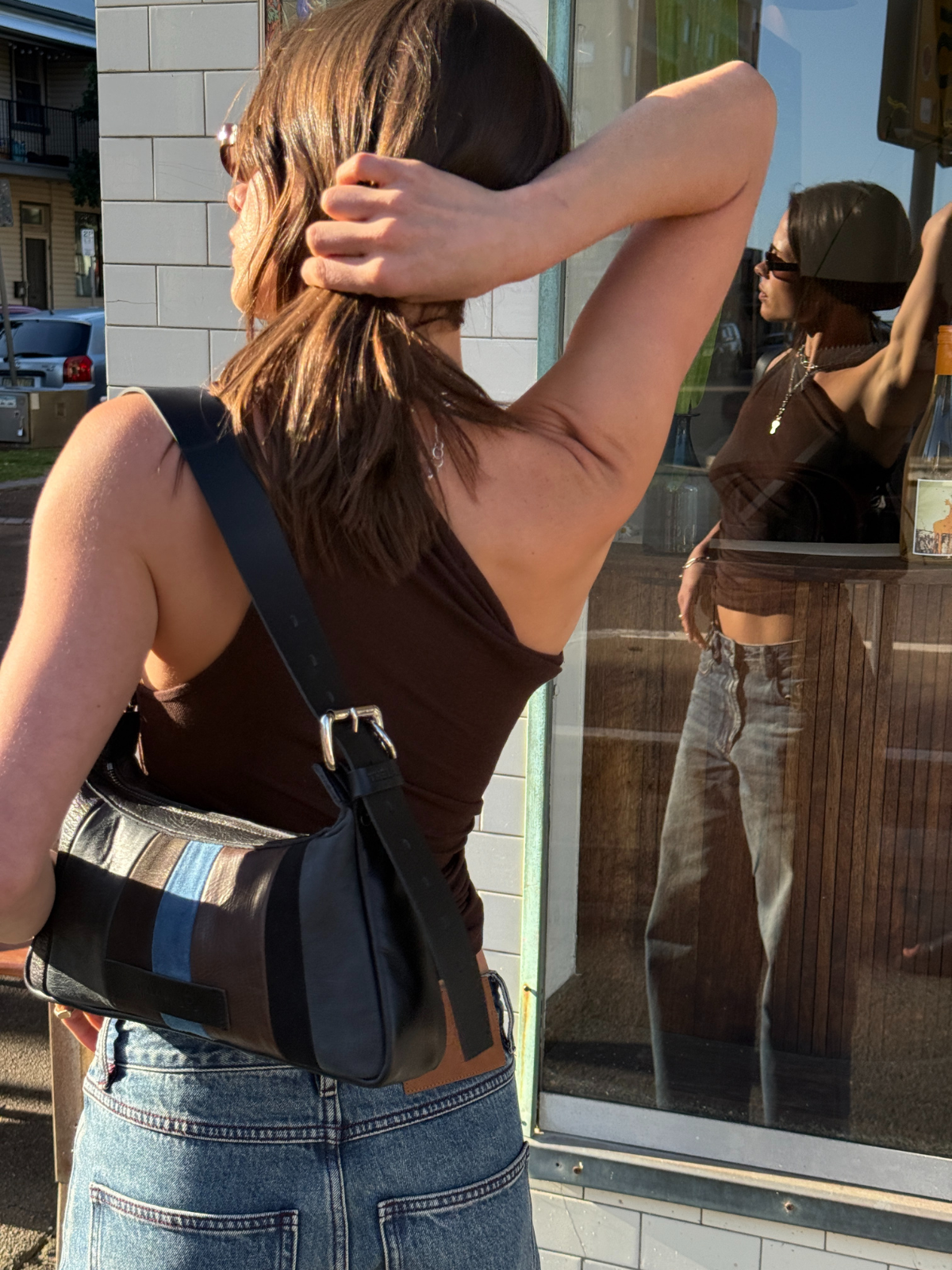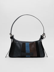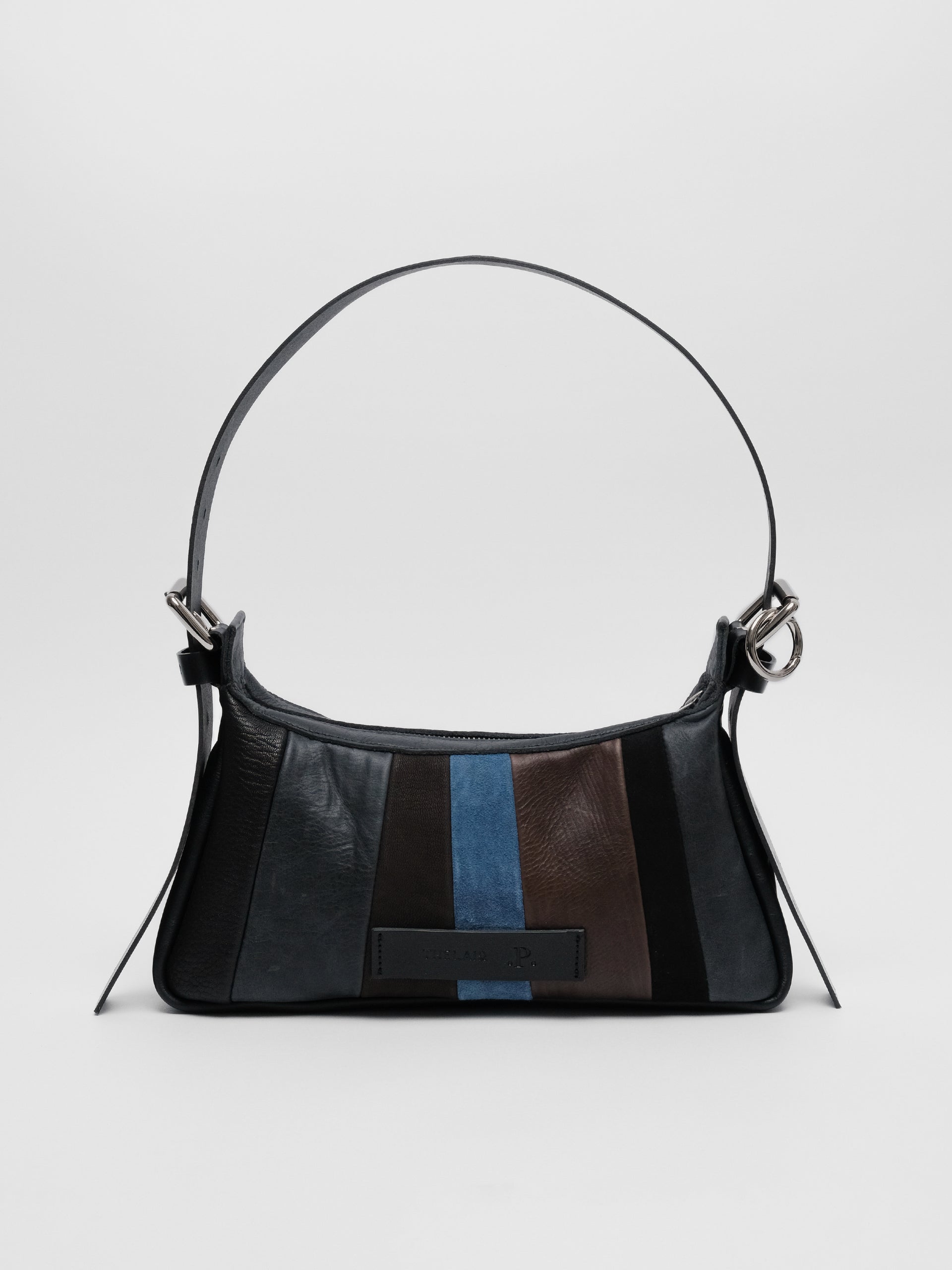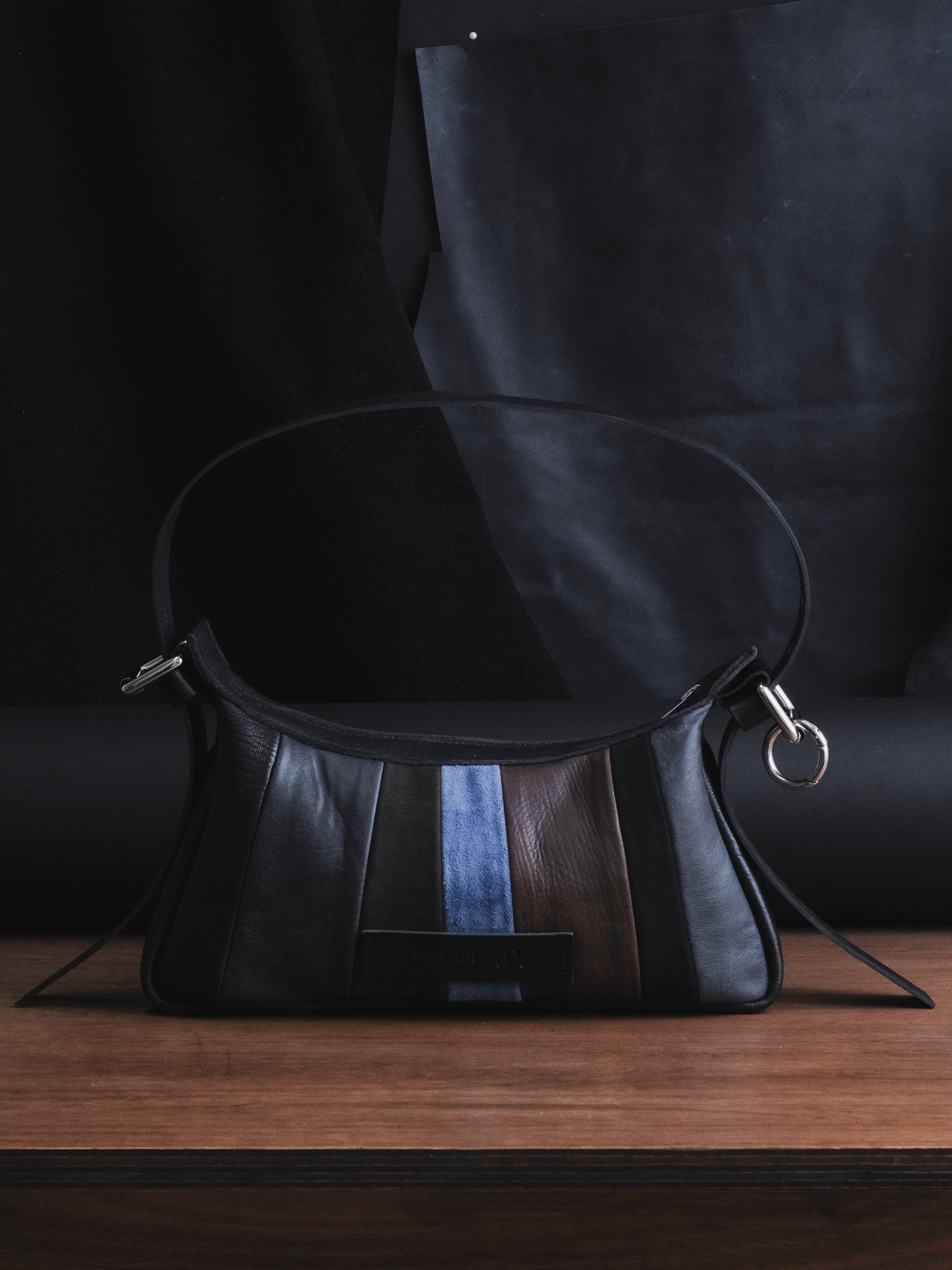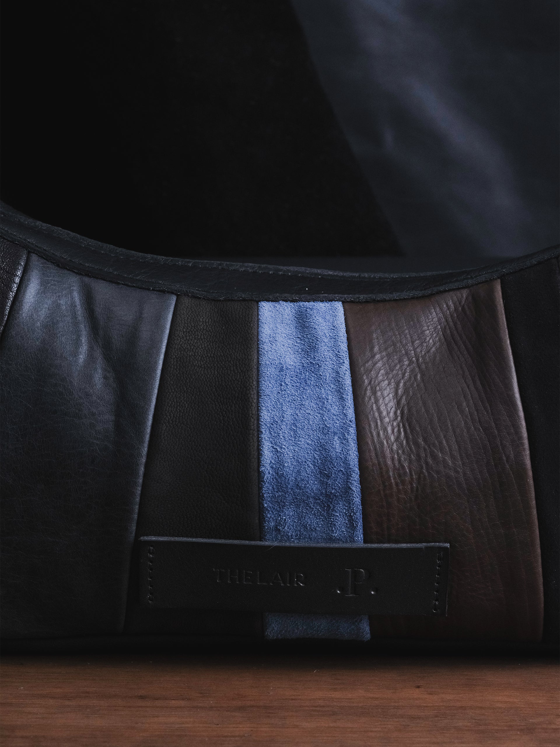 Designed and handcrafted in The Lair Studio, Newcastle, the Gwen Collage Handbag is a structured trapezoidal silhouette in Italian leather and suede. Its vertical collaged front panel is a one-off composition - strips of leather and suede in moody shades of blue, brown, black, and red, arranged as an intentional study in colour. Each palette is unique, created to either mirror the wearer’s mood or set it in motion. The reverse, cut in solid black leather, provides contrast and grounding. A chunky adjustable strap with dual buckle detailing at each side anchors the form, while a three-dimensional leather tag on the front carries The Lair and PIECES insignia. The interior holds an extra internal slip pocket and an external zip pocket on the back, balancing minimal design with daily function. A chunky split ring allows clasping any add-ons with ease, such as your phone, wallet or drinkbottle - an everyday piece elevated by collage.