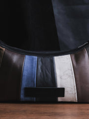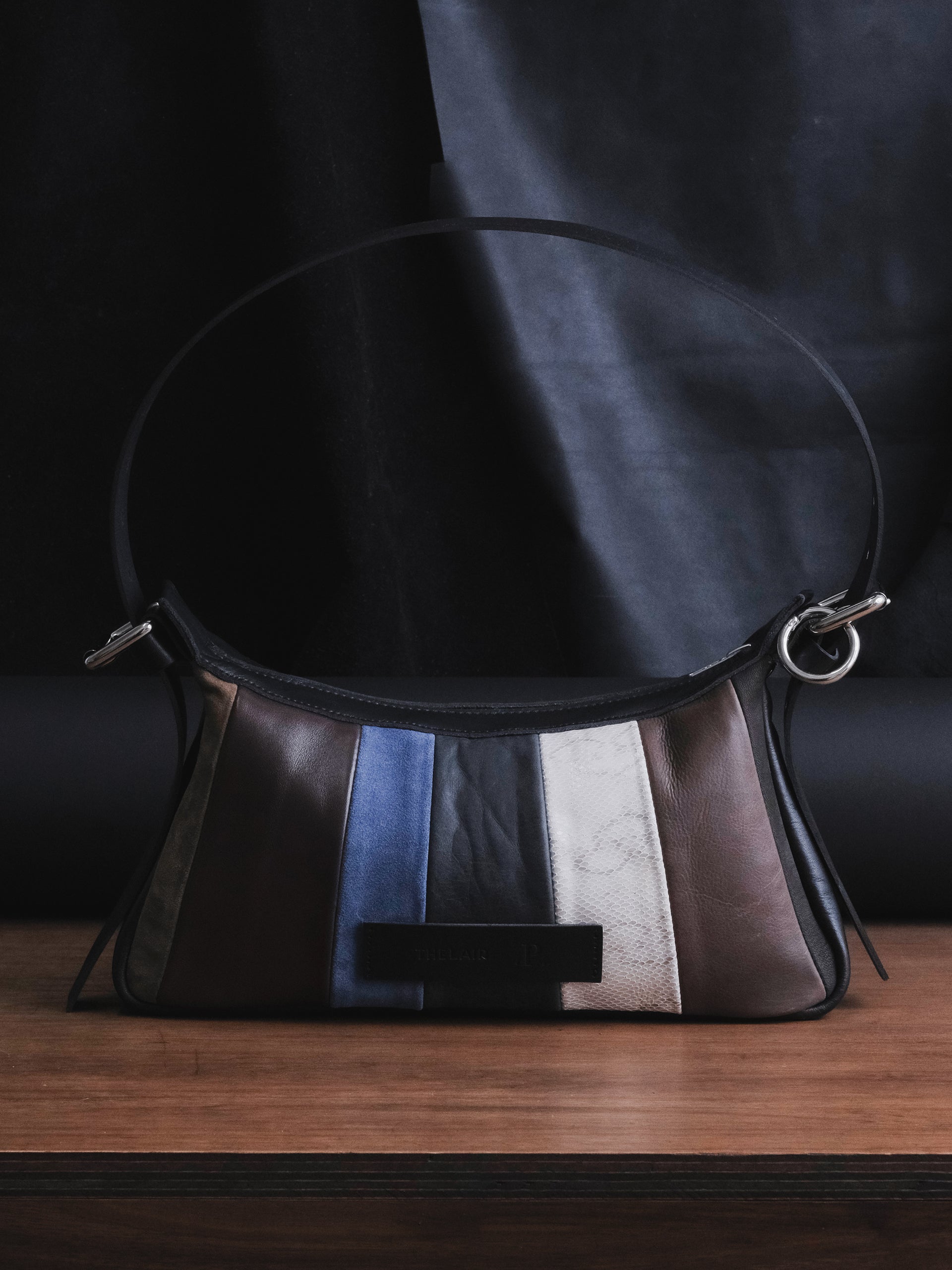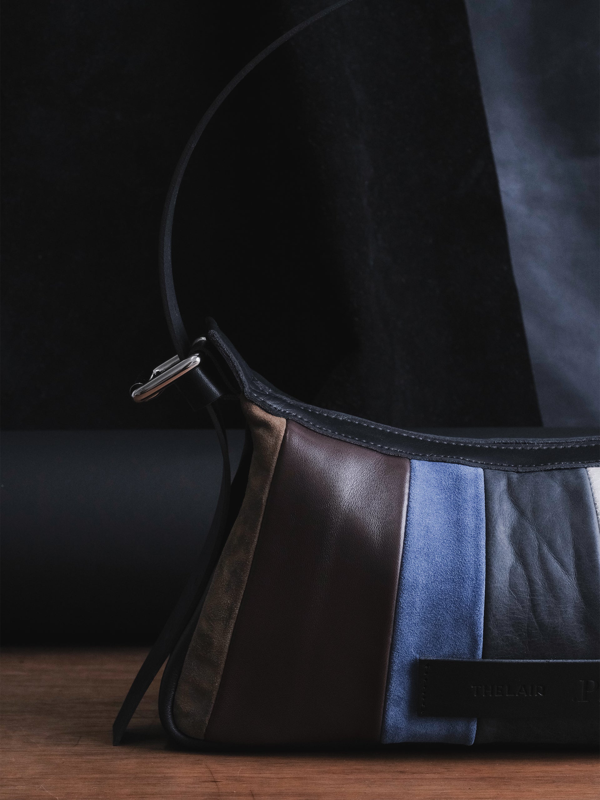 Designed and handcrafted in The Lair Studio, Newcastle, the Gwen Collage Handbag is a structured trapezoidal silhouette in Italian leather and suede. Its vertical collaged front panel is a one-off composition - strips of leather and suede in moody shades of blue, brown, black, and red, arranged as an intentional study in colour. Each palette is unique, created to either mirror the wearer’s mood or set it in motion. The reverse, cut in solid black leather, provides contrast and grounding. A chunky adjustable strap with dual buckle detailing at each side anchors the form, while a three-dimensional leather tag on the front carries The Lair and PIECES insignia. The interior holds an extra internal slip pocket and an external zip pocket on the back, balancing minimal design with daily function. A chunky split ring allows clasping any add-ons with ease, such as your phone, wallet or drinkbottle - an everyday piece elevated by collage.