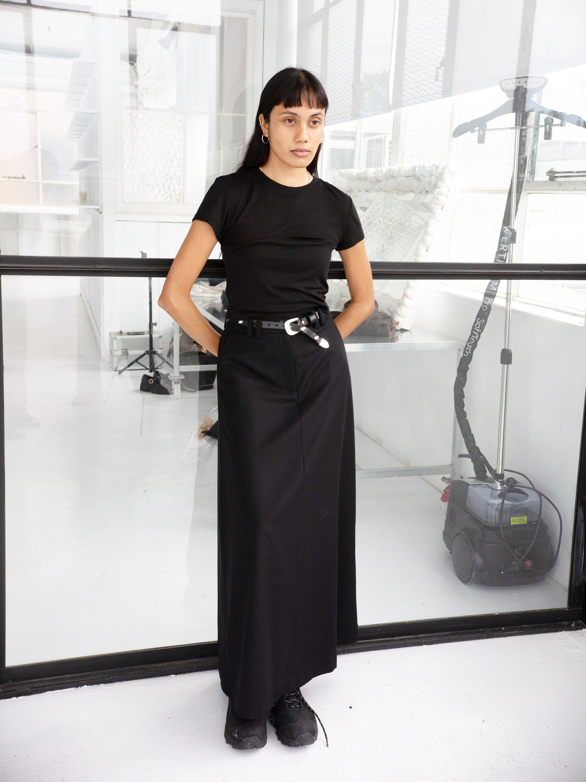 The Margot Skirt is our take on a classic woollen winter skirt. This attention-seeking A-line pattern boasts a spacious silhouette, (a strong stride will not be hindered) zip fly entry, and our double belt loop feature carried over from our favourite Otis trousers. Made from a premium, lightly textured 100% wool fabrication, Margot binds function and versatility, featuring front and back pockets, an ankle-grazing length, and belt loops, of course, to don your favourite TL Belt.