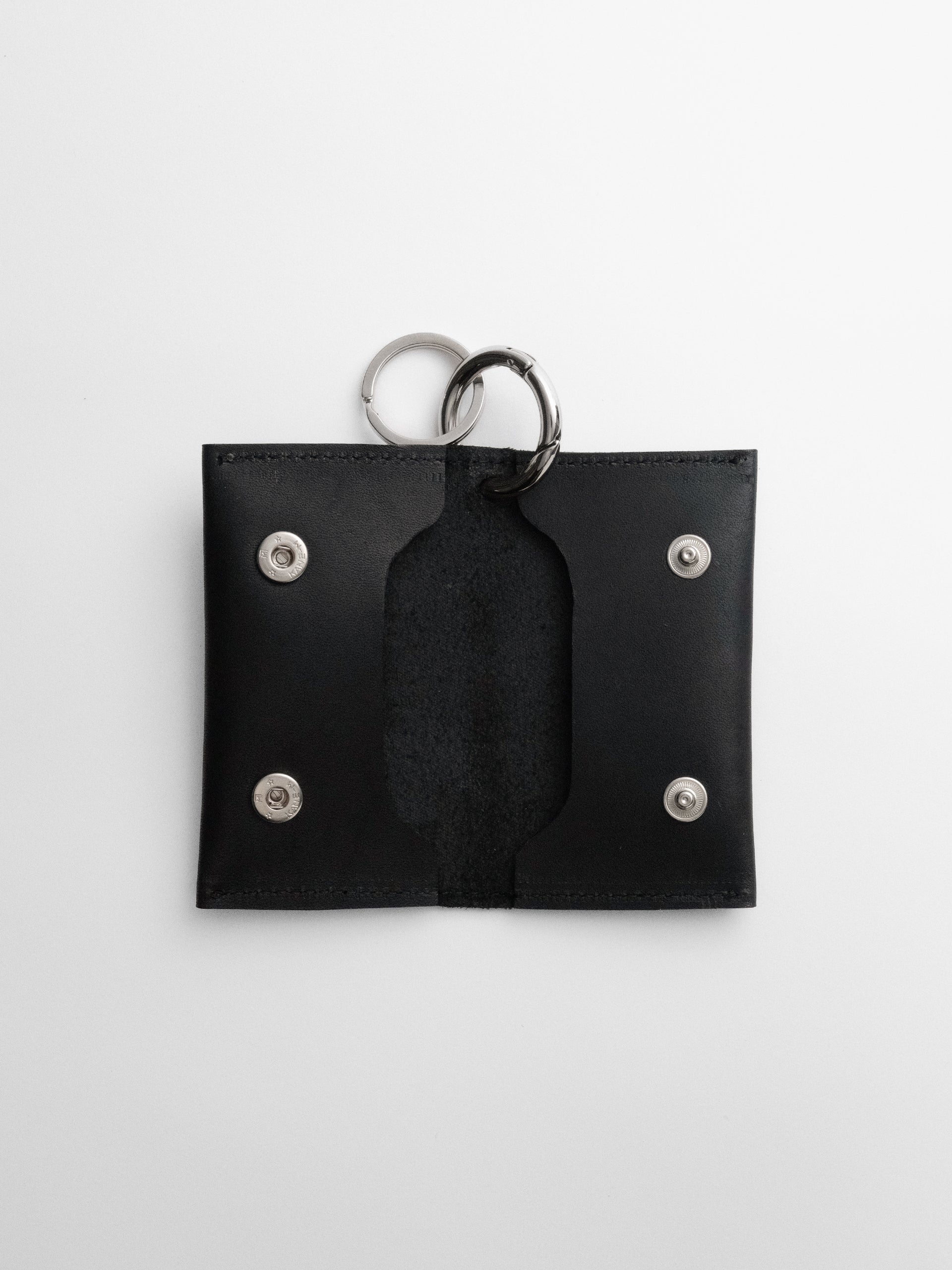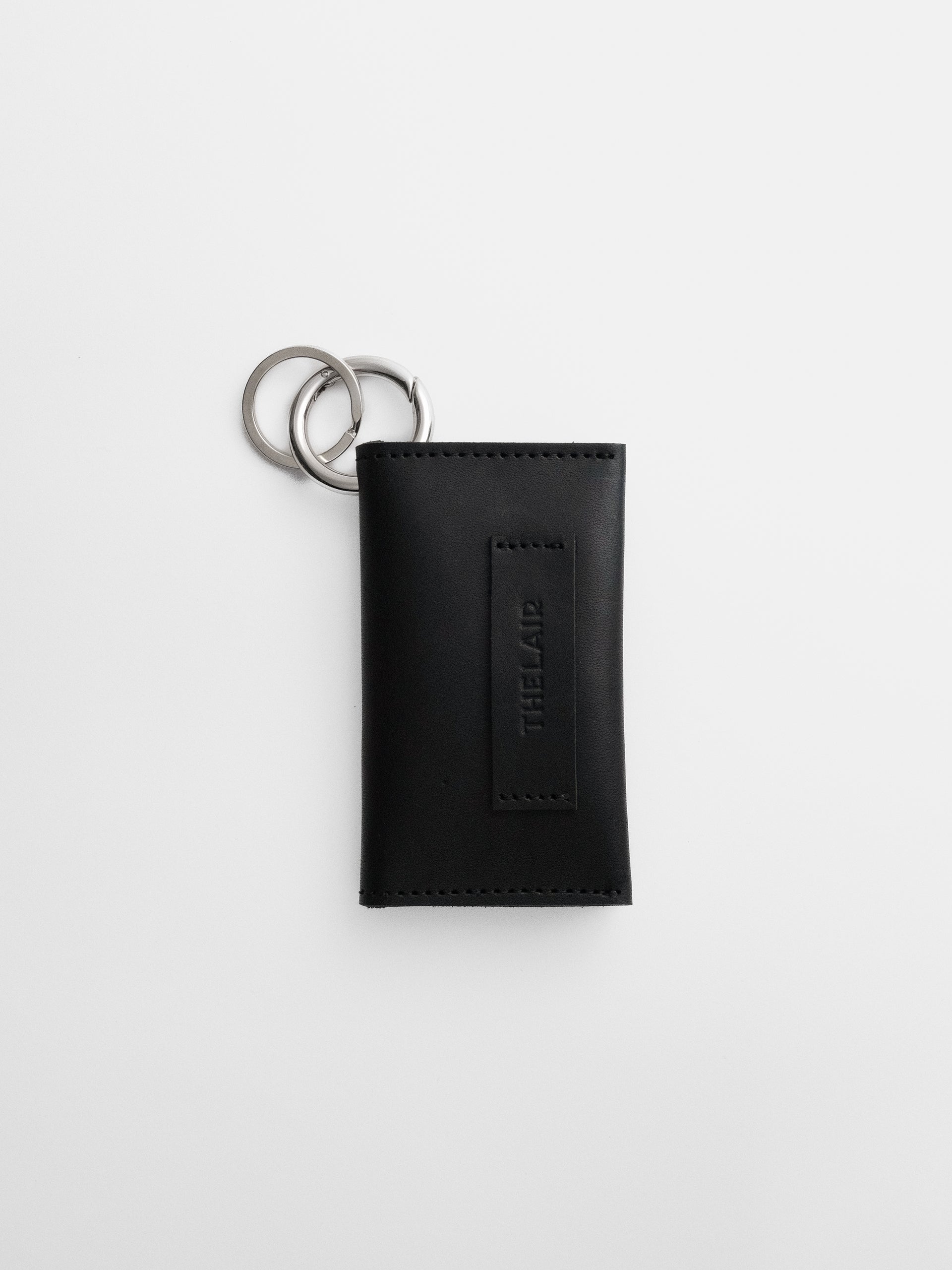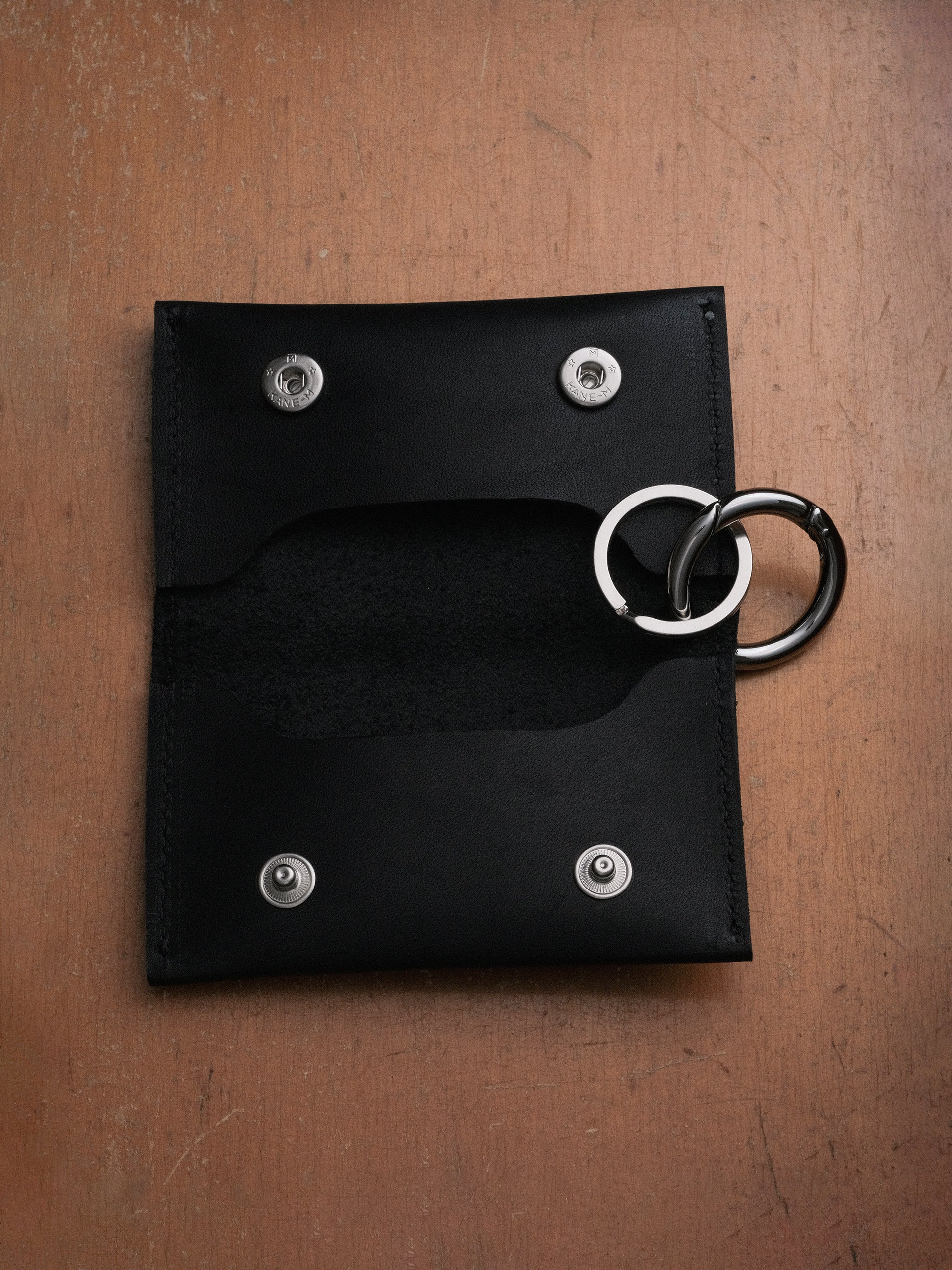 The Gwen Carholder is a small-format cardholder designed for pared-back use. Built from thick Italian leather, its simple interior holds two card compartments, while a pierced O-ring detail anchors the corner - a contrasting hardware accent that doubles as a clasp for attaching to bag, belt, or keys.