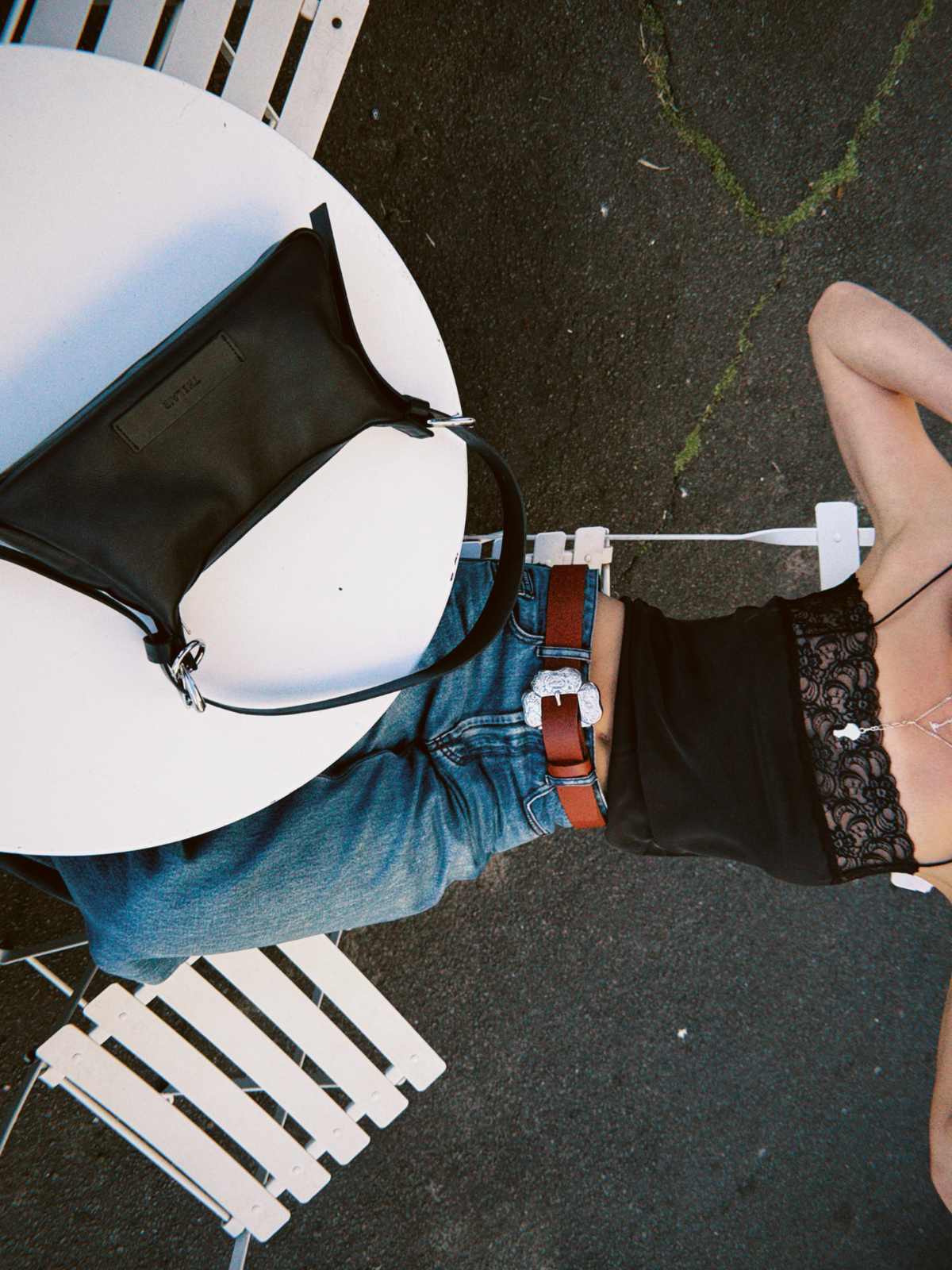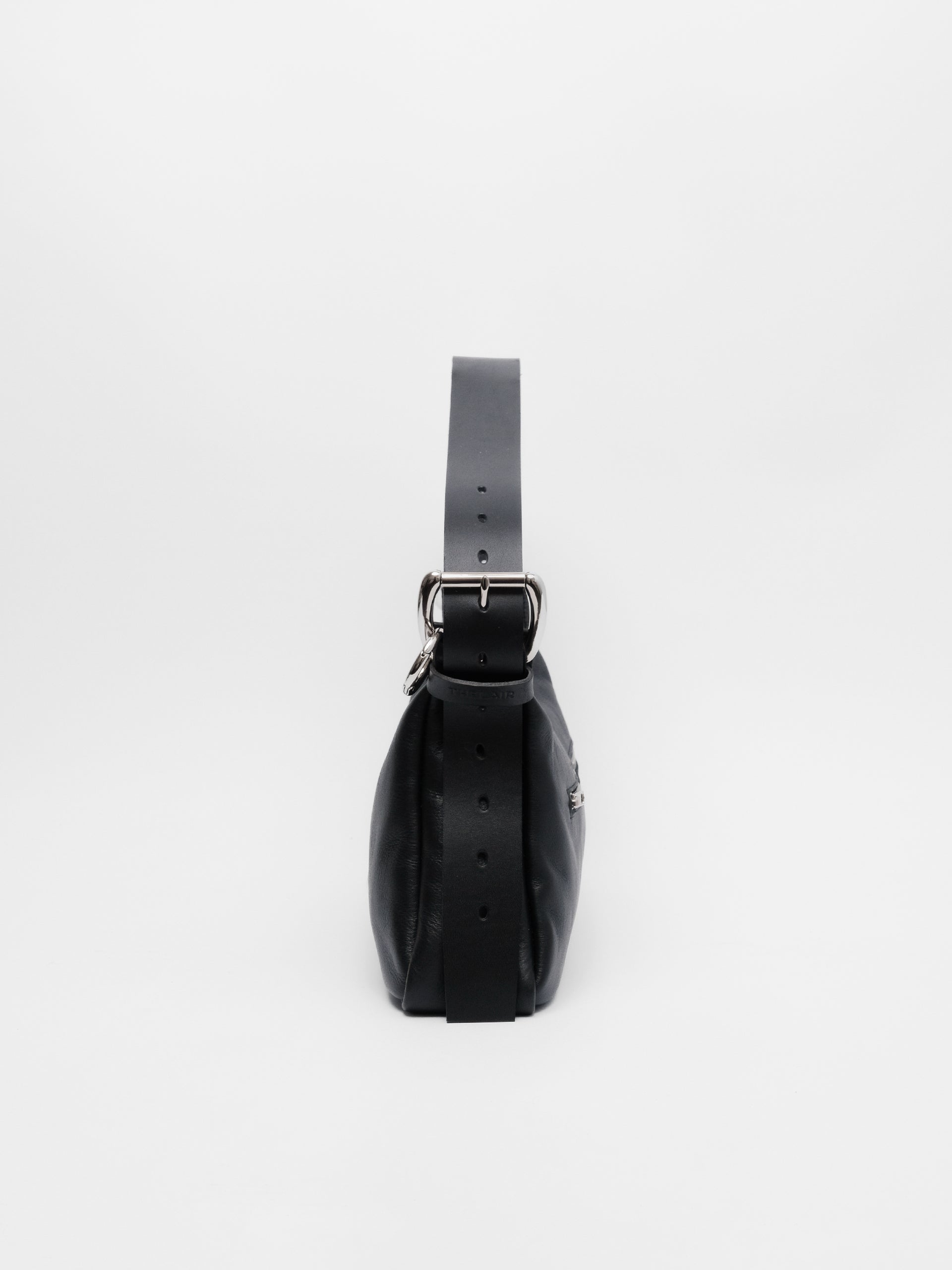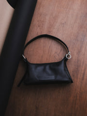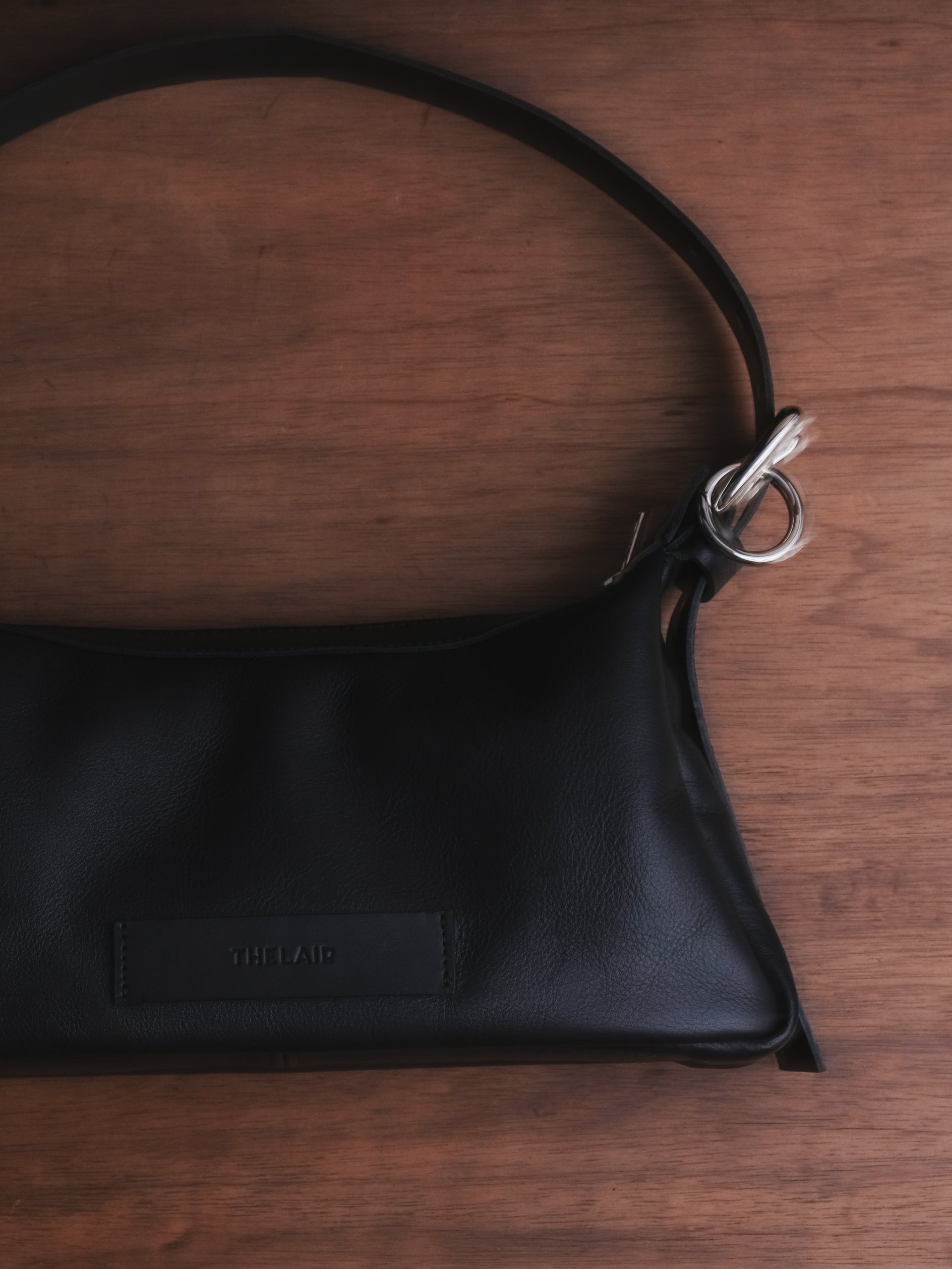 Designed and handcrafted in The Lair Studio, Newcastle, the Gwen Handbag is a structured trapezoidal silhouette, built from thick Italian leather and designed to sit neatly under the arm. A chunky adjustable strap, finished with dual buckle detailing at each side, anchors the form with weight and presence. On the front panel, a three-dimensional leather tag carries The Lair insignia, grounding the piece in identity. The interior offers a single spacious compartment, with an extra internal slip pocket, and an external zip pocket on the back, balancing minimal design with daily function. A chunky split ring allows clasping any add-ons with ease, such as your phone, wallet, or drink bottle.