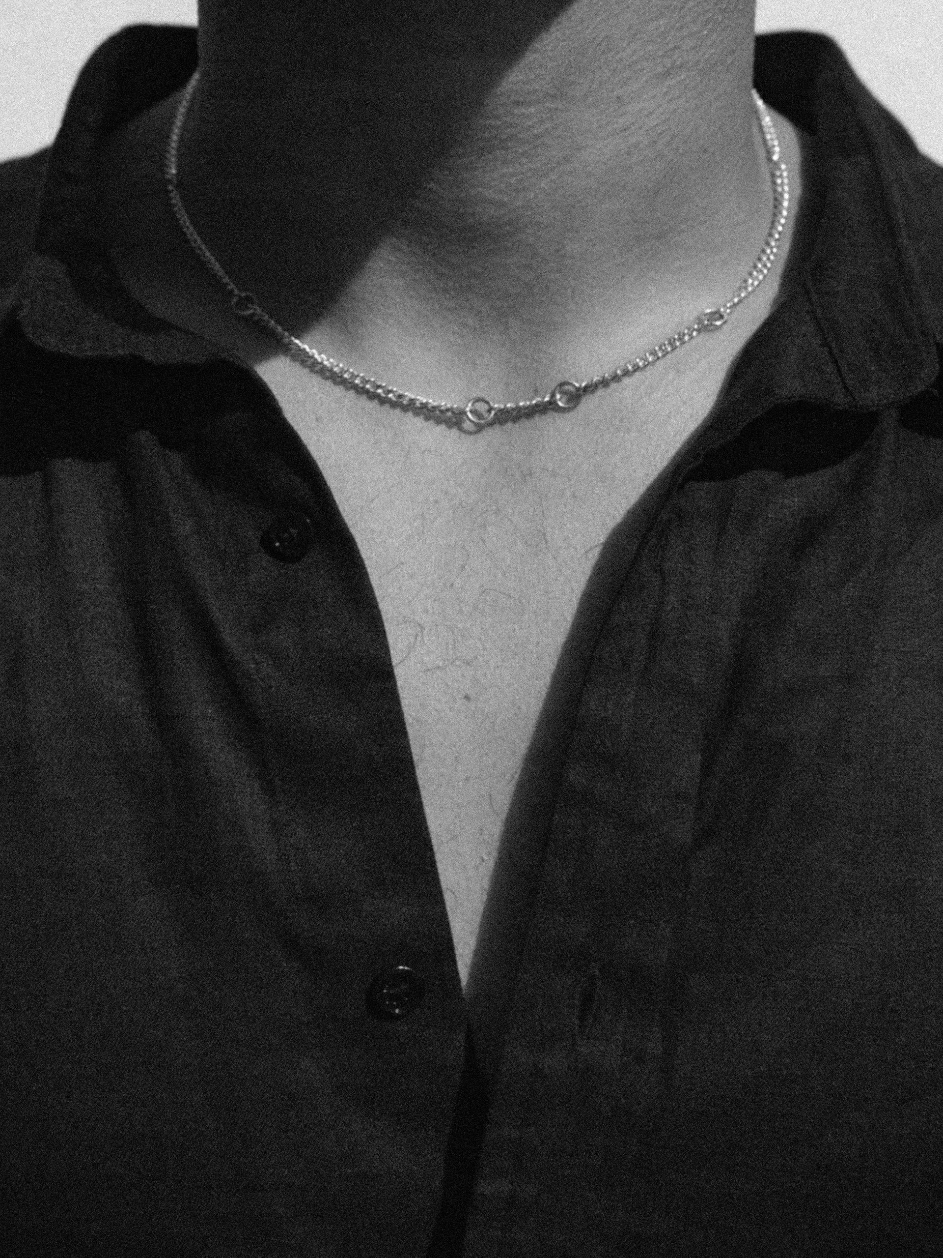 Japenese for speckle, 'Supekkuru' is designed in The Lairs neighbouring design studio. Handmade from .925 sterling silver, handcrafted silver rings are punctuated at irregular intervals contrasting a fine, classic curb chain. At the wearer's discretion, Supekkuru is designed to wear the clasp at the front, with a trail of chain falling down the chest.