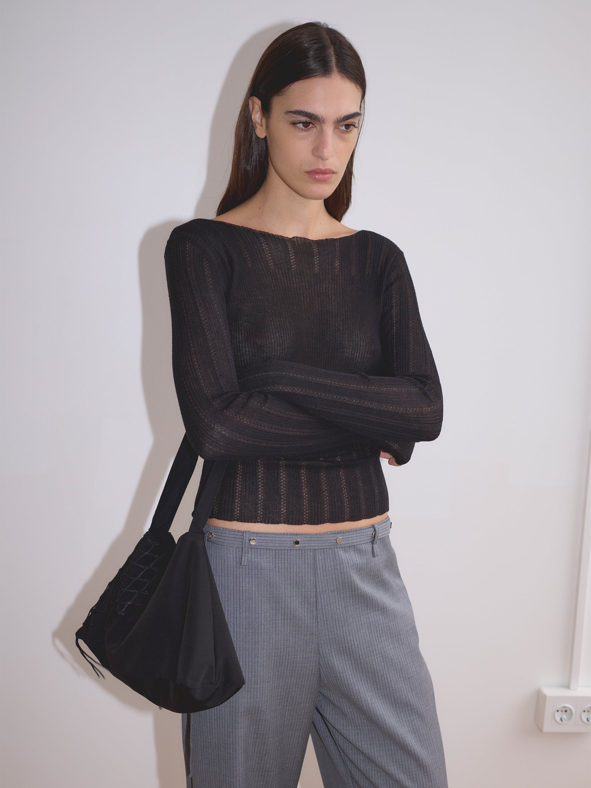 An elevated everyday carry, the Net Contrast Bag by Deiji Studios features a structured body with macramé contrast panel detailing. Designed with a fixed short strap and internal zip pocket for essentials.
