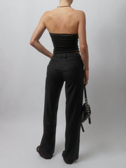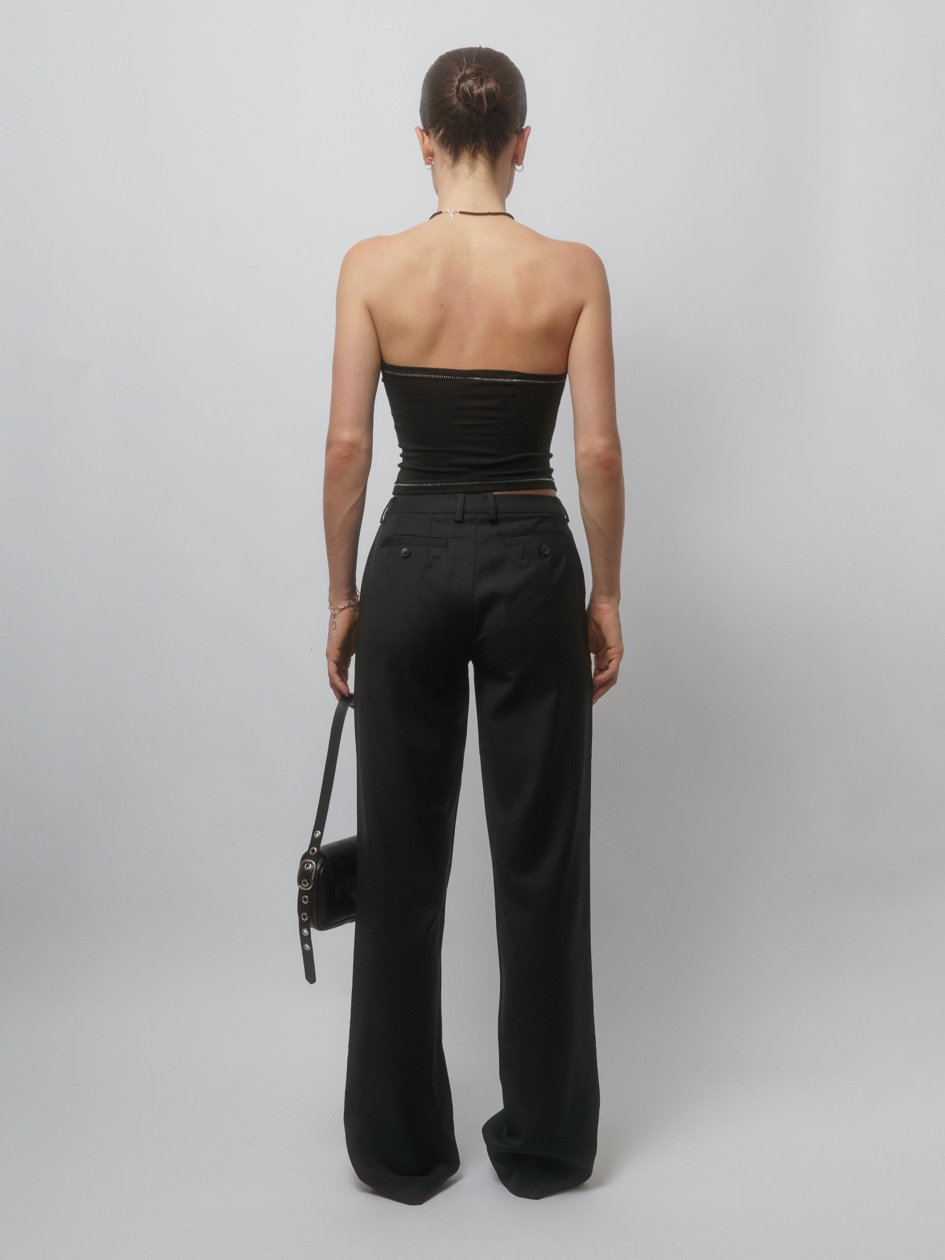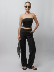 The Matilda Trouser is available in Black and Charcoal Pinstripe.