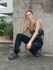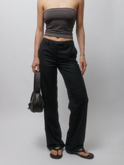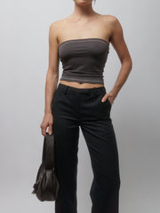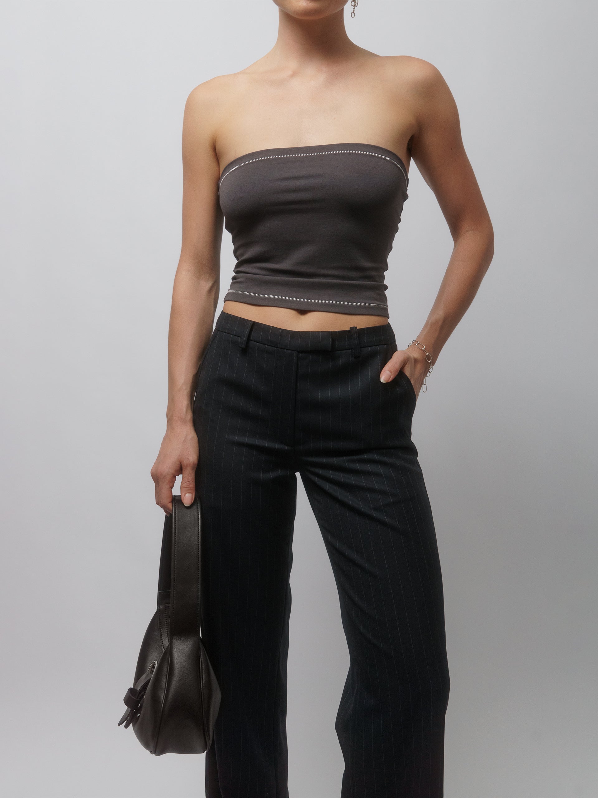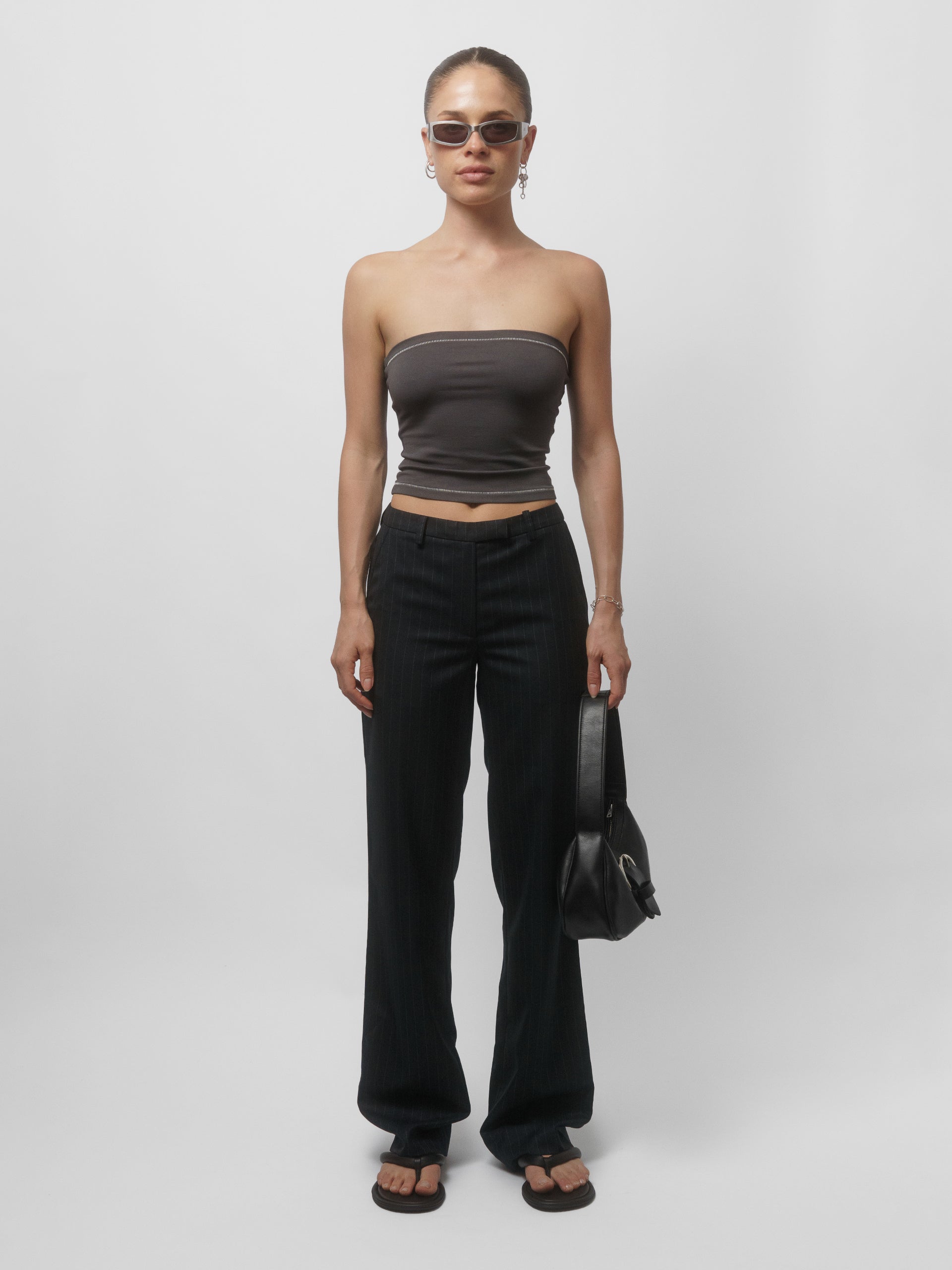 The Matilda Trouser is available in Black and Charcoal Pinstripe.