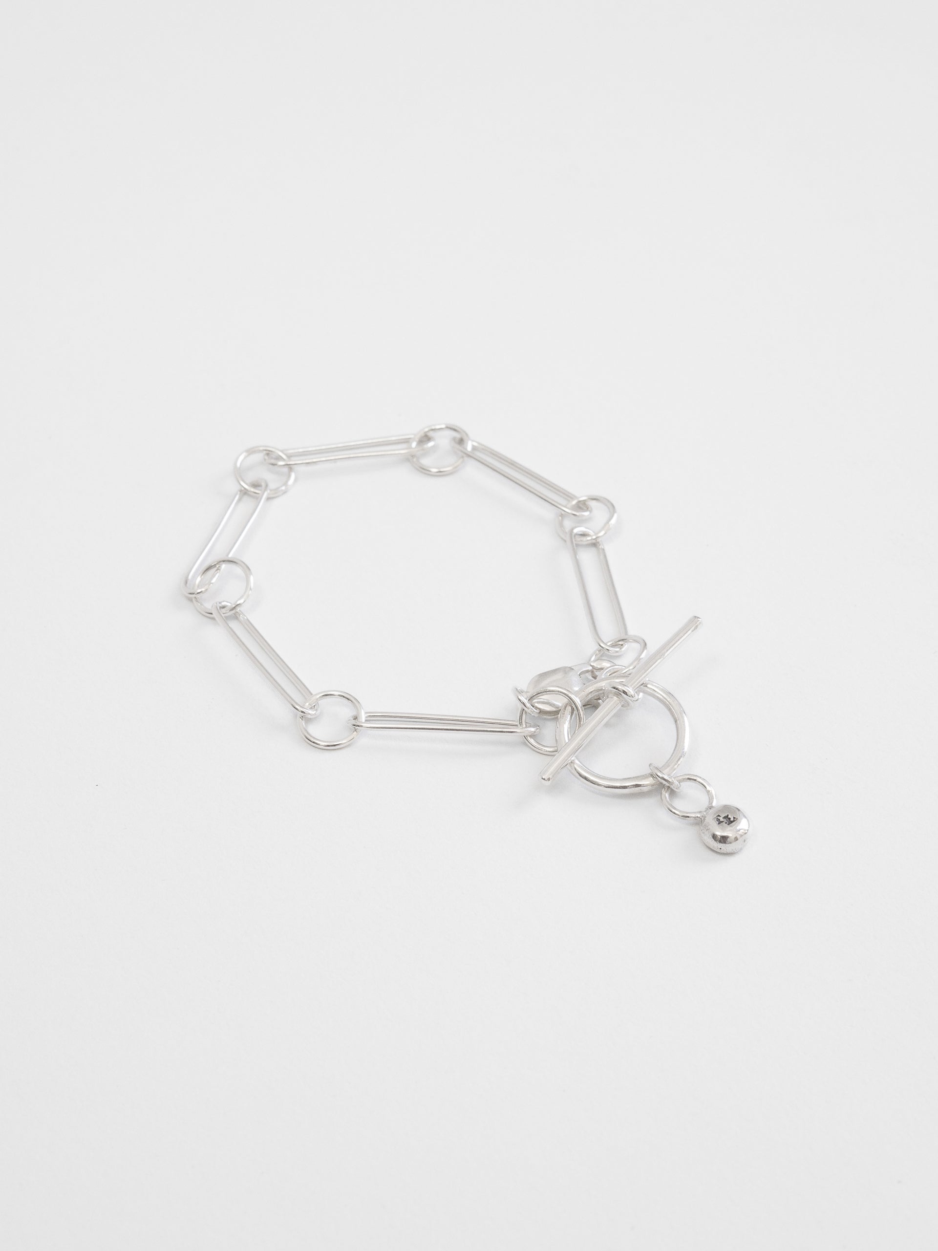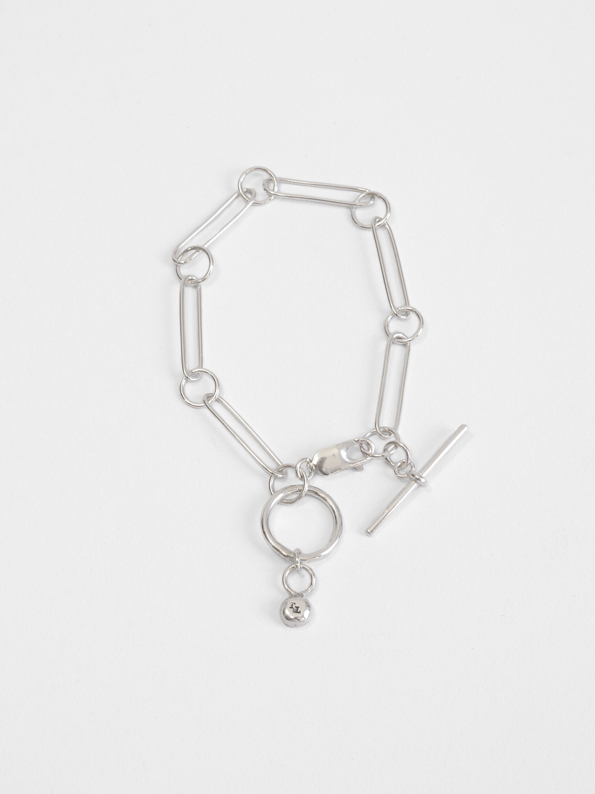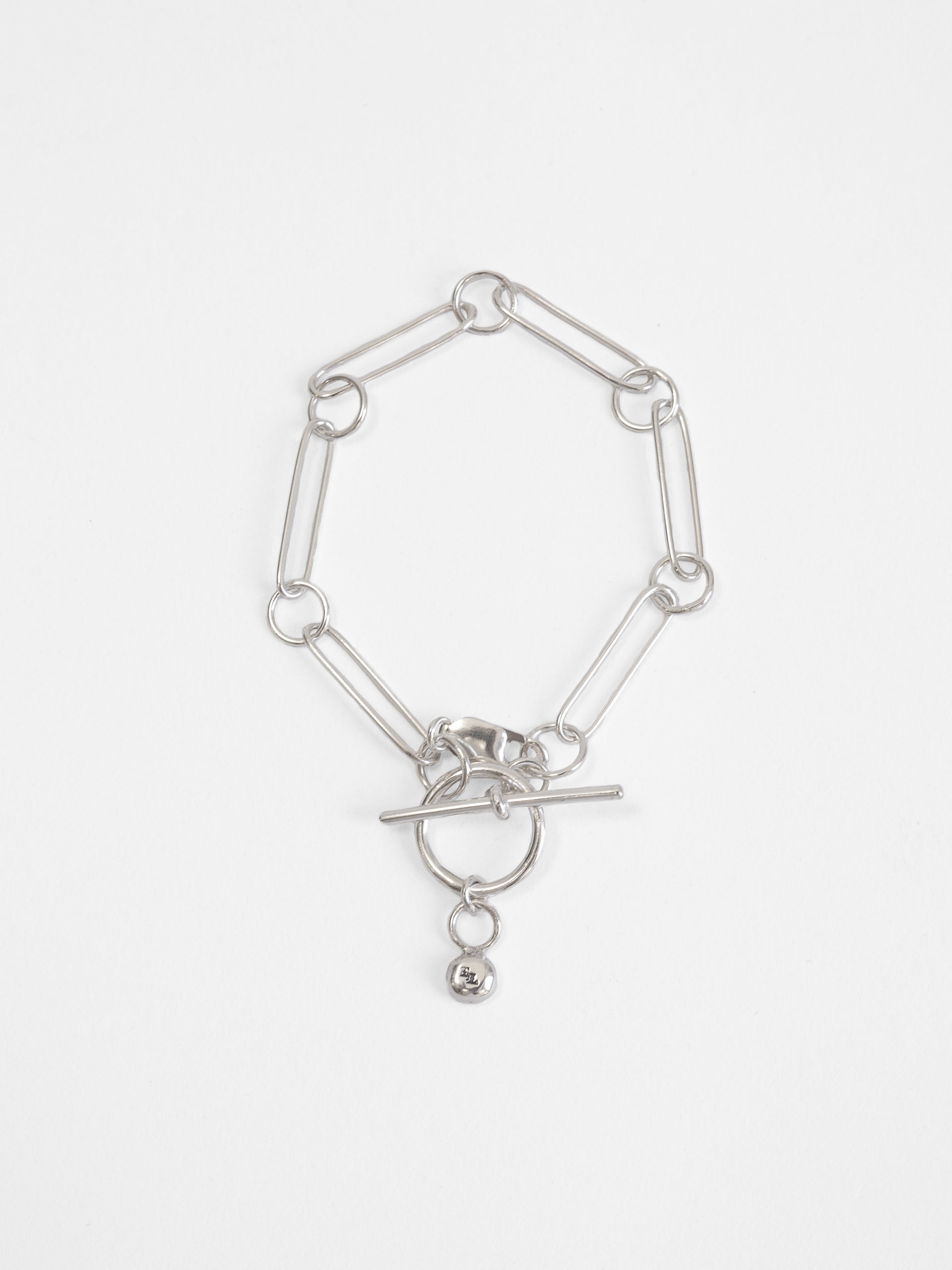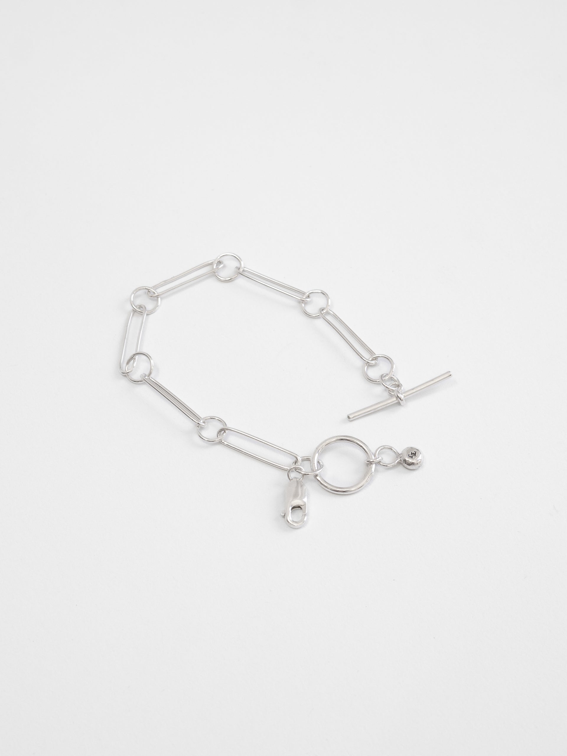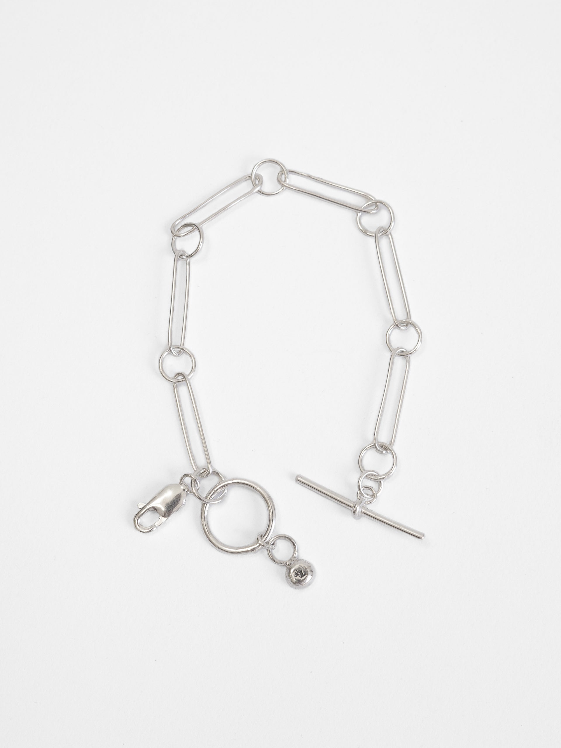Designed and built in its entirety in The Lair Studio, Newcastle, Camille is handmade from .925 sterling silver. Camille unifies subtly imperfect handmade silver pins with circle links for a contrasting, impactful effect. The wearer can loop Camille through itself, the piece finished with a handmade fob that acts as a clasp.
