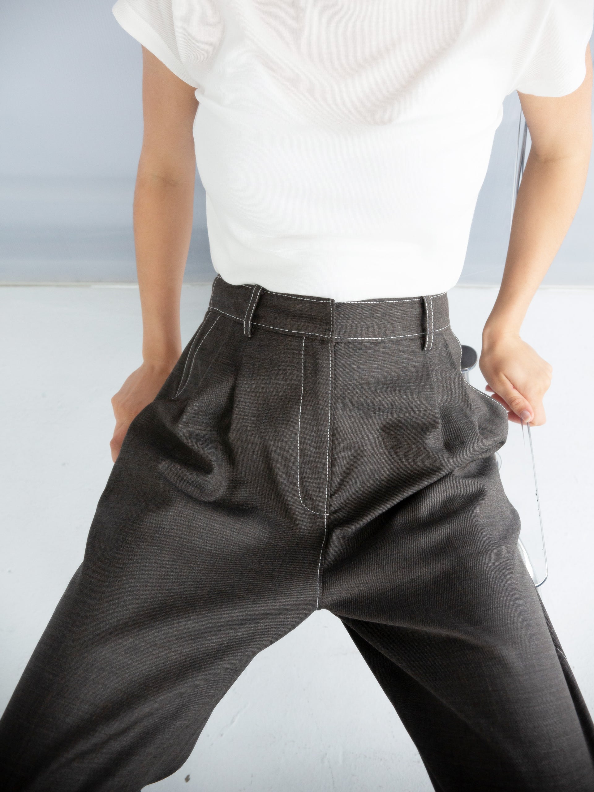 A tailored wool trouser is your key to Winter dressing, and the Romy trouser brings game. Fabricated from 100% lightweight Wool, Romy references Italian style reverse pleating on an accentuated high-rise, and The Lairs signature contrast stitch-work is strategically placed to draw attention to all the right places.