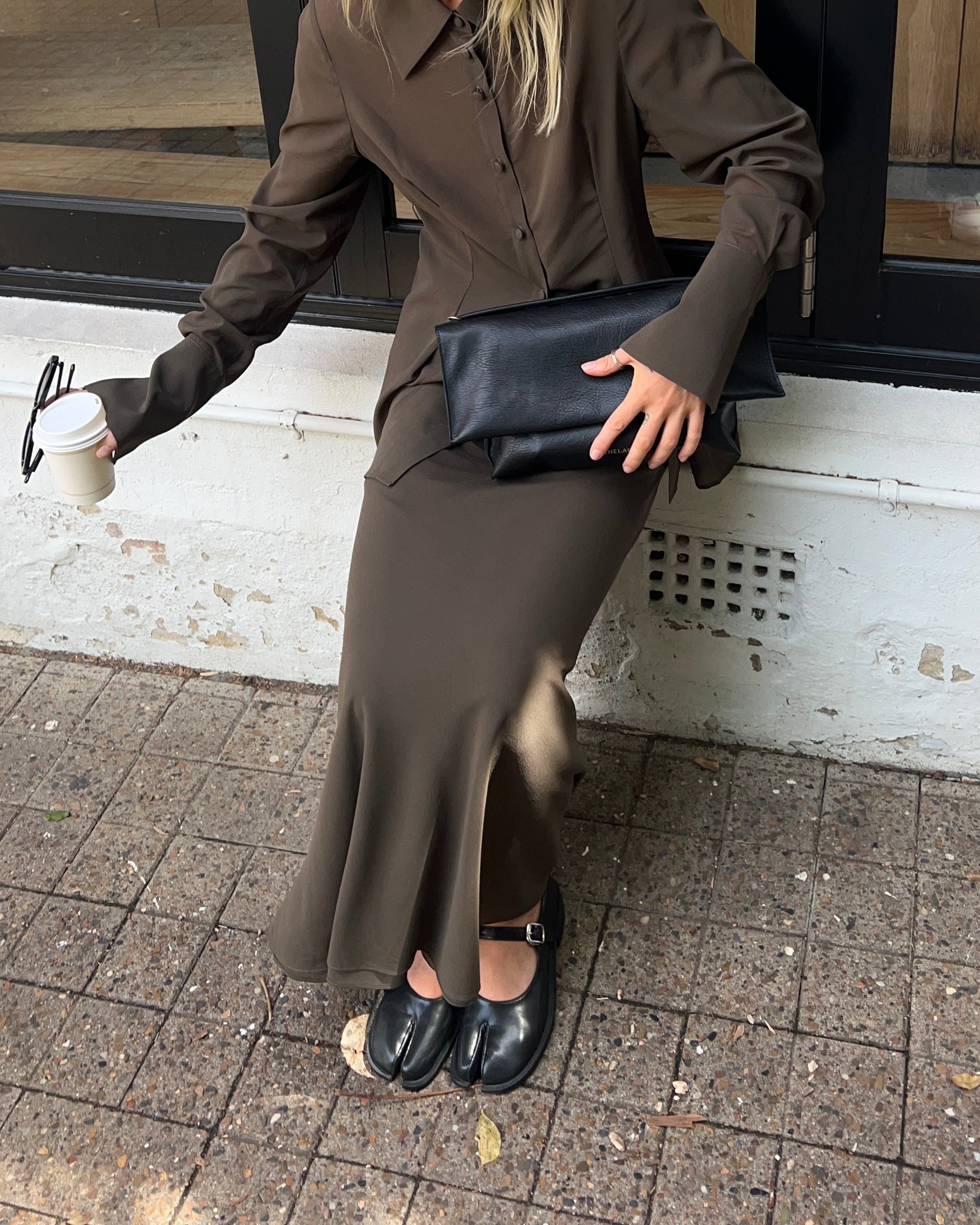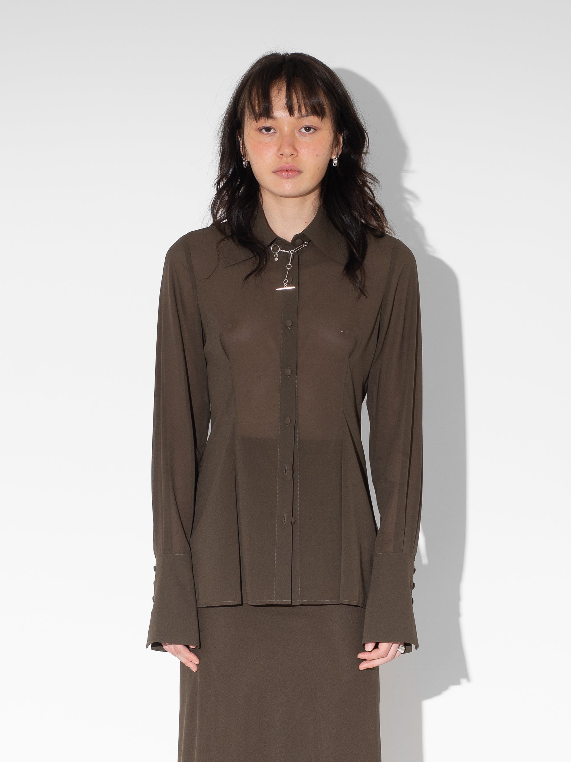 An excersize in modern femininity, the Florian button up is defined by a contemporary take on 'princess seams' - vertical darts running through the front and back of the garment, to enhance the silhouette. The soft silk fabrication is complimented by the same fabric-coated button closure, pairing with the exaggerated sleeves and cuffs. Florians constructed waistline and elongated collar tips perfectly contrasts with the soft drape of this top.