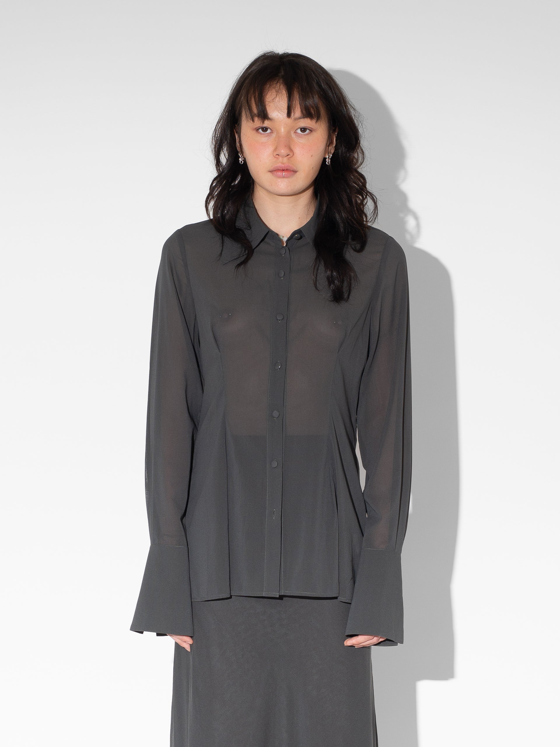An exercise in modern femininity, the Florian button-up is defined by a contemporary take on 'princess seams' - vertical darts running through the front and back of the garment, to enhance the silhouette. The soft silk fabrication is complimented by the same fabric-coated button closure, paired with the exaggerated sleeves and cuffs. Florians constructed waistline and elongated collar tips perfectly contrast with the soft drape of this top.