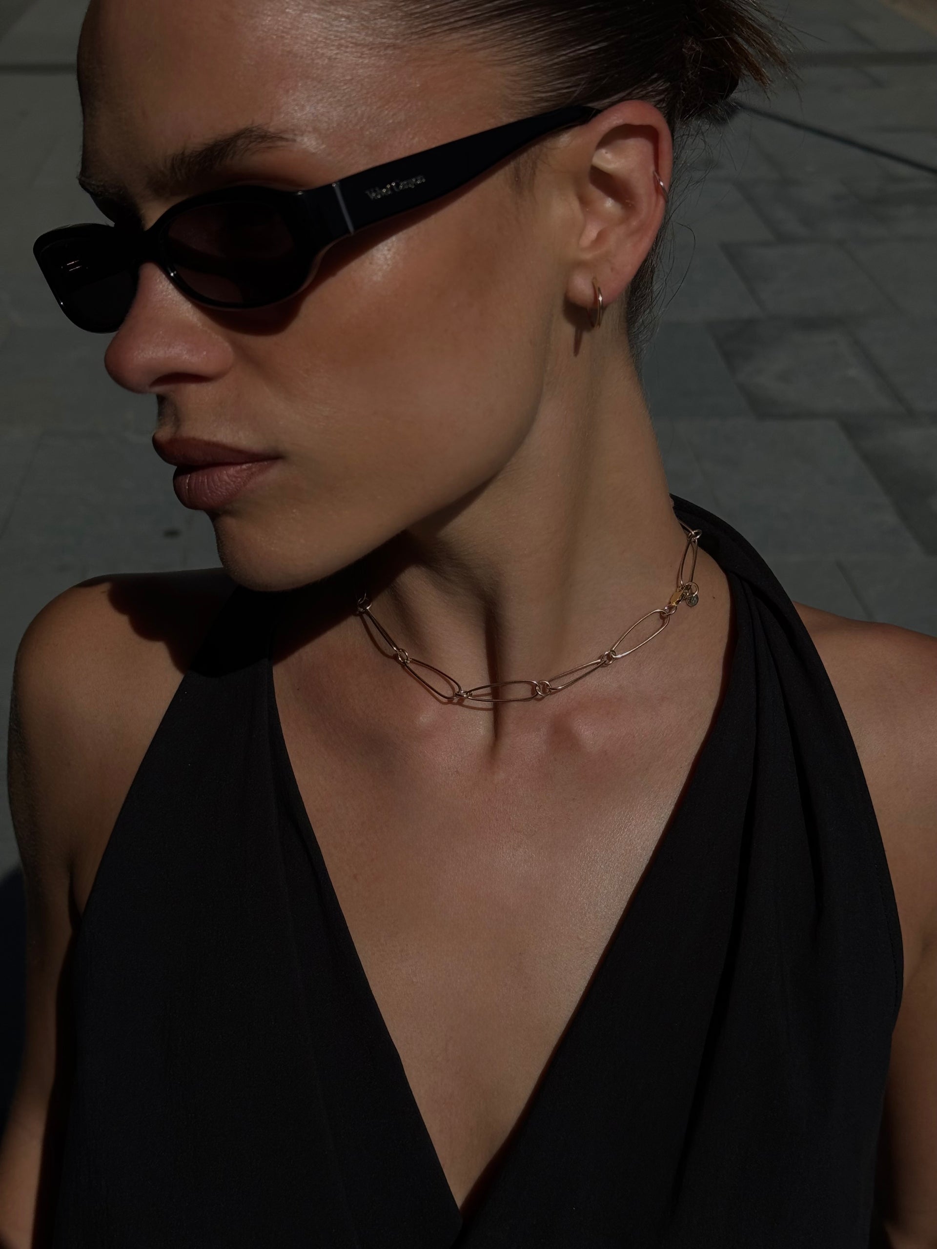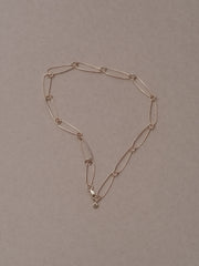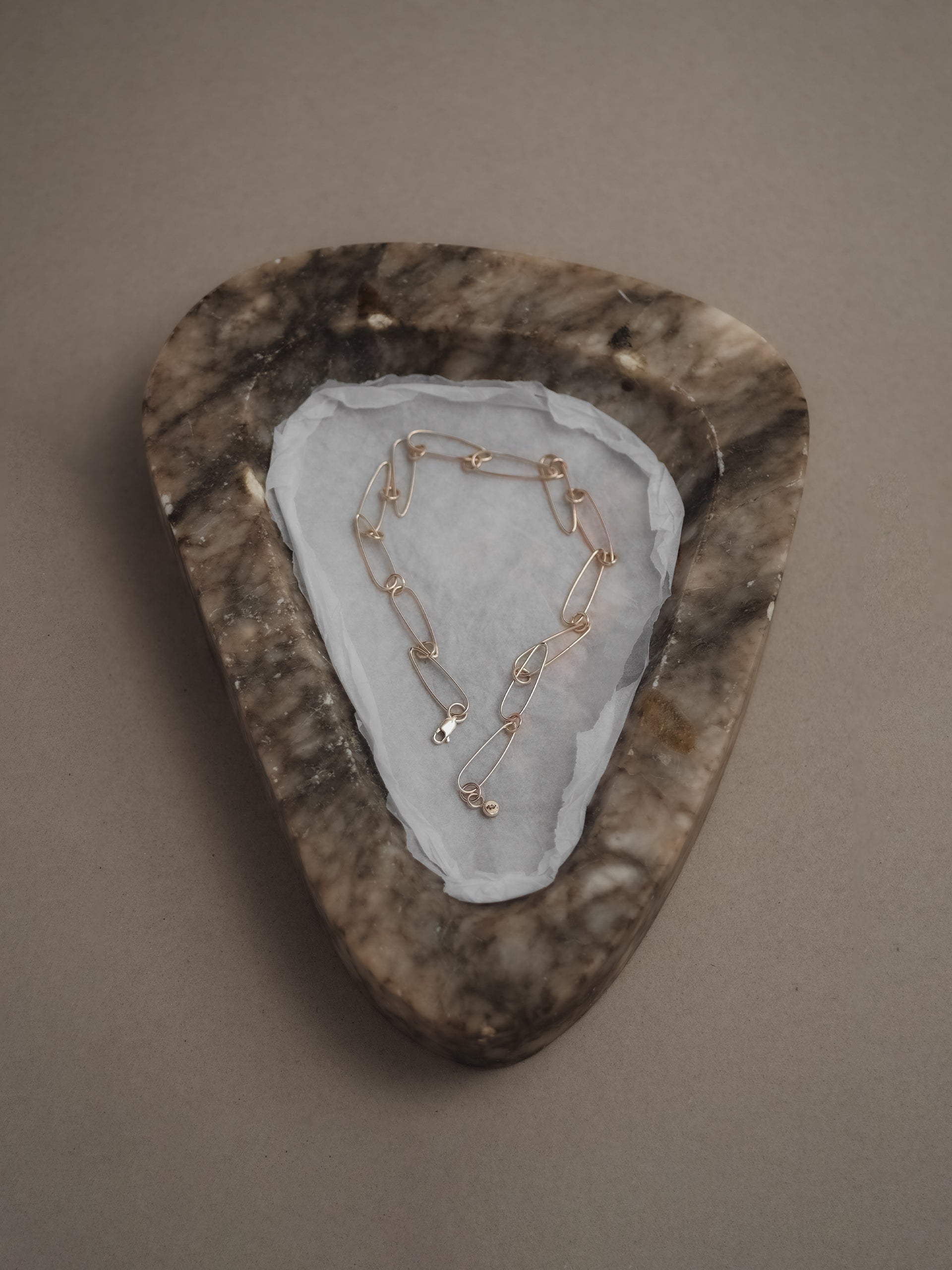 Designed and handcrafted in The Lair Studio, Newcastle, the Namida Micro Chain is a refined, lighter interpretation of our original Namida Necklace. Named after the Japanese word for “tear,” its elongated micro oval links echo the teardrop-like form of the classic design, but rendered in a finer gauge for a more delicate, understated profile. Circular connectors punctuate the chain, enhancing its subtle movement. Sitting at 38cm, it rests neatly at the collarbone - subtle, sculptural, and effortlessly wearable.