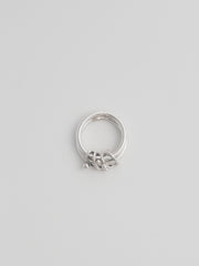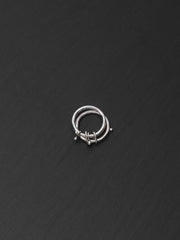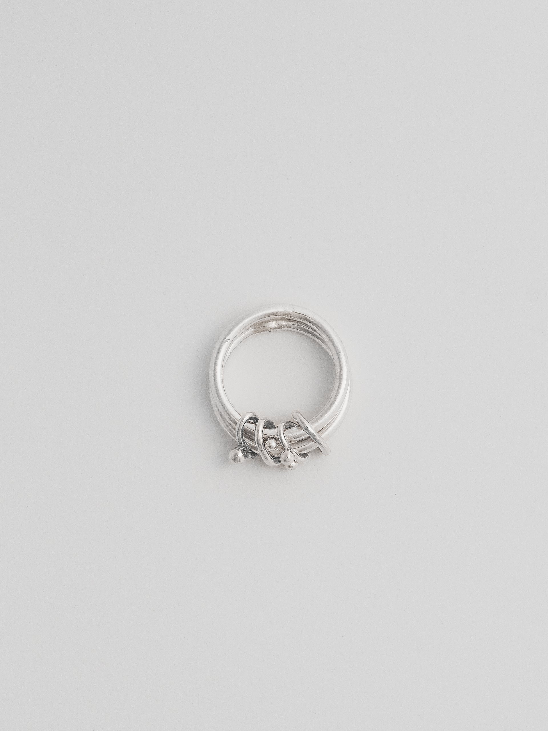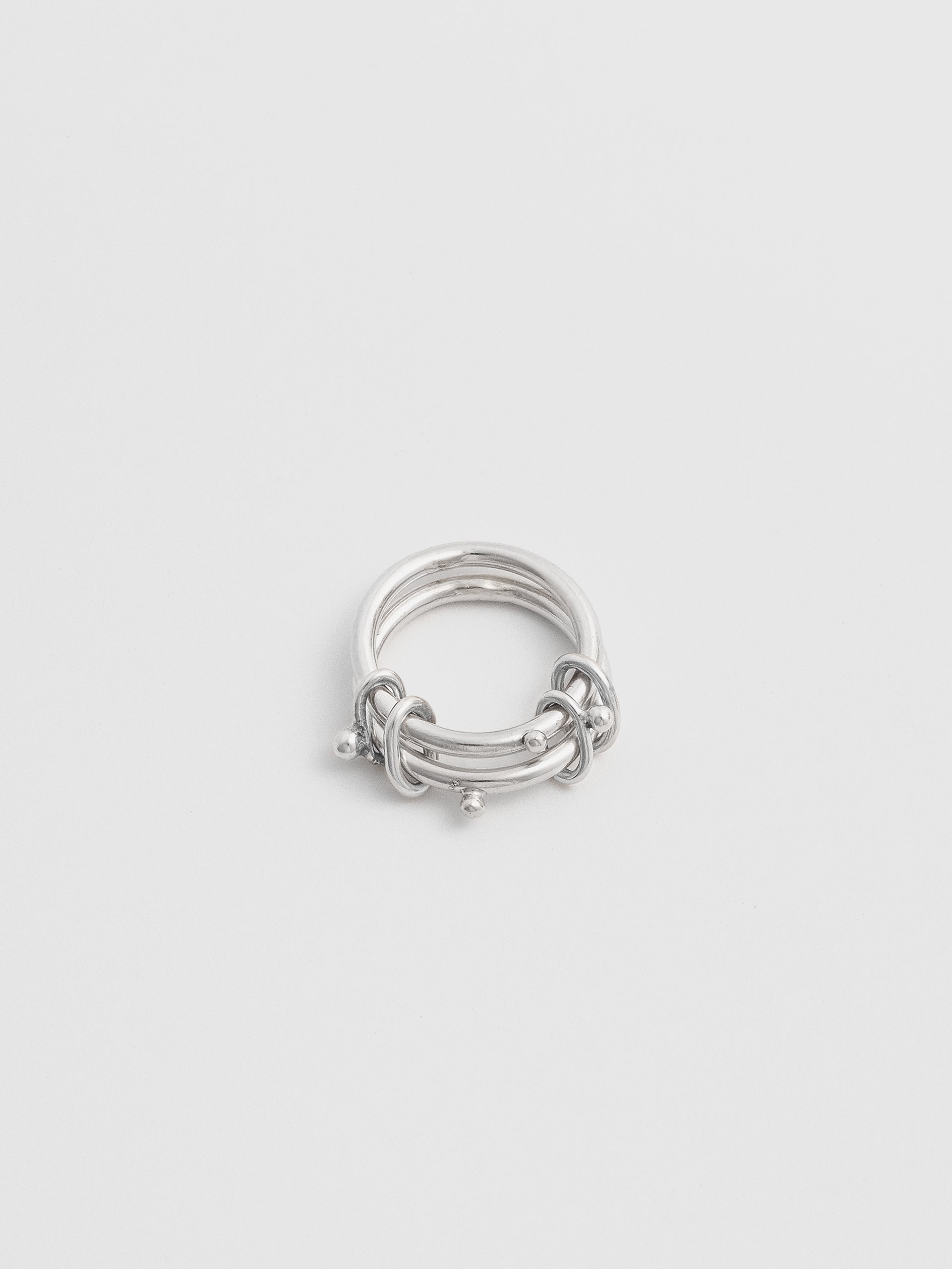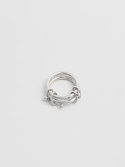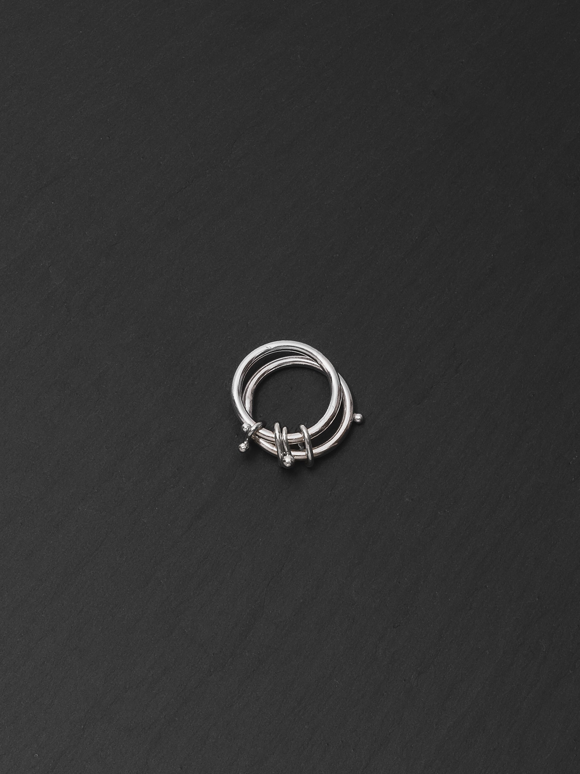 Designed and handcrafted in The Lair Studio, Newcastle, the Svea Stacked Ring brings together two sterling silver bands linked by handmade silver oval connectors. Each connector is finished with small molten details, echoing the organic texture of the molten blobs on the silver bands themselves. The result is a subtle interplay of metals and form - a stacked silhouette that moves as one.