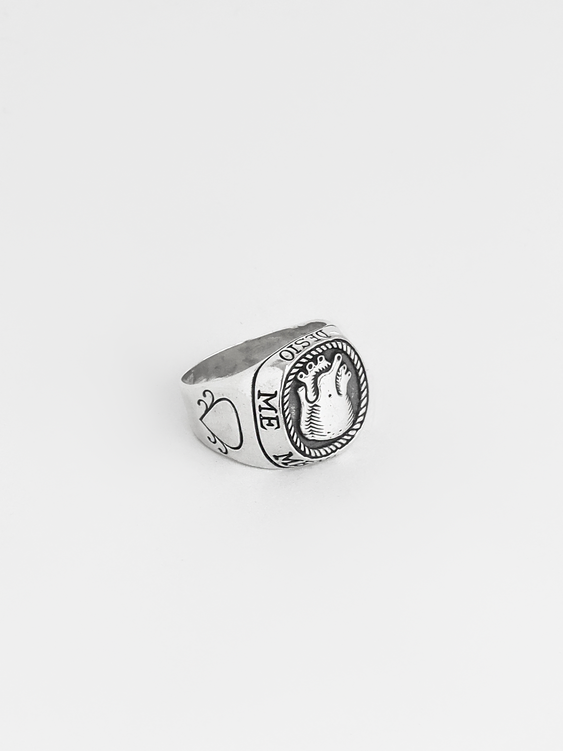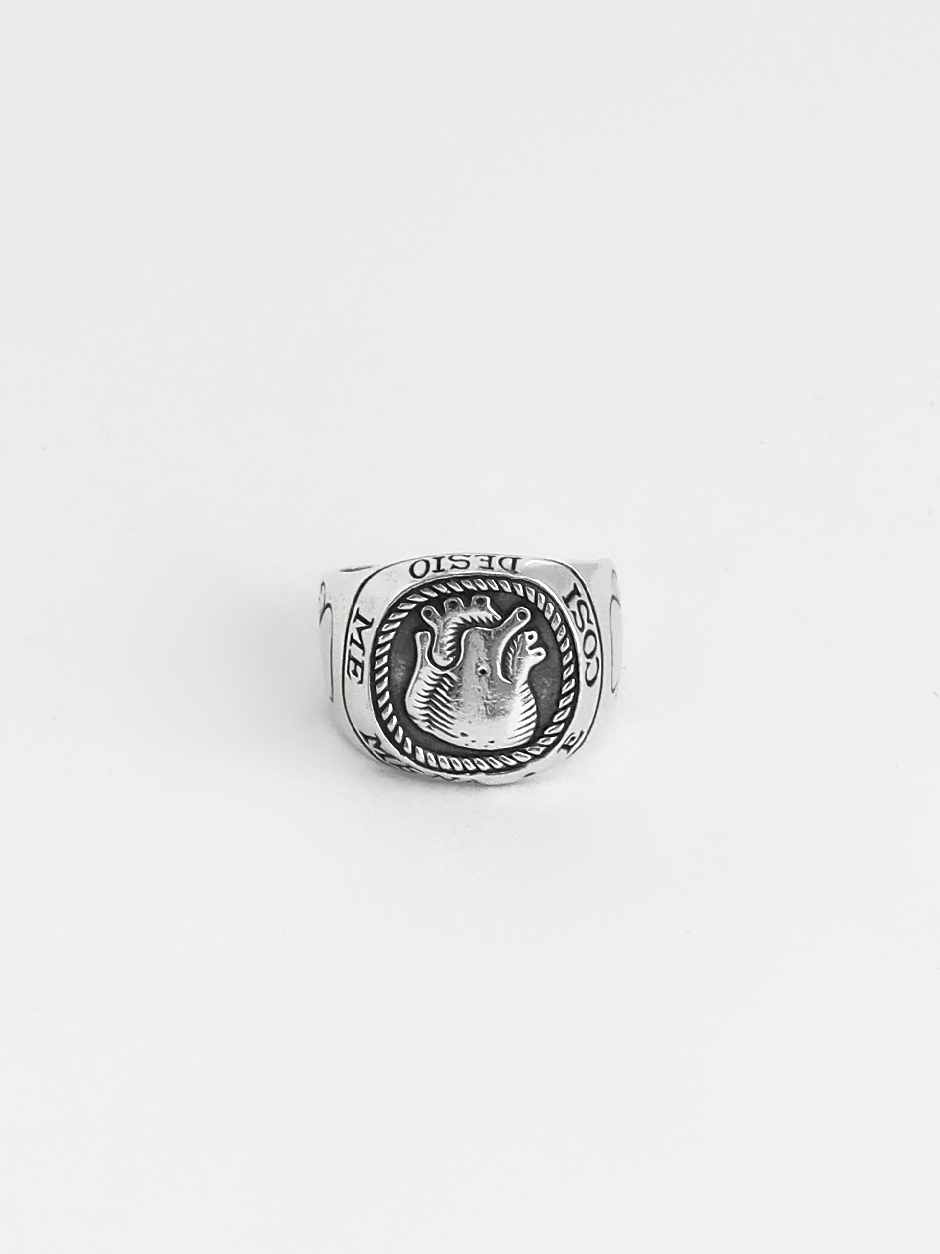 The Heart Signet by Digby & Iona is engraved with an anatomical heart framed by a quote from the famed Italian humanist, poet, and writer Francesco Petrarch. 'E Cosi Desio Me Mena' translates to 'And So Desire Carries Me Along’; a quote Petrarch’s collection of poems in Il Canzoniere.