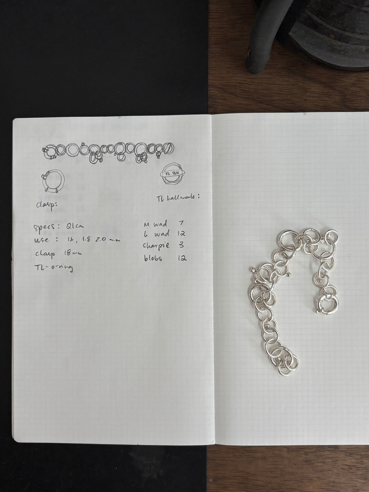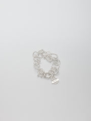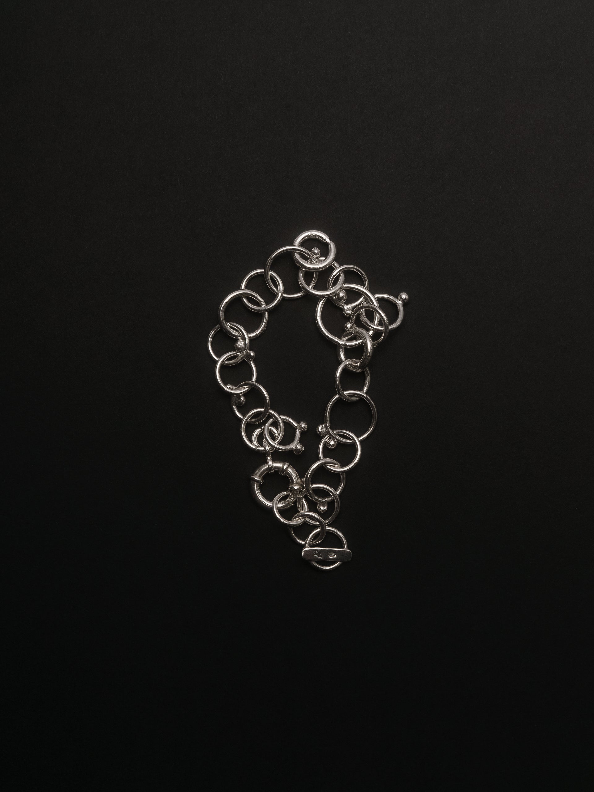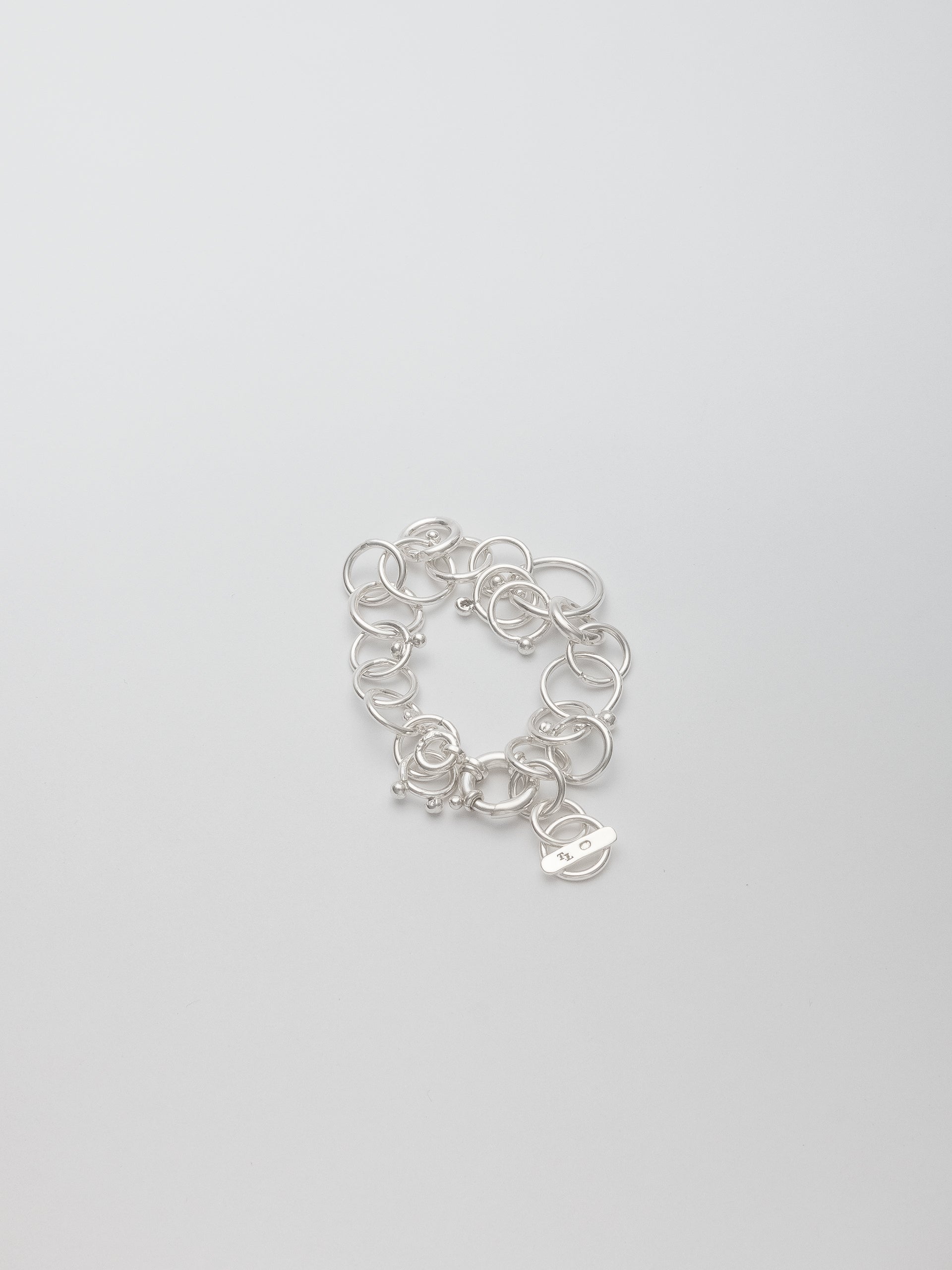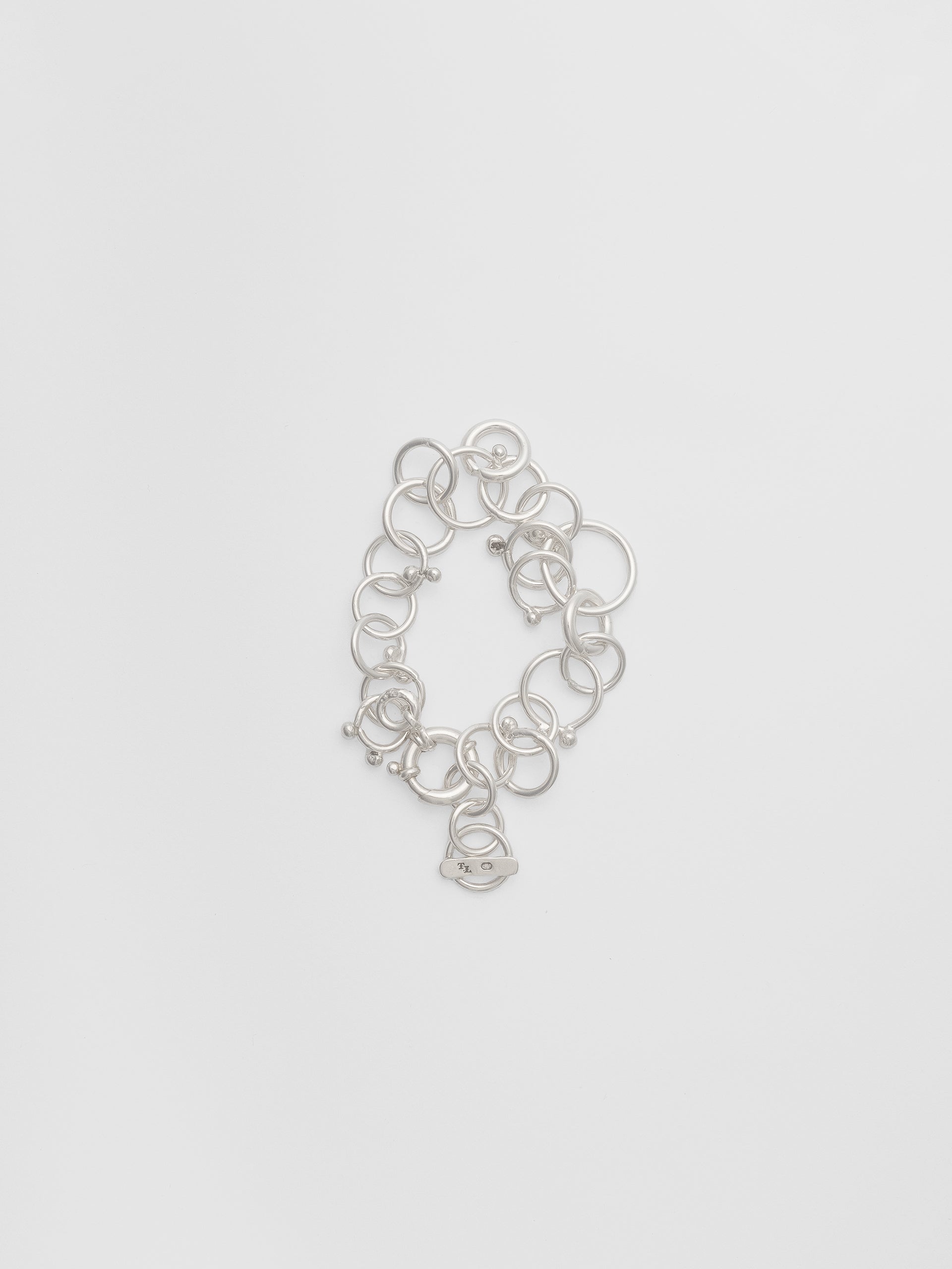 Crafted from .925 sterling silver, it features a custom circular clasp with offset rings - designed to fasten fluidly and sit comfortably against the wrist. Each link carries the nuance of handwork, making every piece a singular expression.