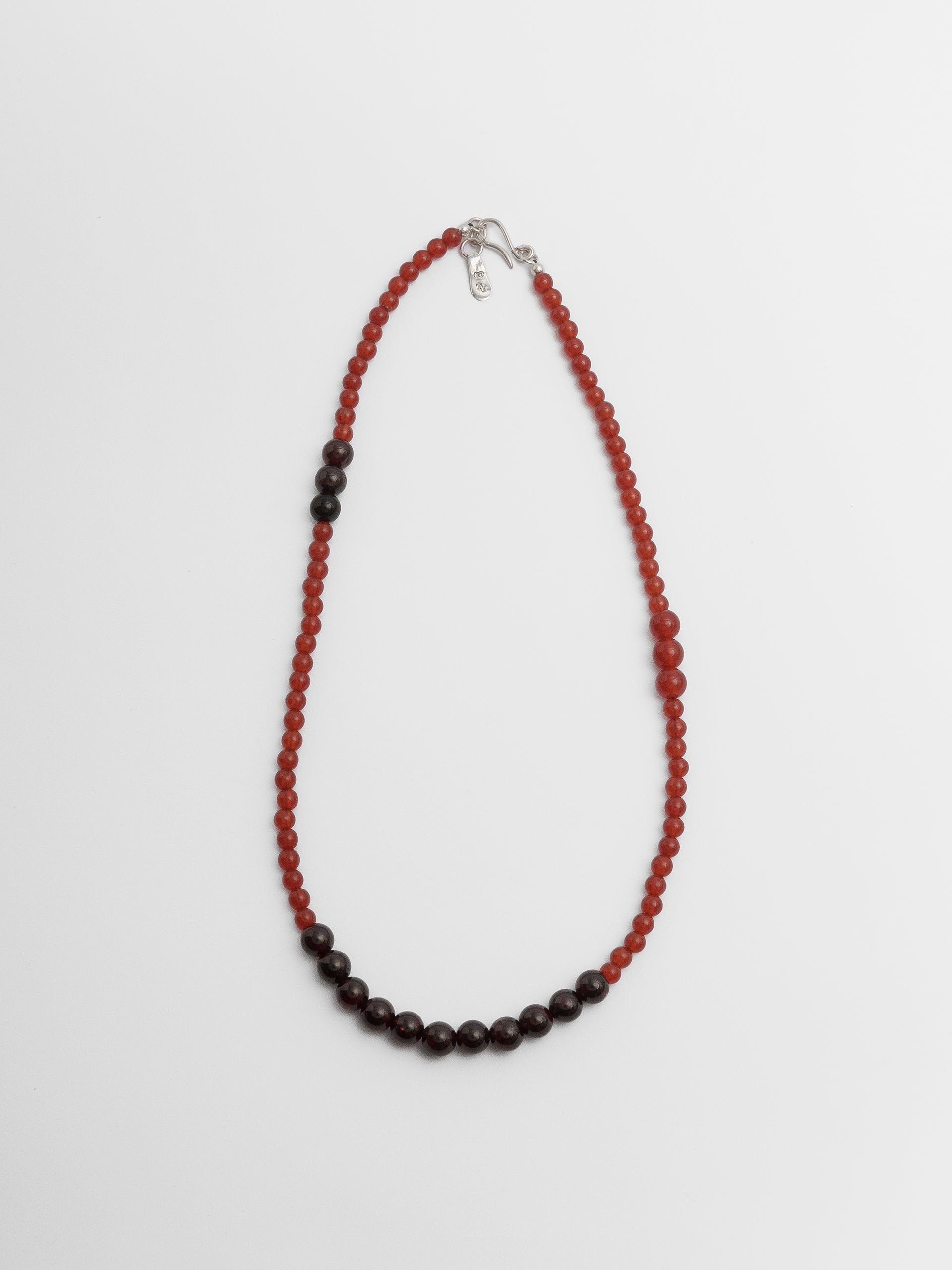 Named after the Japanese word for moon, Tsuki is a testament to quiet elegance. Handmade from Red Carnelian and Orange Garnet beads, this asymmetrical design features a unique balance of smaller beads, punctuated by three larger stones. The garnet sections add depth and contrast, while the handmade fish hook clasp and sterling silver slab, carefully flattened in The Lair’s studio, bring a subtle point of difference. Inspired by the natural world, Tsuki is a refined addition to any collection, imbued with a sense of quiet beauty.