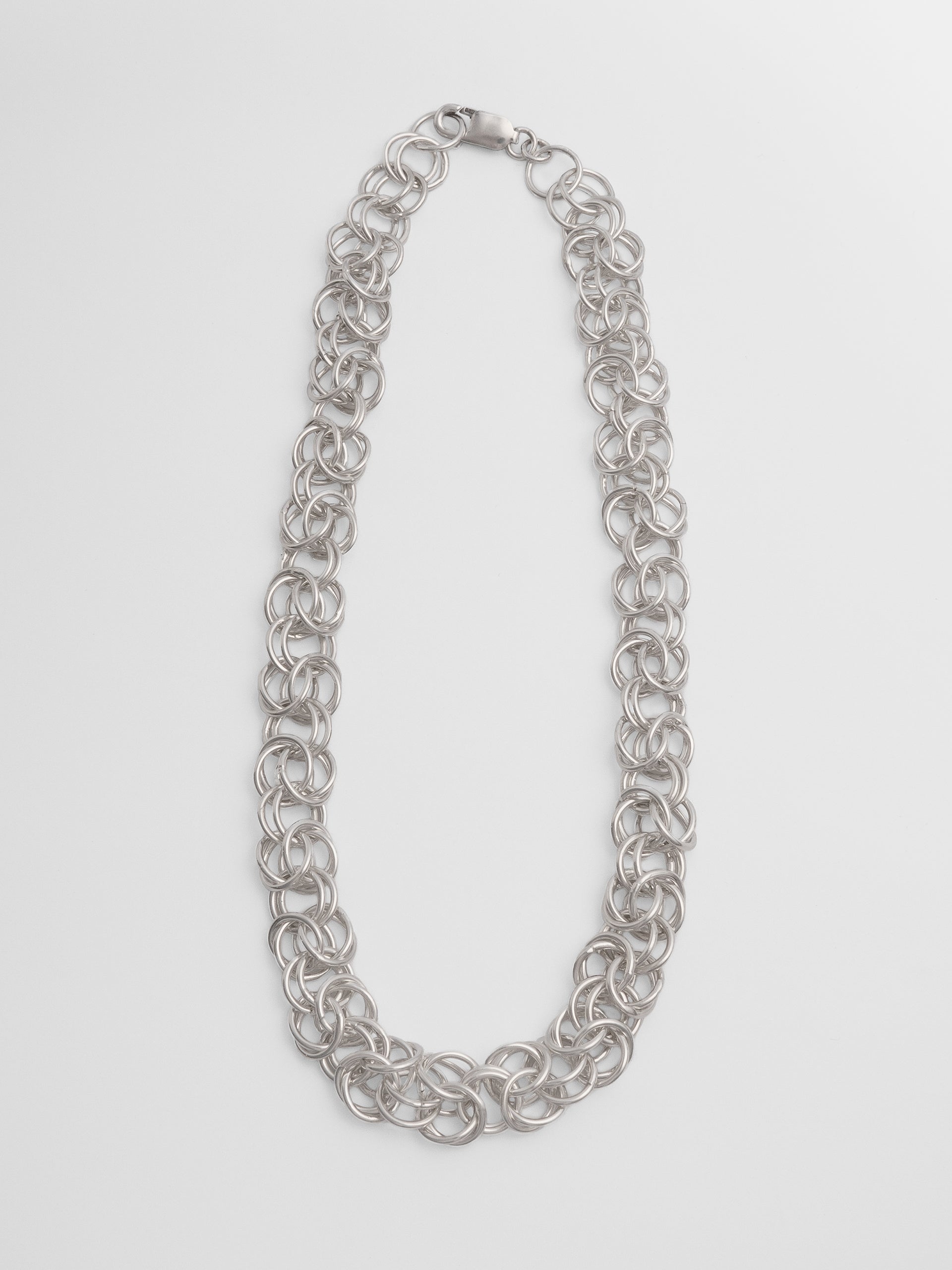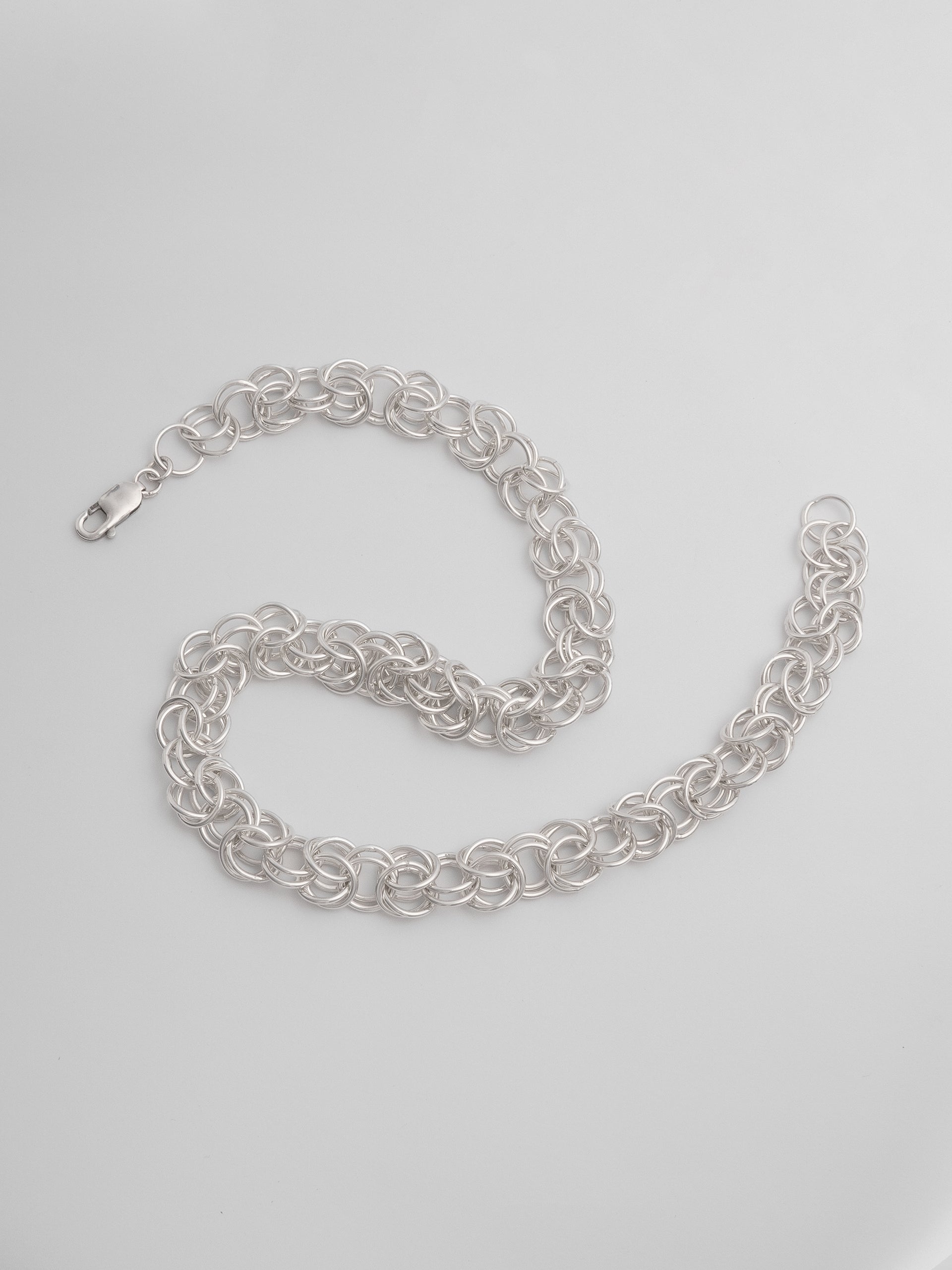 Handmade in Newcastle / Mulubinba, the Matrix Chain by Until Then is a bold and dimensional piece. Crafted from sterling silver, its chunky 3D spiral chain design features circle rings intricately looped in groups of 2-3, making it a striking addition to any outfit.