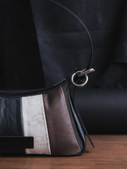 Designed and handcrafted in The Lair Studio, Newcastle, the Gwen Collage Handbag is a structured trapezoidal silhouette in Italian leather and suede. Its vertical collaged front panel is a one-off composition - strips of leather and suede in moody shades of blue, brown, black, and red, arranged as an intentional study in colour. Each palette is unique, created to either mirror the wearer’s mood or set it in motion. The reverse, cut in solid black leather, provides contrast and grounding. A chunky adjustable strap with dual buckle detailing at each side anchors the form, while a three-dimensional leather tag on the front carries The Lair and PIECES insignia. The interior holds an extra internal slip pocket and an external zip pocket on the back, balancing minimal design with daily function. A chunky split ring allows clasping any add-ons with ease, such as your phone, wallet or drinkbottle - an everyday piece elevated by collage.