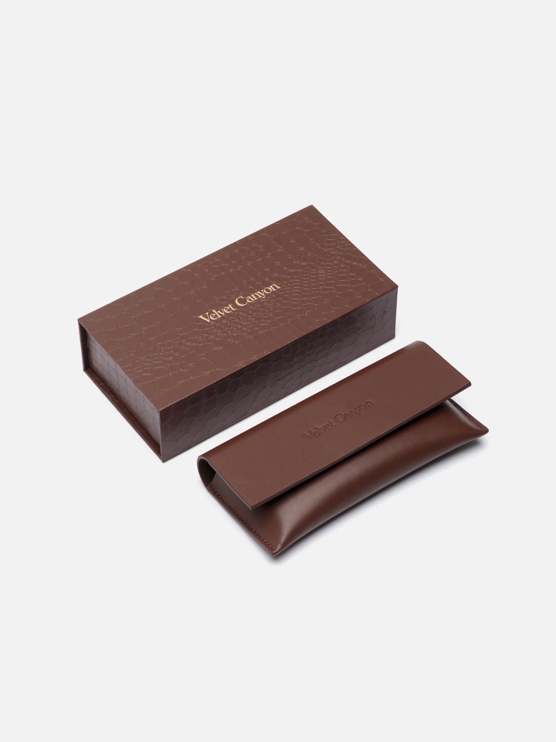- Velvet Canyon Gold Toned Logo on Temple