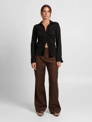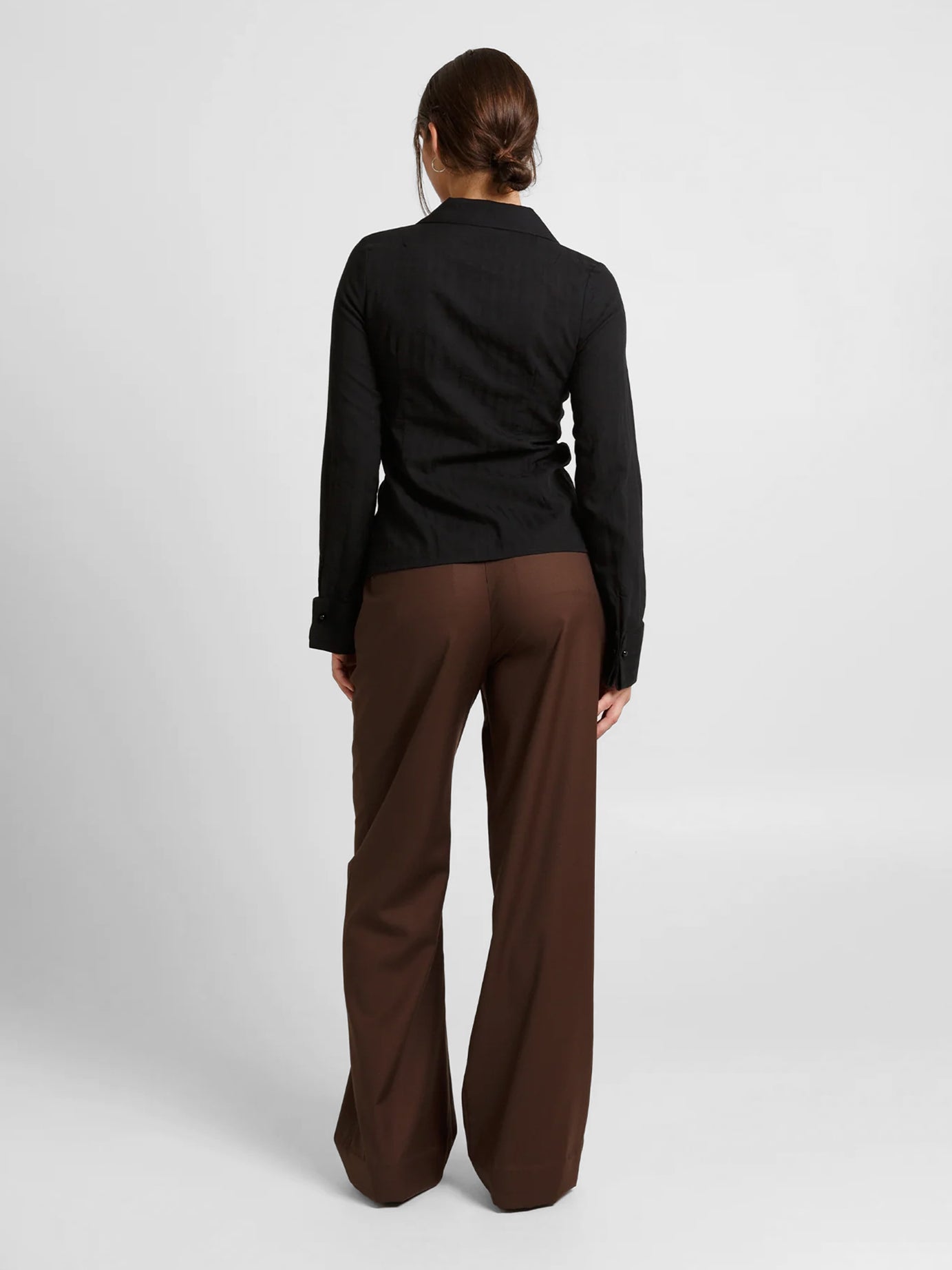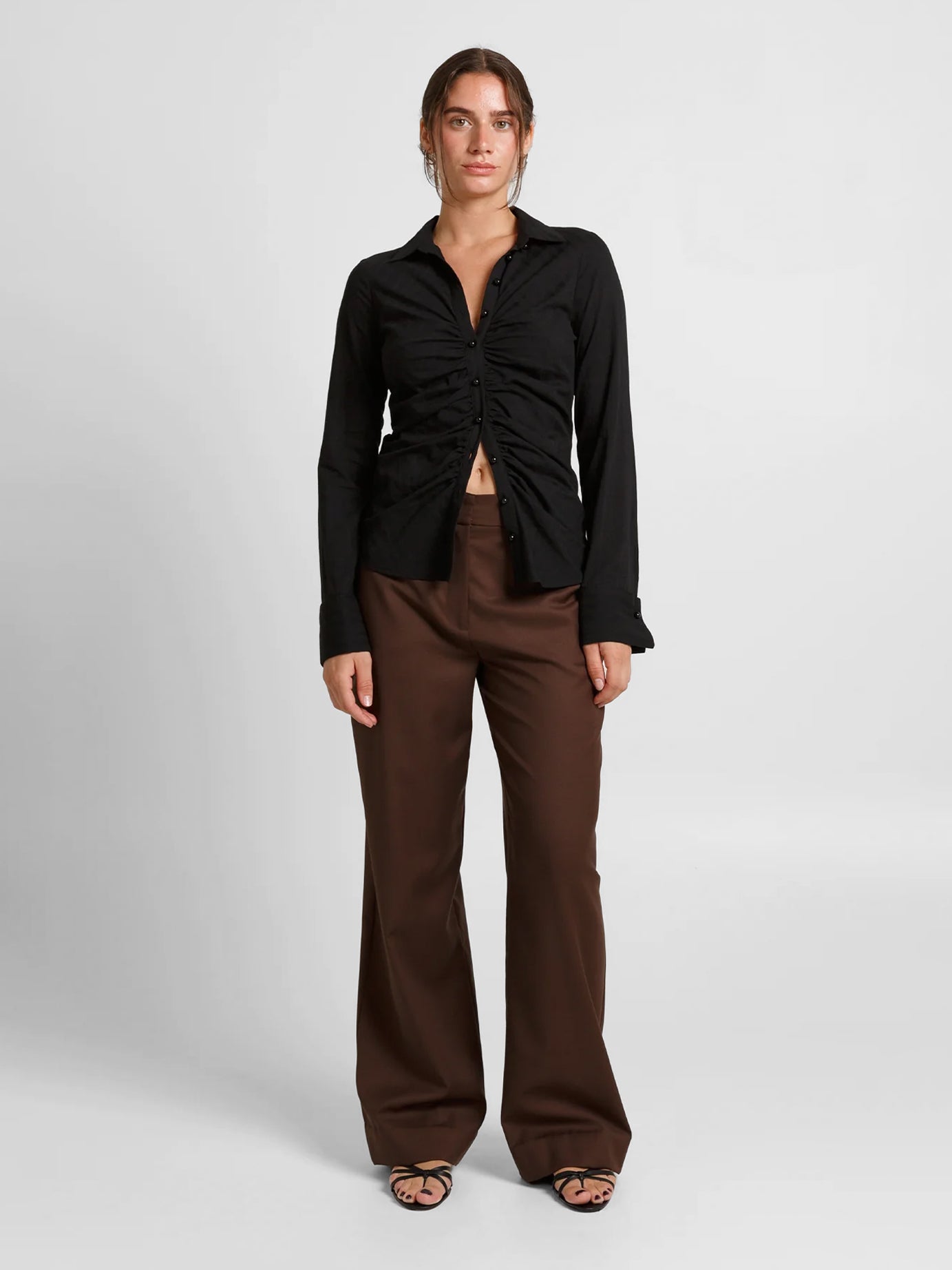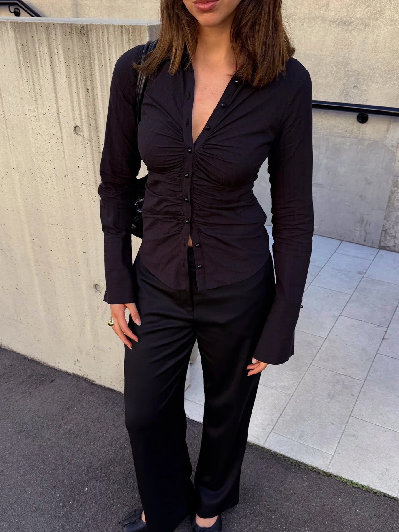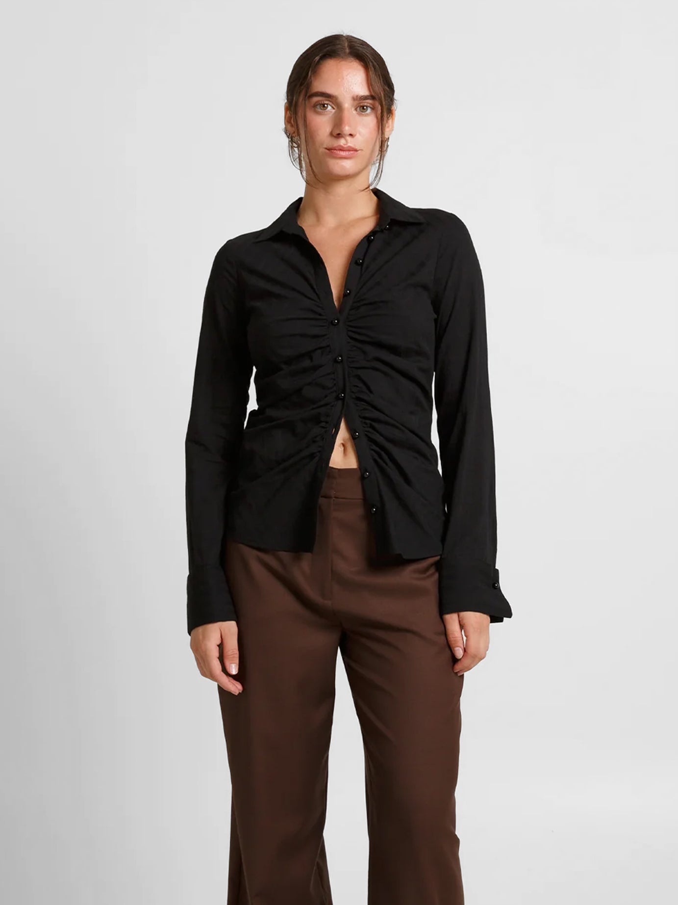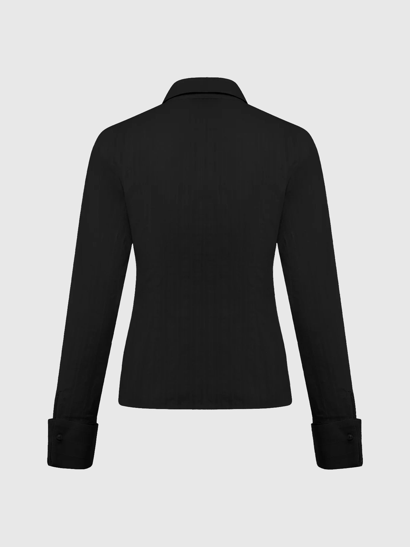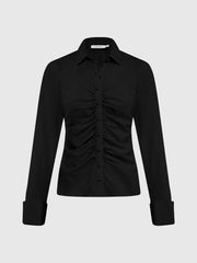 Tailored cotton jacquard shirt with a ruched front detail and classic collar. Features sphere shank buttons, French square cuffs, and back waist darts for a refined silhouette. Finished with a structured yet breathable feel.