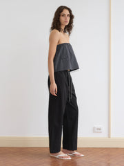 The layered black pants by Deiji Studios are a relaxed pair with a straight-leg silhouette and side-seam pockets. features a subtle layered hem detail, adjustable drawcord waist, and fits low - mid rise.