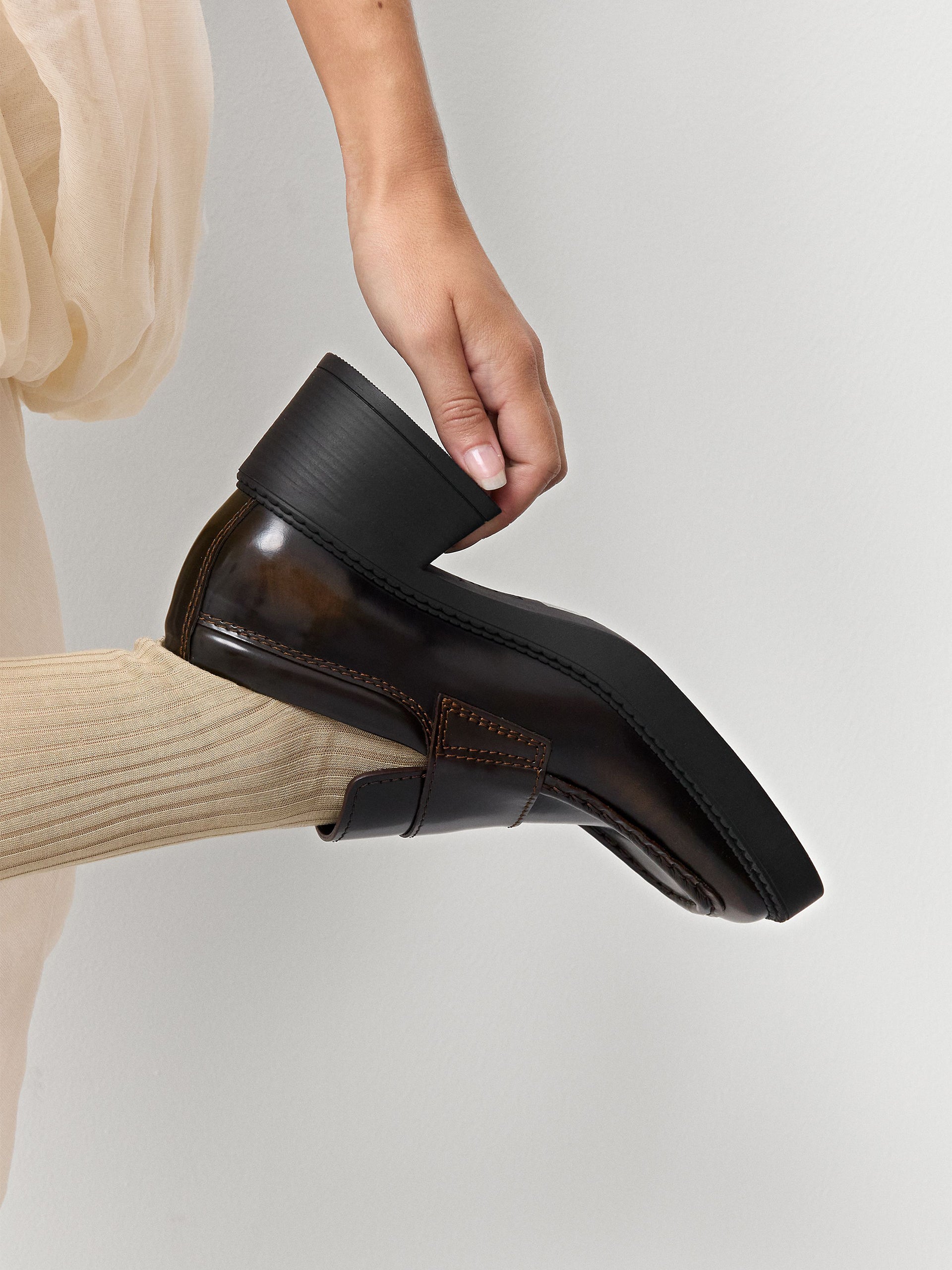 Karion is a refined loafer design. High-fronted, with piping detail on the square toe, it adds height and depth with a robust rubber sole and stacked-effect heel. It's crafted in a glossy Florantique brush-off effect double tanned leather which is buffed and polished to reveal the lighter brown shade beneath, and creates a slightly different patina on every pair.