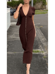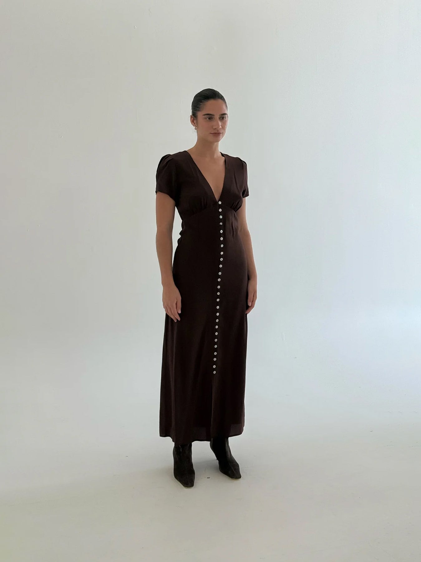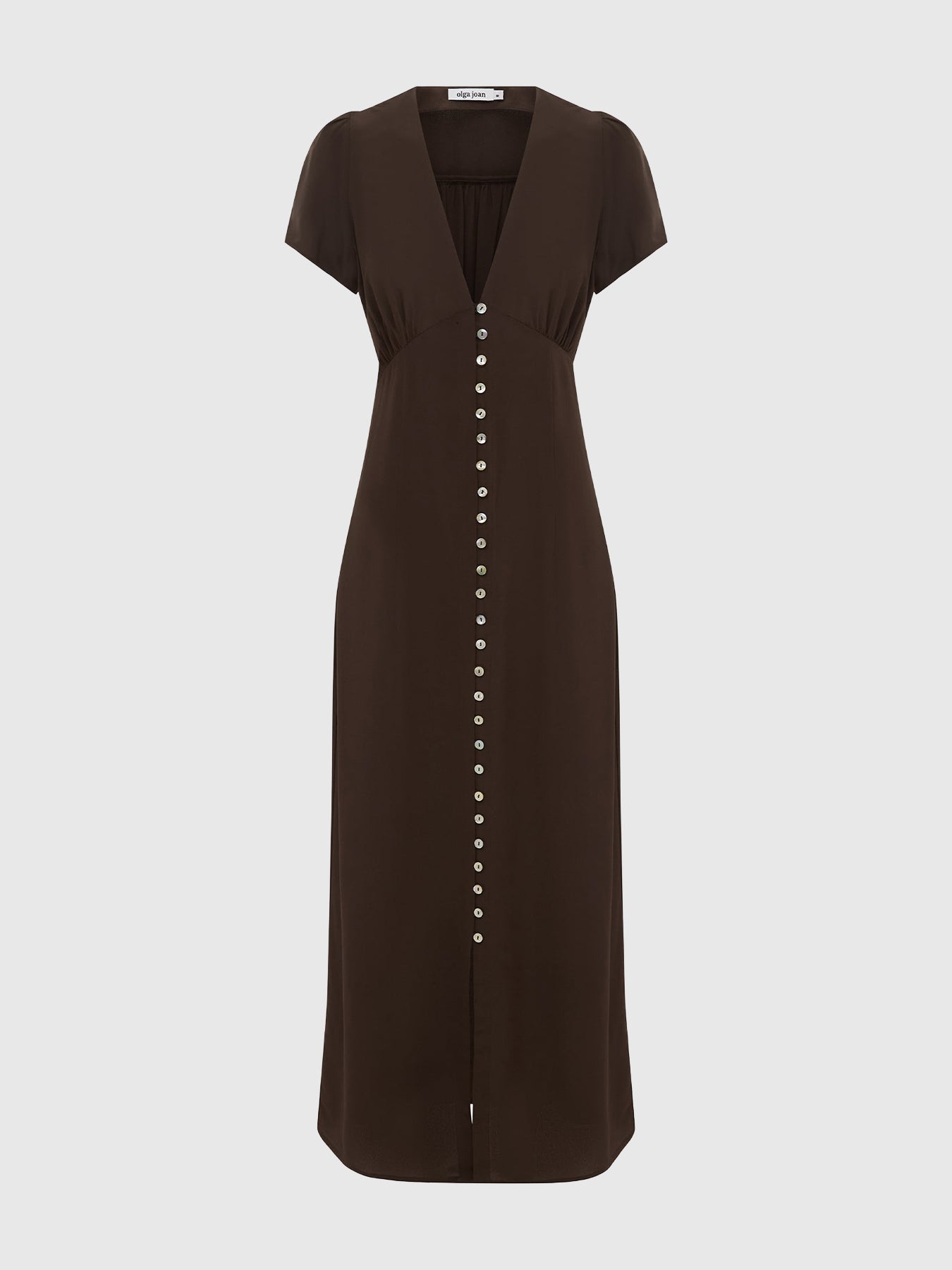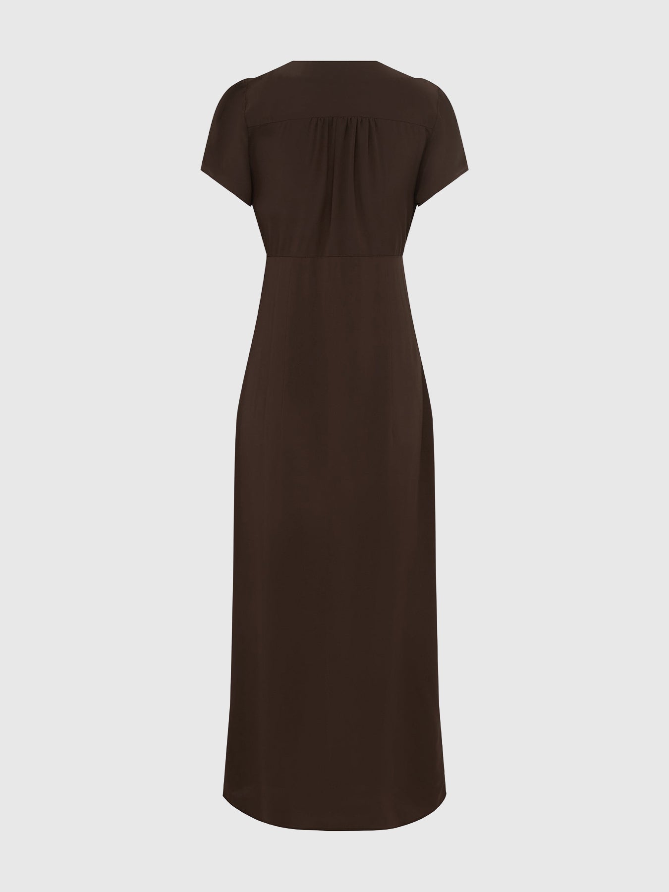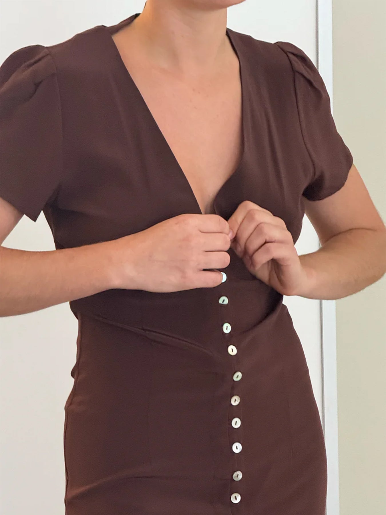 Straight-cut cap-sleeve dress in silk crepe de chine. Plunge neckline with gathering along the underbust seam, sleeve head, and back yoke. Inverted box-pleat detail on cap sleeves. Button-through rouleau closure with shell buttons.