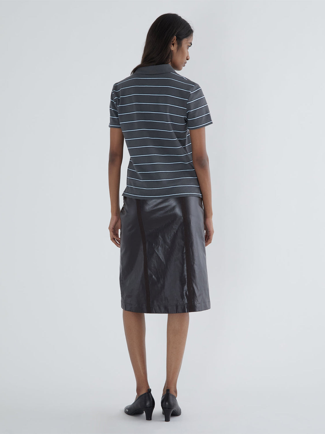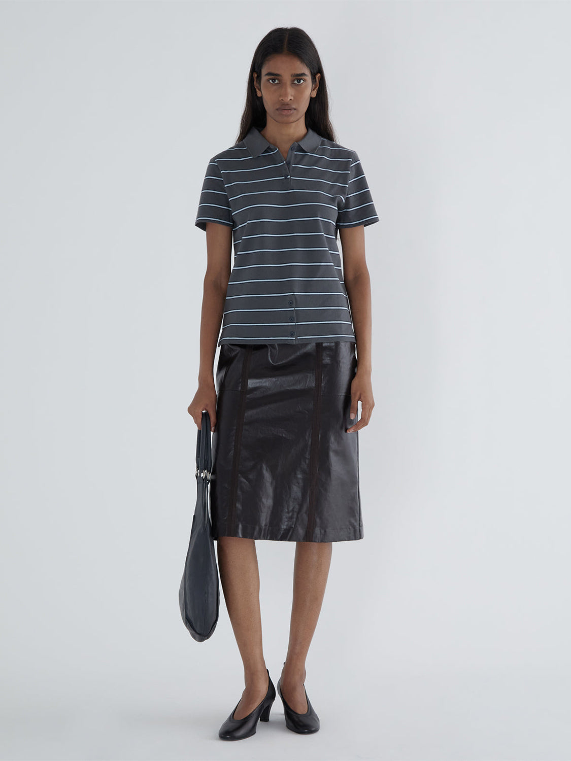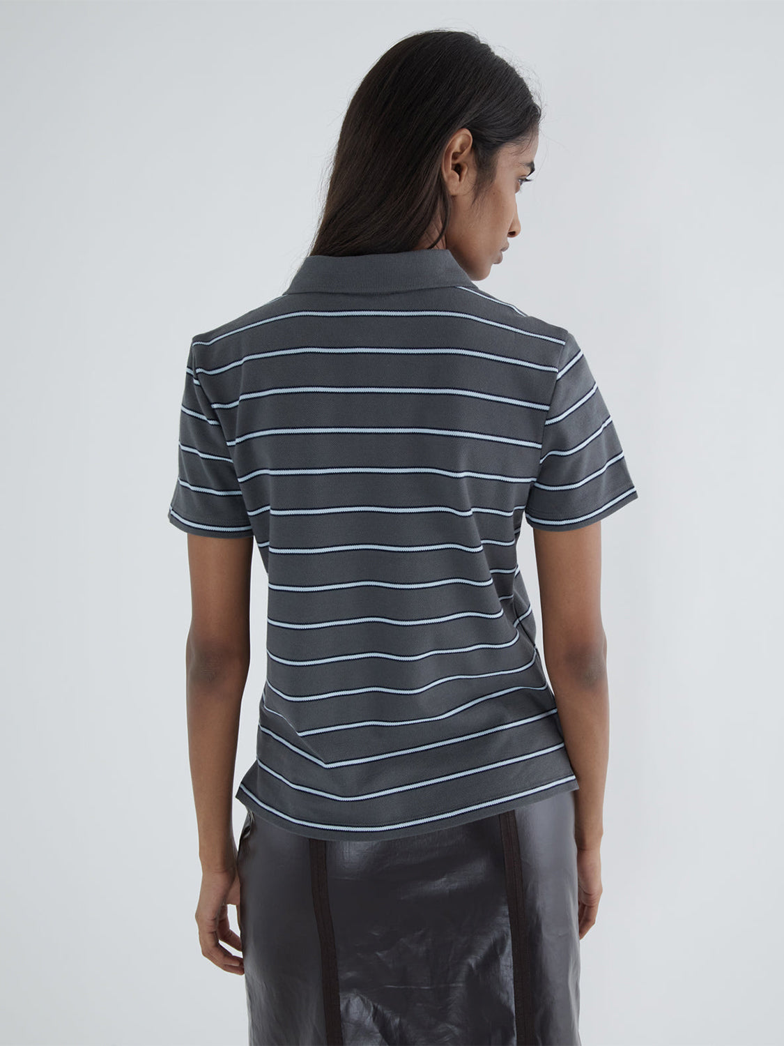 Striped piqué polo with a buttoned placket at the lower front, aligned with the collar placket.