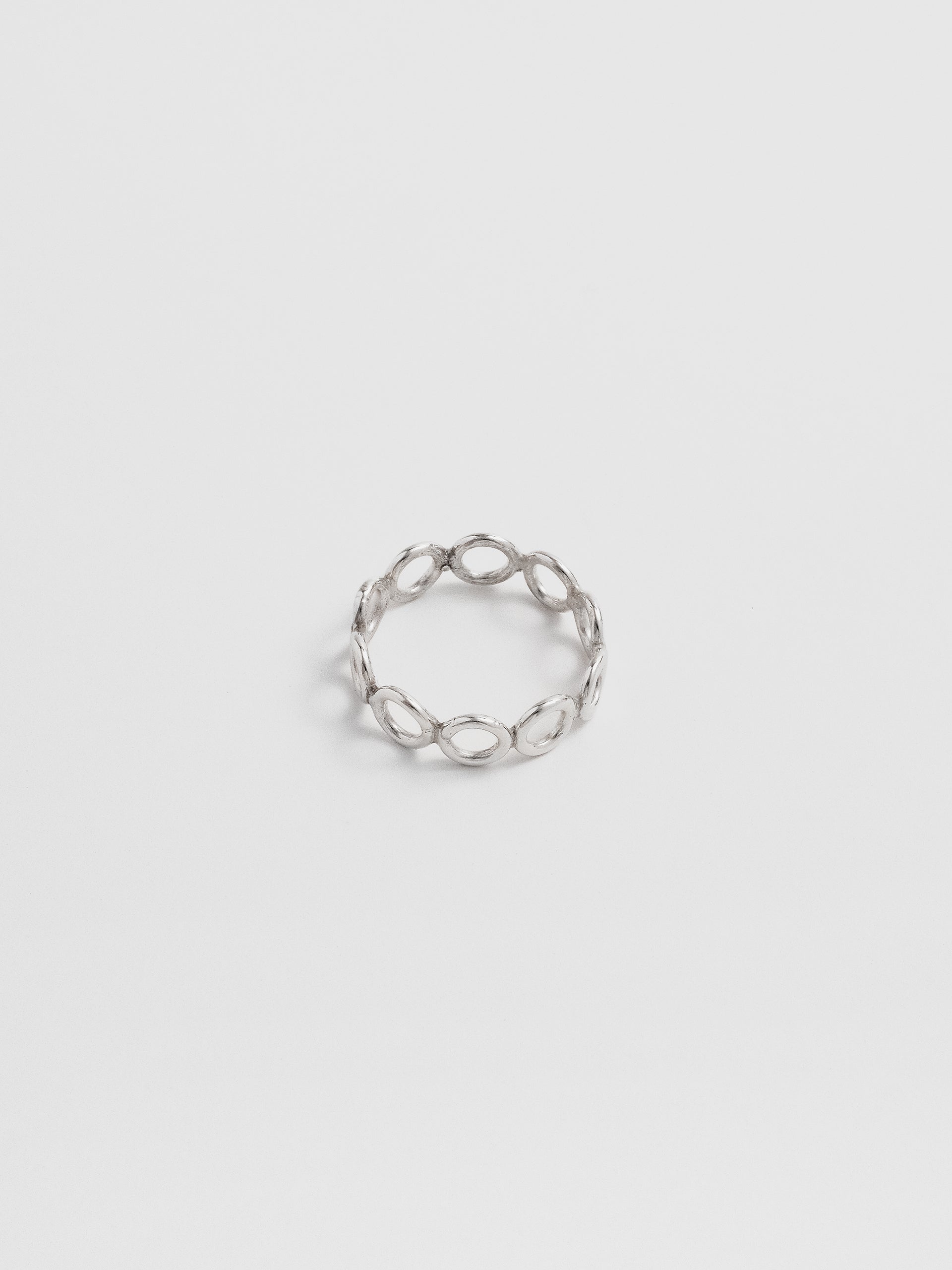 The Echo Ring by Until Then is a delicate, sculptural piece with a circular, rhythmic design. Small interlinked circles form a continuous loop, reminiscent of a miniature crown or elegant fence, creating a subtle yet captivating statement. Handmade in Newcastle / Mulubinba, it brings a touch of refined geometry to any collection.