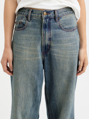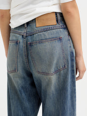 Cut from rigid 13.5oz cotton denim, the Loose Jean is designed with a wide, oversized straight leg that carries a relaxed drape. Finished with antique brass hardware, a debossed leather brand patch, and contrast red thread construction throughout. A multi-step wash treatment gives the denim a soft hand and a time-worn vintage character. True to size with a full-length fit.
