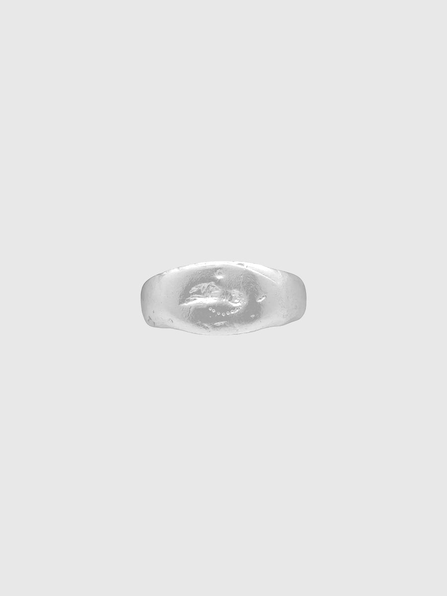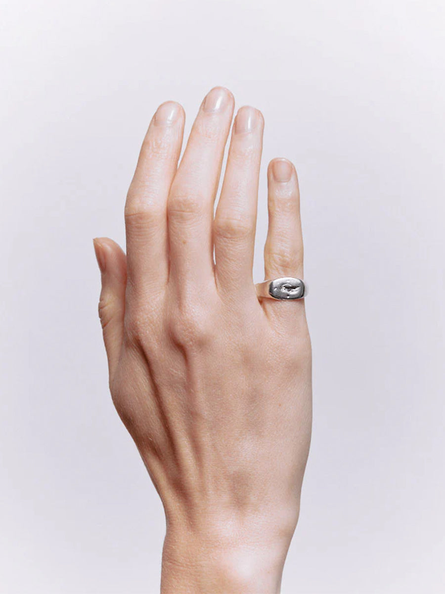 Silver signet pinky ring with etched face. Bronzino was the master of Italian Mannerist portraiture, known for his vivid and aptly captured images of the aristocracy. His painting of Francesca Salviati shows her as a self-possessed and confident woman, whose startlingly crimson dress seems to spill from the canvas, complemented by simple golden jewellery.