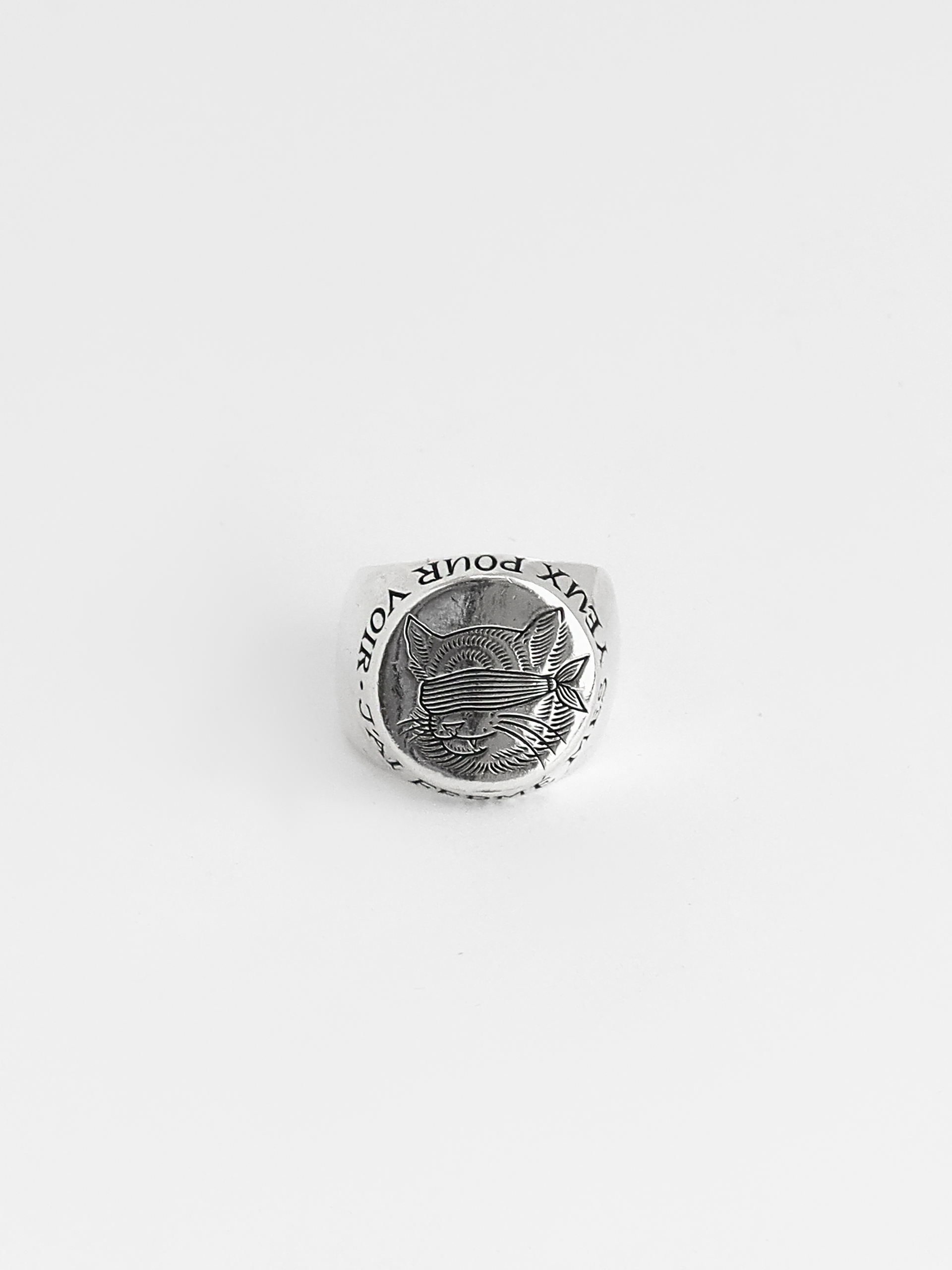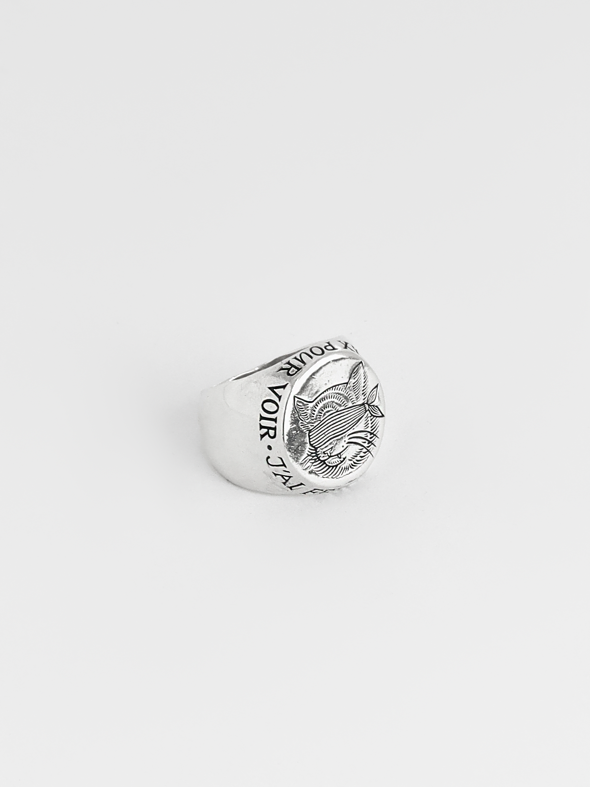 The Gauguin signet by Digby & Iona is inspired by a quote from French painter Paul Gauguin. 'Jai Ferme Mes Yeux Pour Voir' translates to 'I shut my eyes in order to see', a message mirrored by the blindfolded cat engraved into the face of the signet.