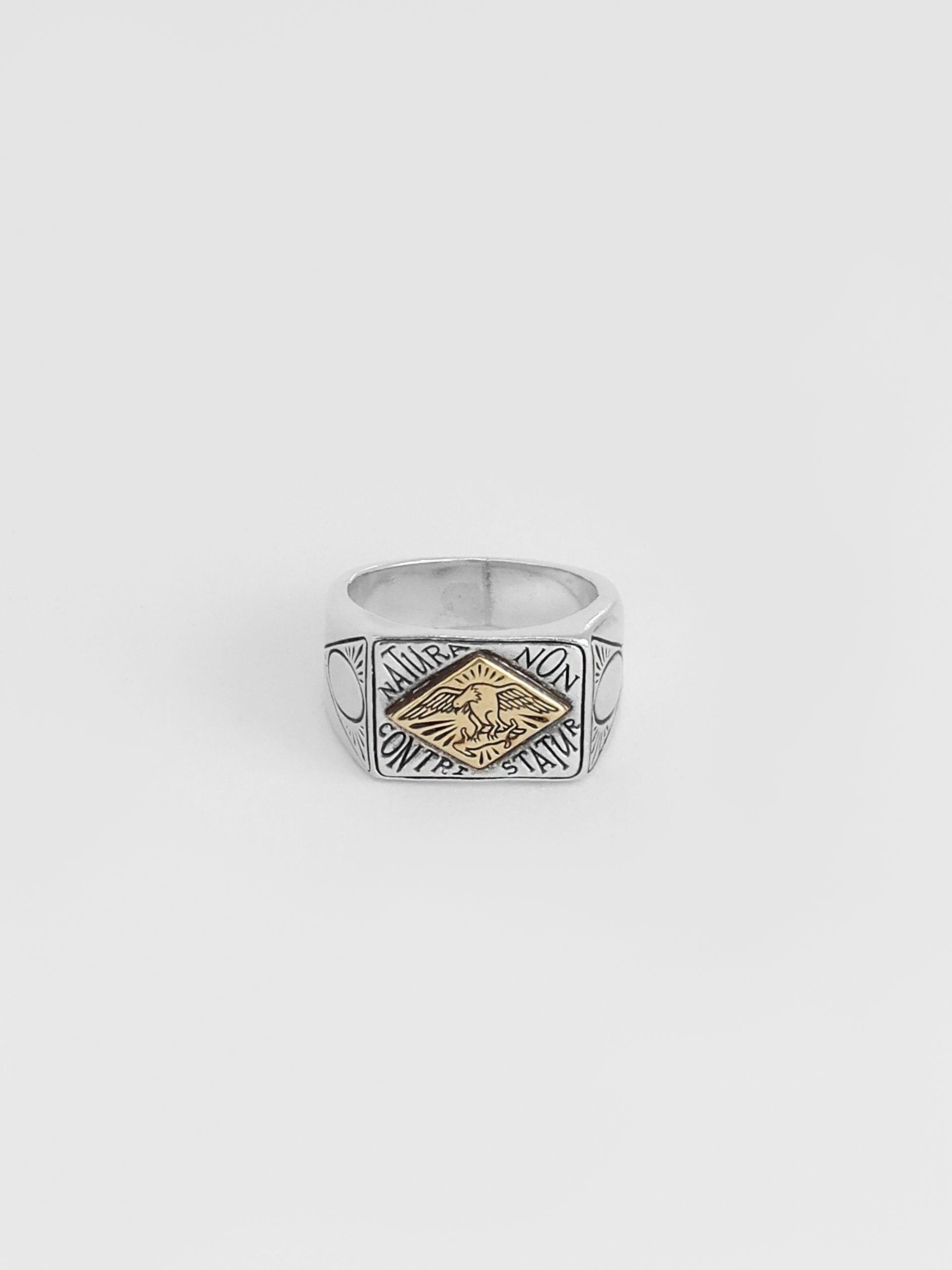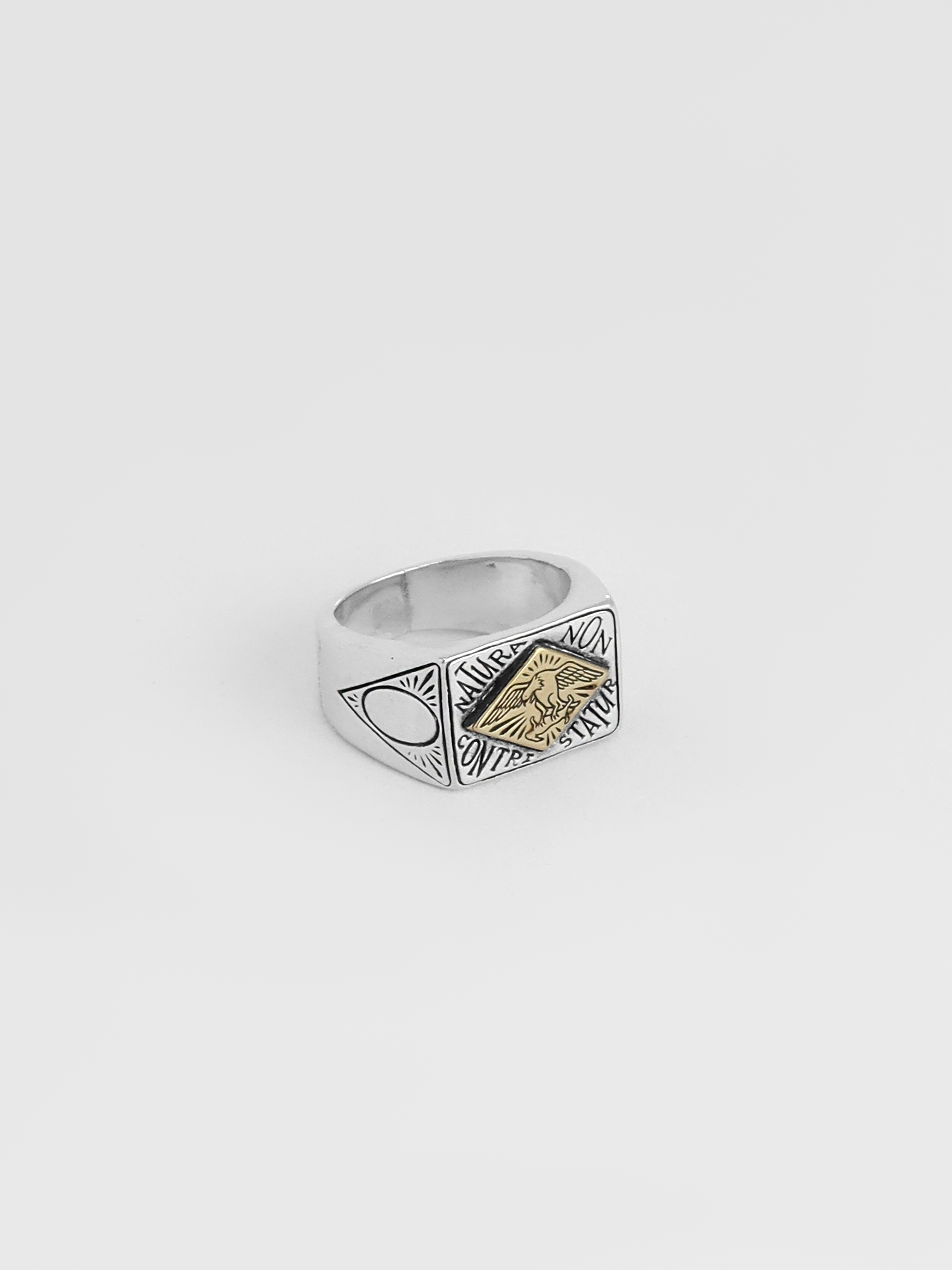 The Natura Signet Ring by Digby & Iona pictures a flying eagle holding a rabbit. The ring reads 'Natura which directly translates from Latin to 'Nature Is Not Saddened'. That is, that the natural world is not sentimental or compassionate. The phrase could serve as a reminder that the natural world is not concerned with human affairs, and will continue to live, grow, and exist around us while we go through our daily lives.