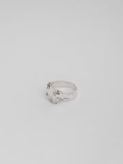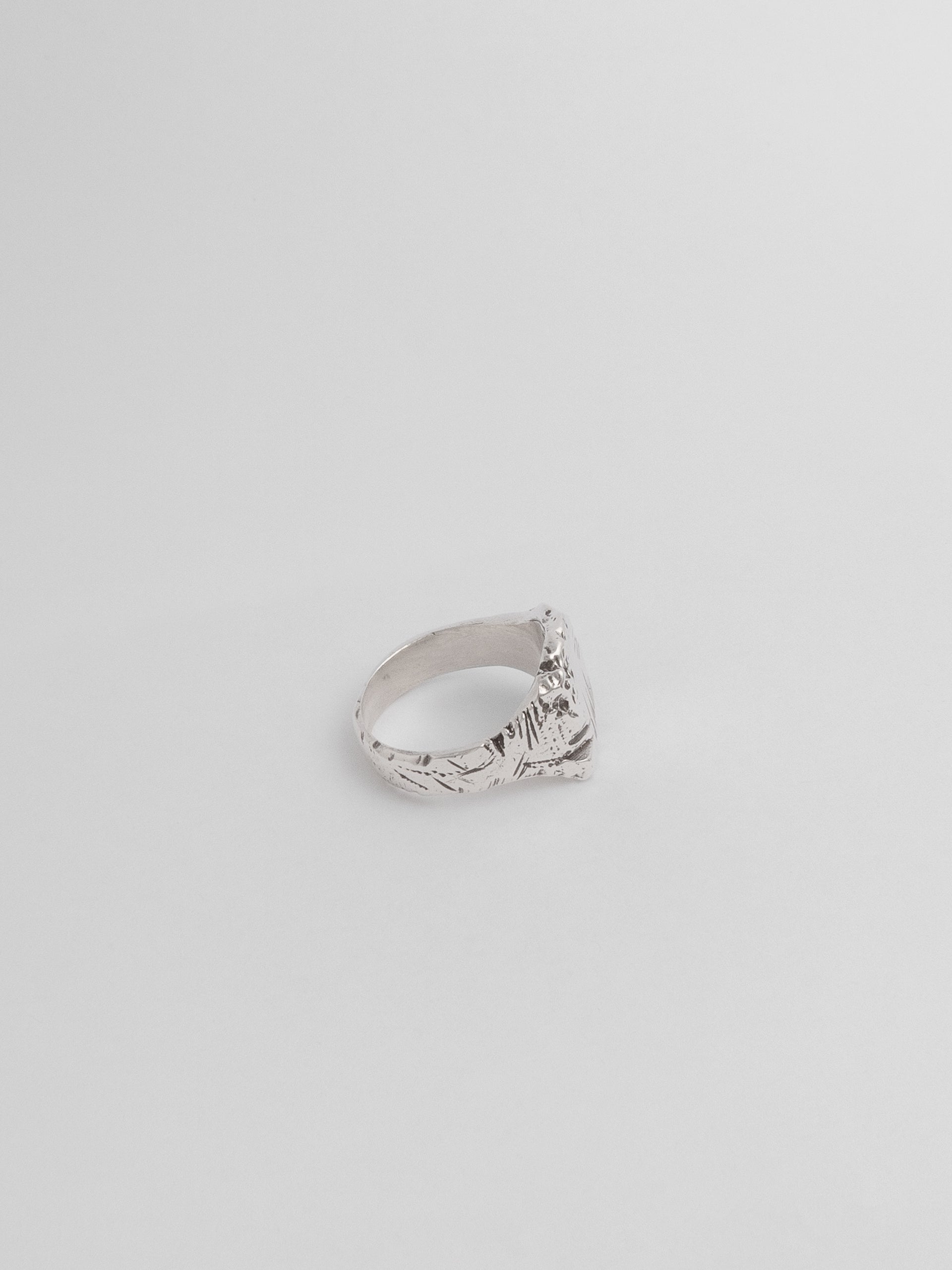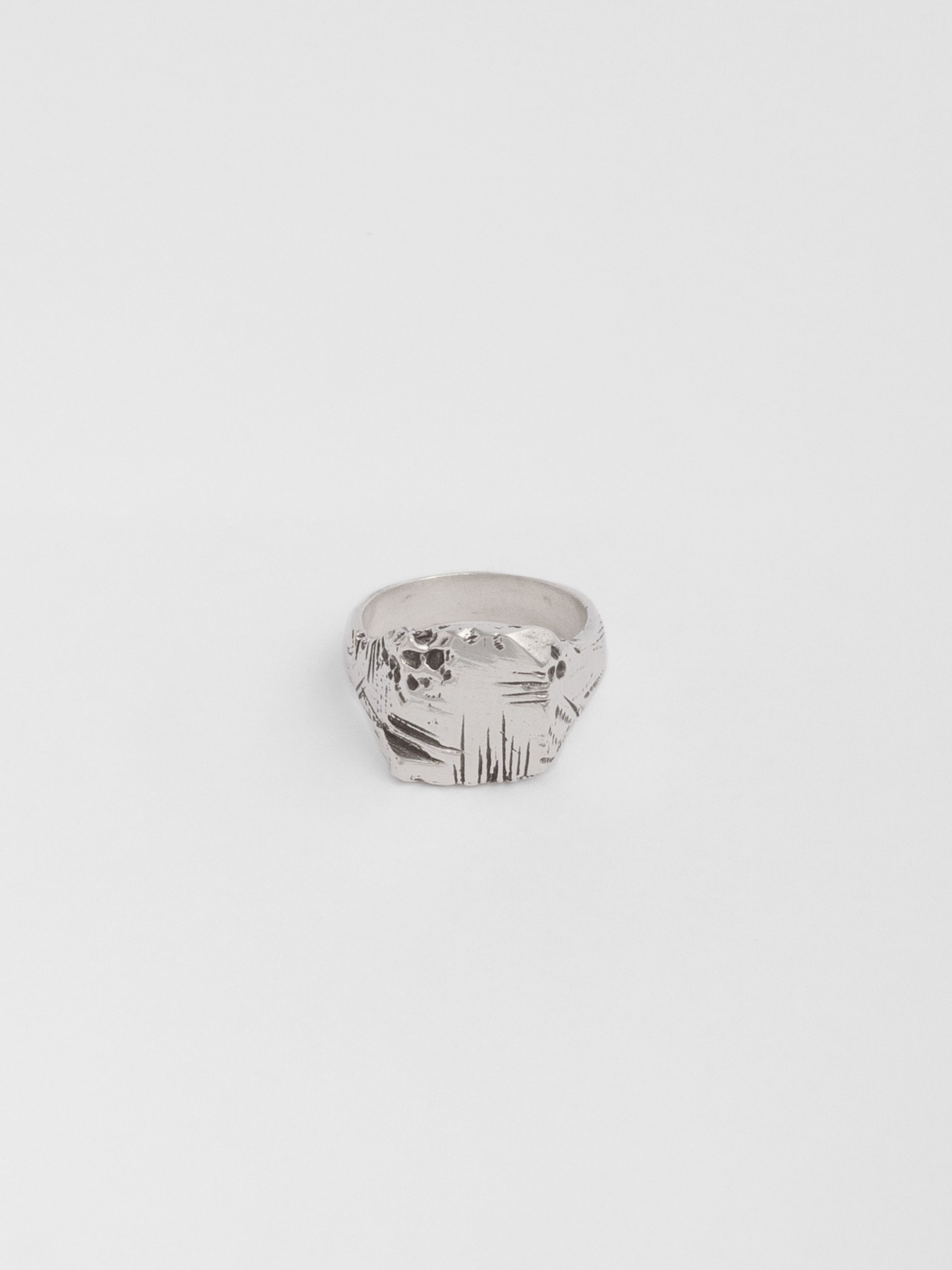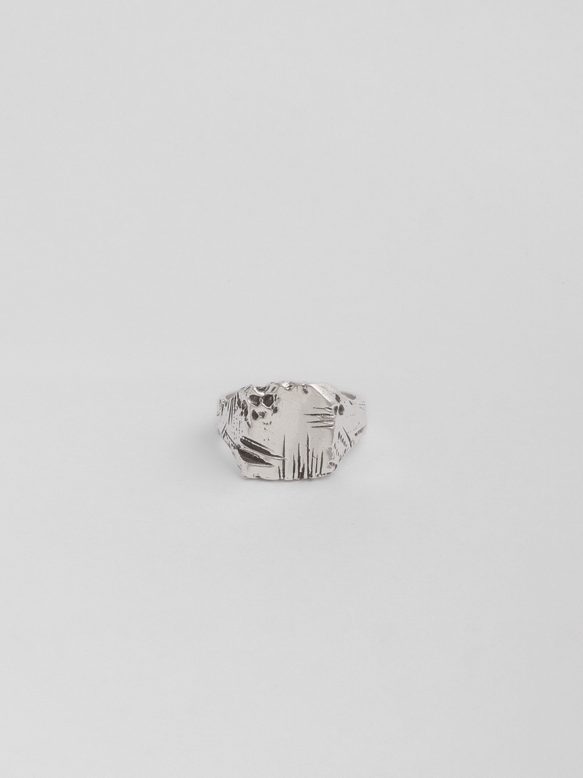 The Stranger Band features a square signet face with a raw, organic character. The surface is intentionally beaten, marked, and scuffed for a rugged, textured finish that makes each piece truly unique. Handmade in Newcastle / Mulubinba, it's a statement of individuality and craftsmanship.