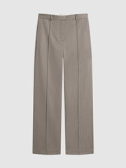 - Waisted, straight-slim leg, fly-front closure, belt loops, pintuck detail, side seam pockets, back asymmetric