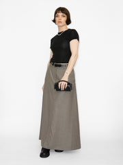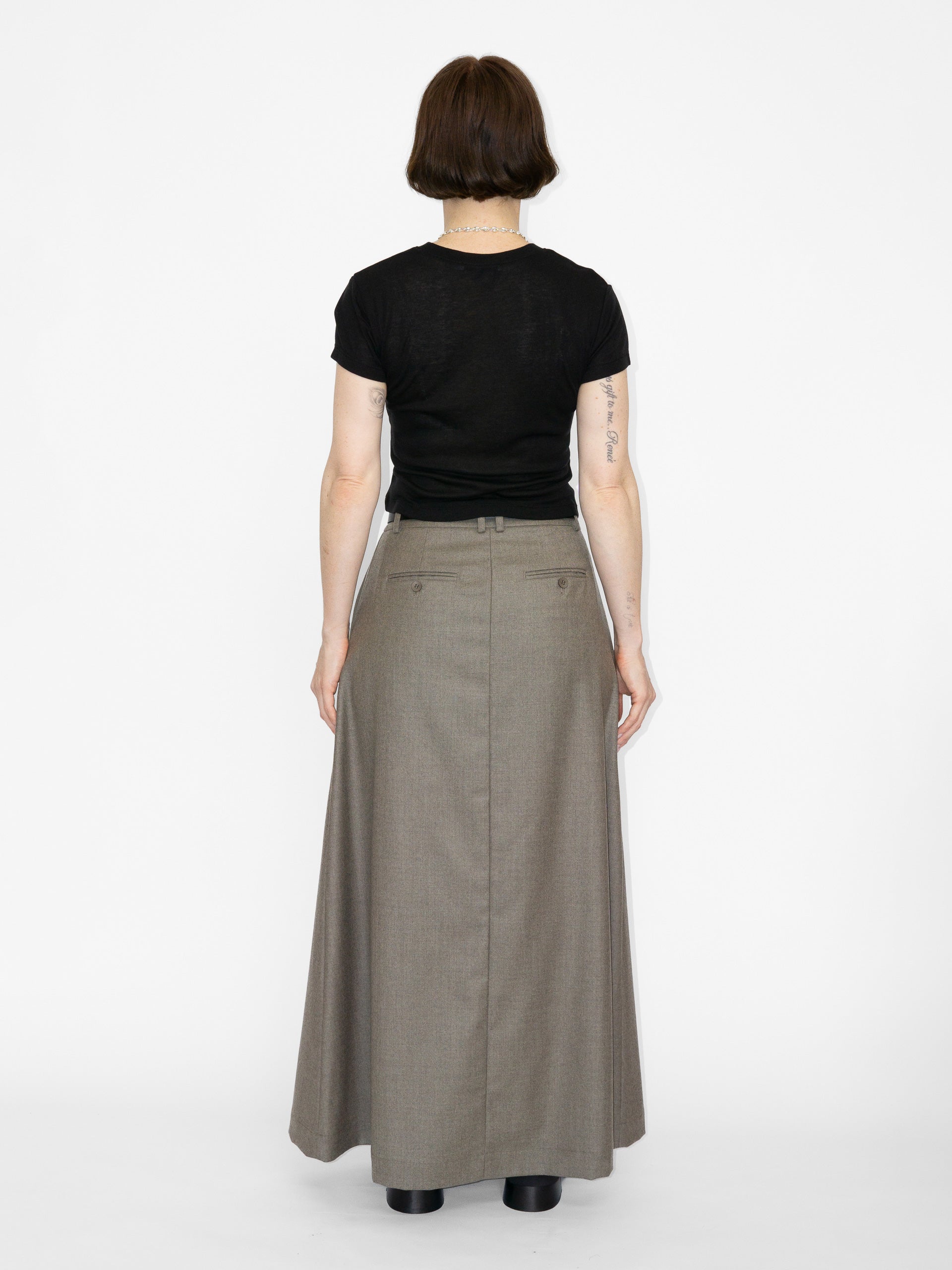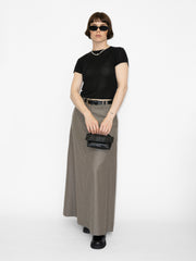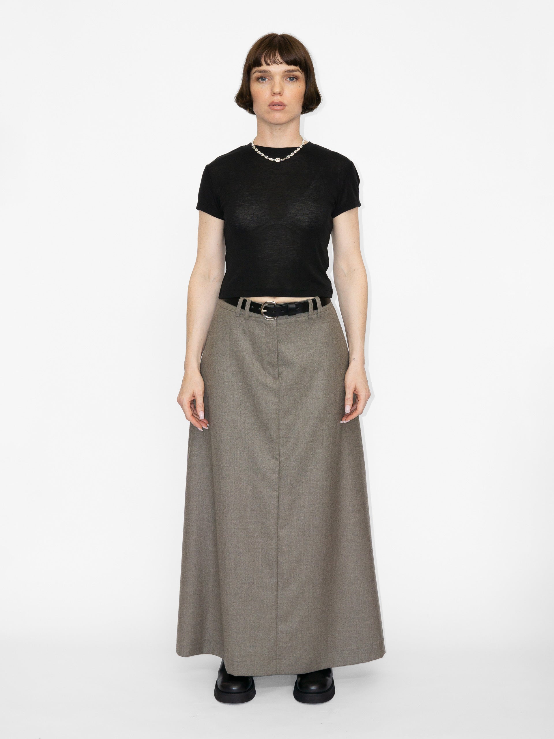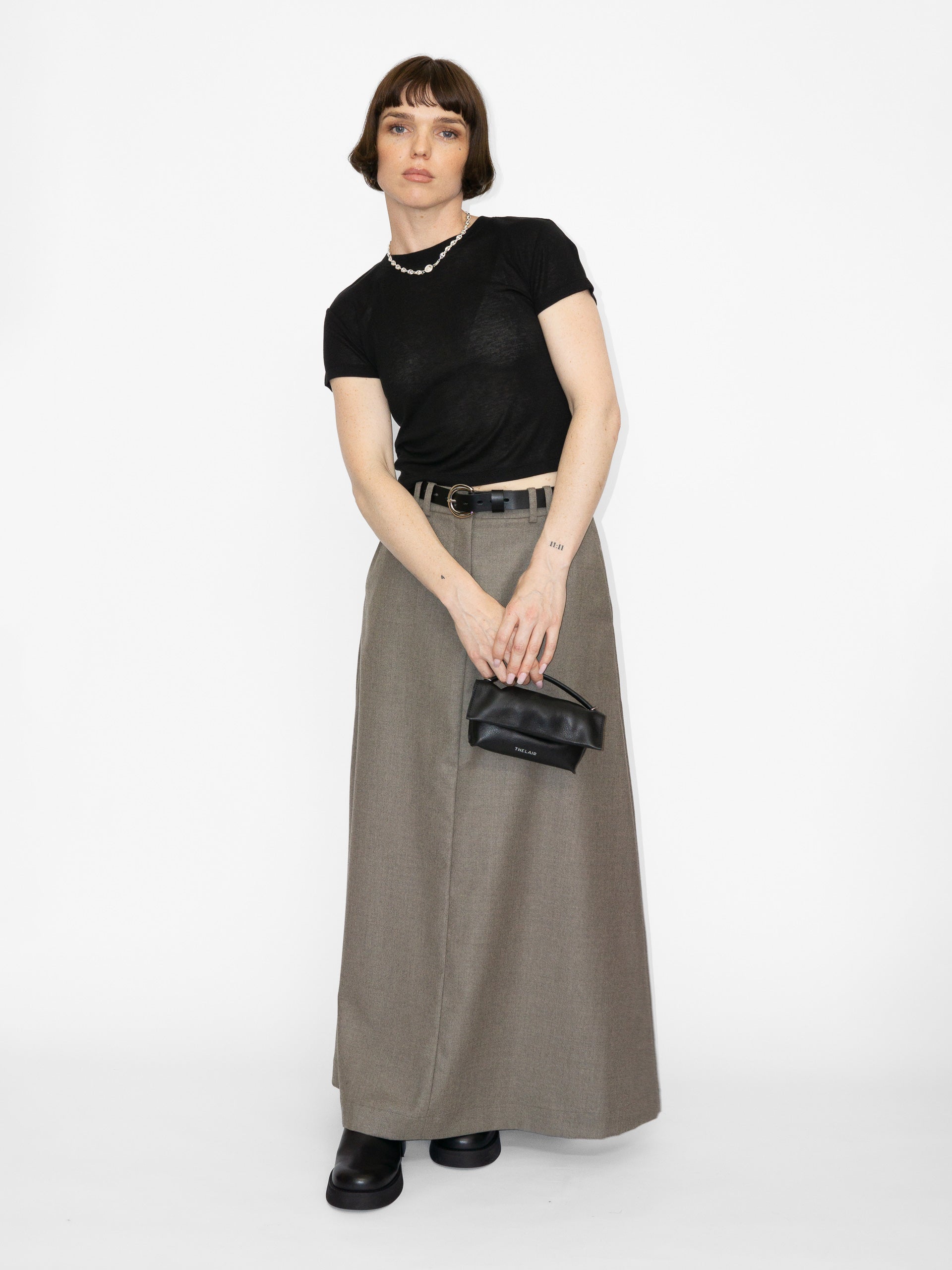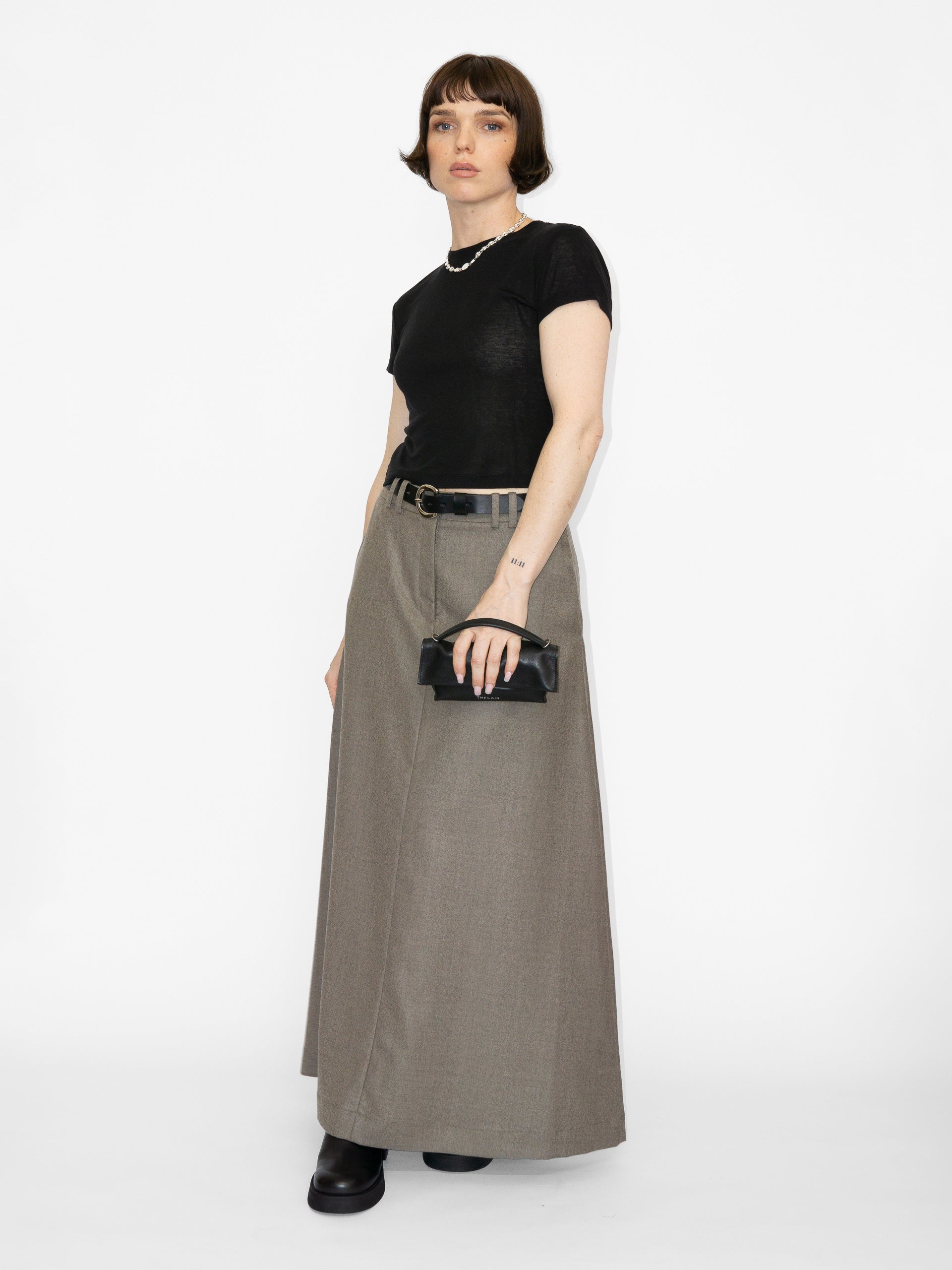 The Margot Skirt is our take on a classic woollen winter skirt. This attention-seeking A-line pattern boasts a spacious silhouette, (a strong stride will not be hindered) zip fly entry, and our double belt loop feature carried over from our favourite Otis trousers. Made from a premium, lightly textured 100% wool fabrication, Margot binds function and versatility, featuring front and back pockets, an ankle-grazing length, and belt loops, of course, to don your favourite TL Belt.