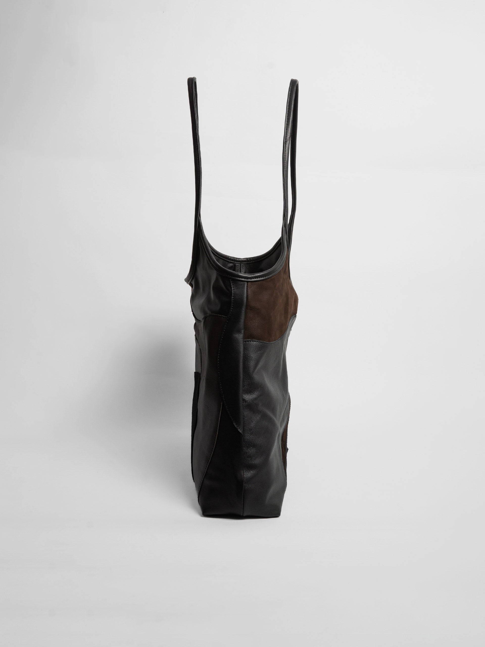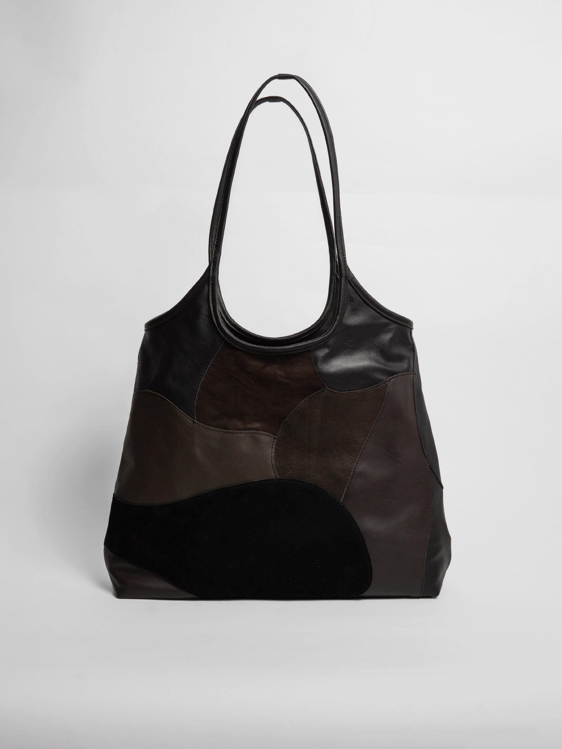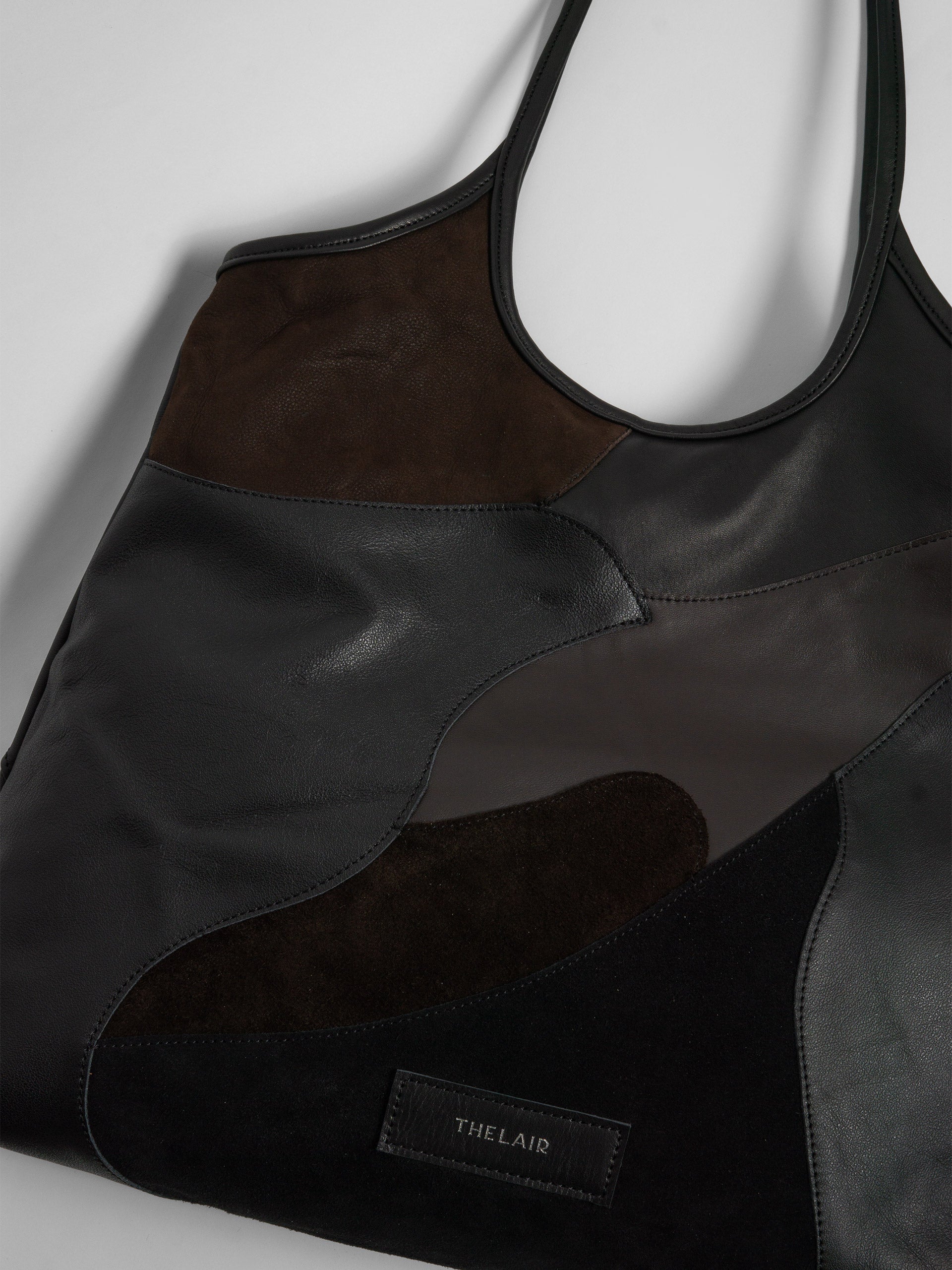 Created slowly in The Lair Studio, Newcastle, Freja is a classic tote bag with an unexpected edge. Crafted from supple yet hardy Italian leathers, this reversible tote offers a unique aesthetic. Whilst one side features meticulously hand-crafted patchwork leather and suede, made entirely from offcuts, the other unveils a smooth black Italian leather, each side as beautiful as the other. Every patchwork pattern is a one-of-a-kind creation, ensuring your bag is as unique as you are. The subtle A-line shape provides ample storage space, while the black side features a convenient pocket and zip closure.