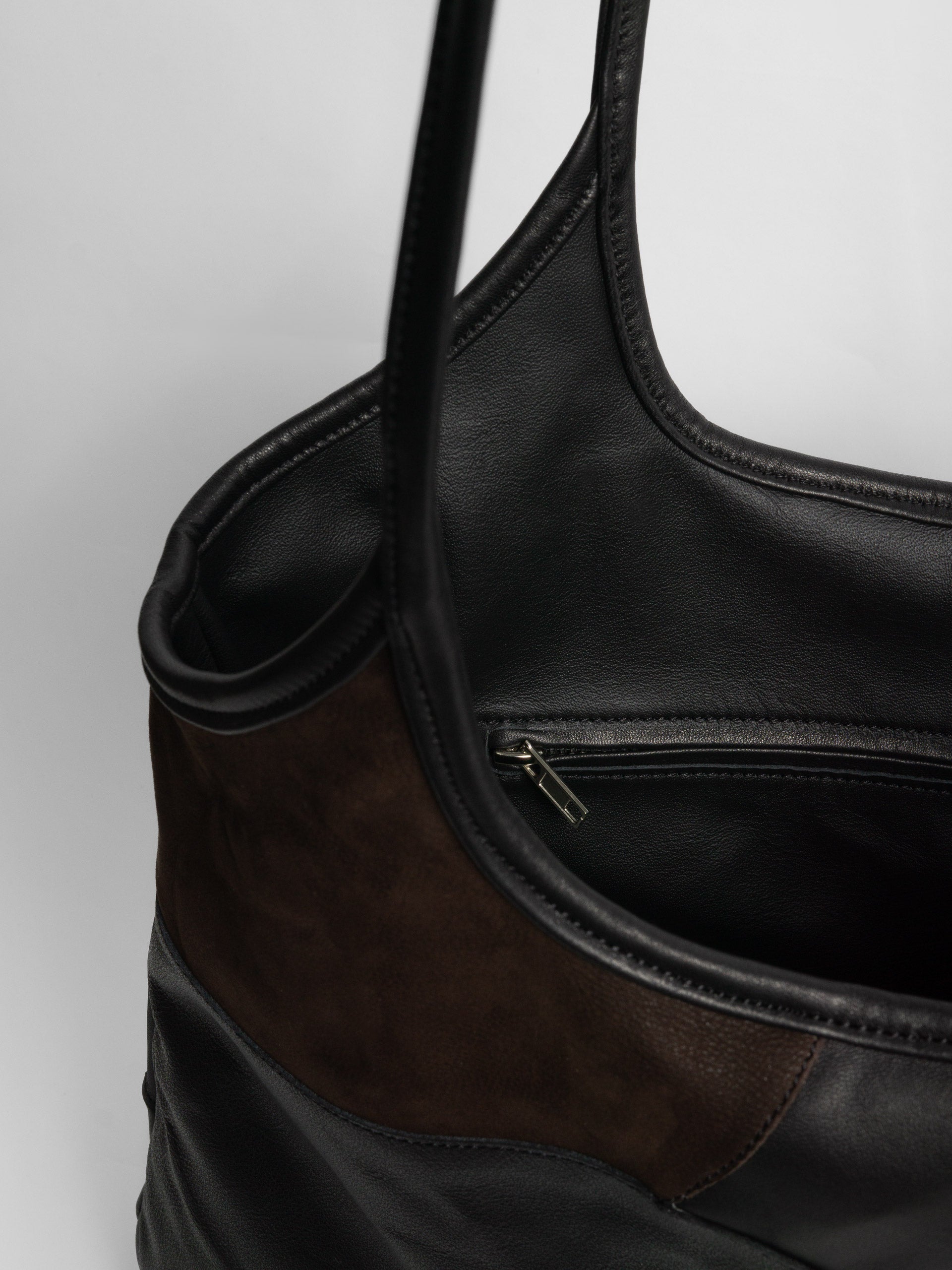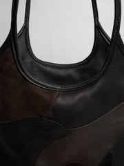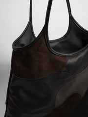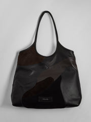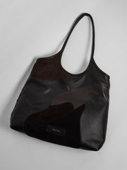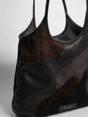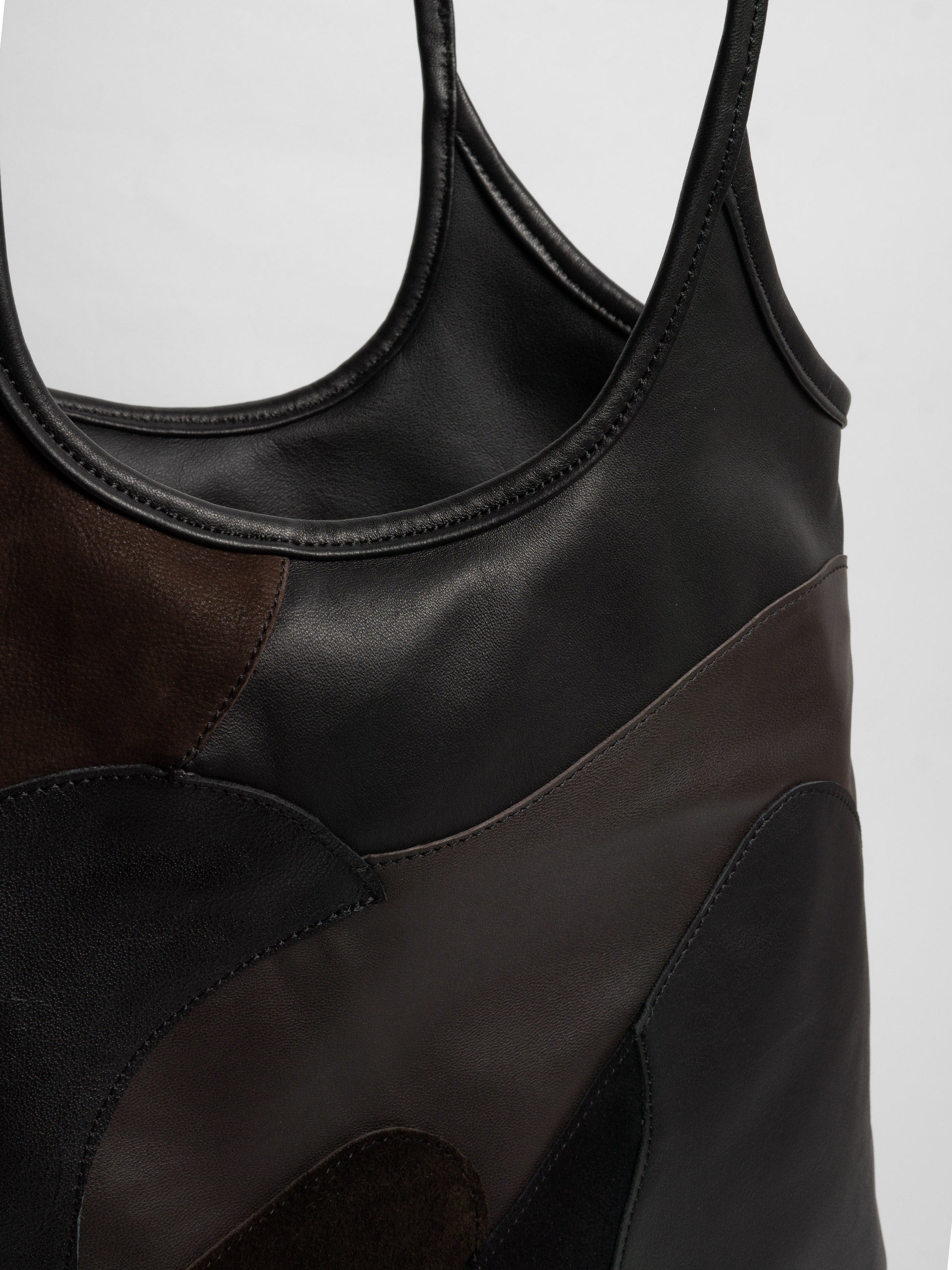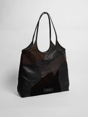 Created slowly in The Lair Studio, Newcastle, Freja is a classic tote bag with an unexpected edge. Crafted from supple yet hardy Italian leathers, this reversible tote offers a unique aesthetic. Whilst one side features meticulously hand-crafted patchwork leather and suede, made entirely from offcuts, the other unveils a smooth black Italian leather, each side as beautiful as the other. Every patchwork pattern is a one-of-a-kind creation, ensuring your bag is as unique as you are. The subtle A-line shape provides ample storage space, while the black side features a convenient pocket and zip closure.
