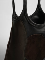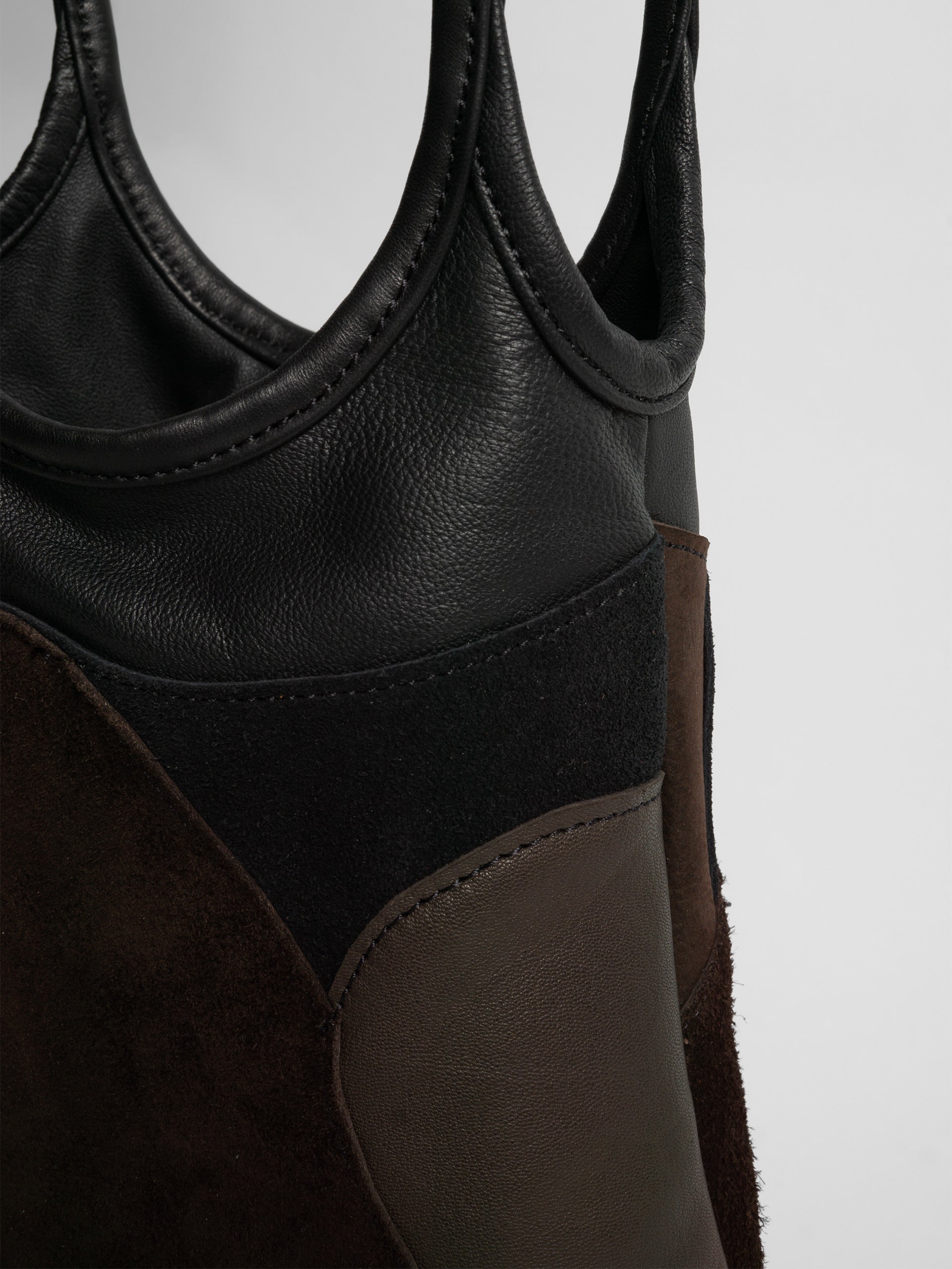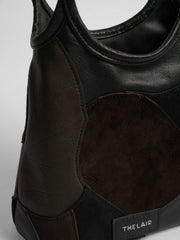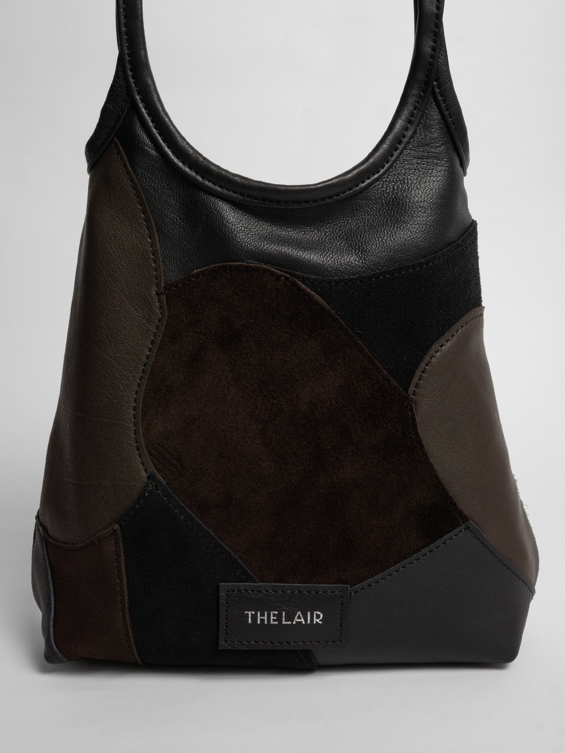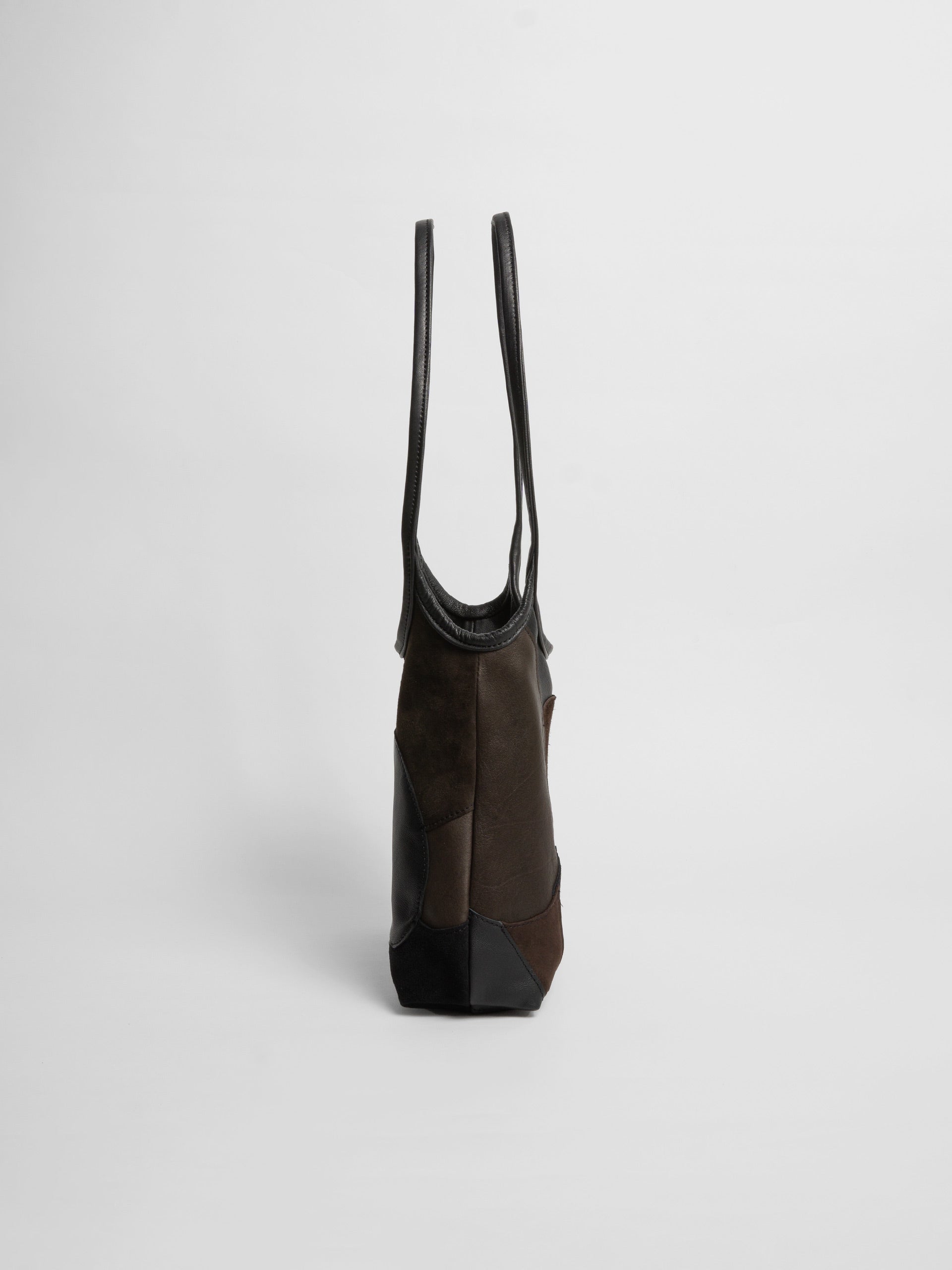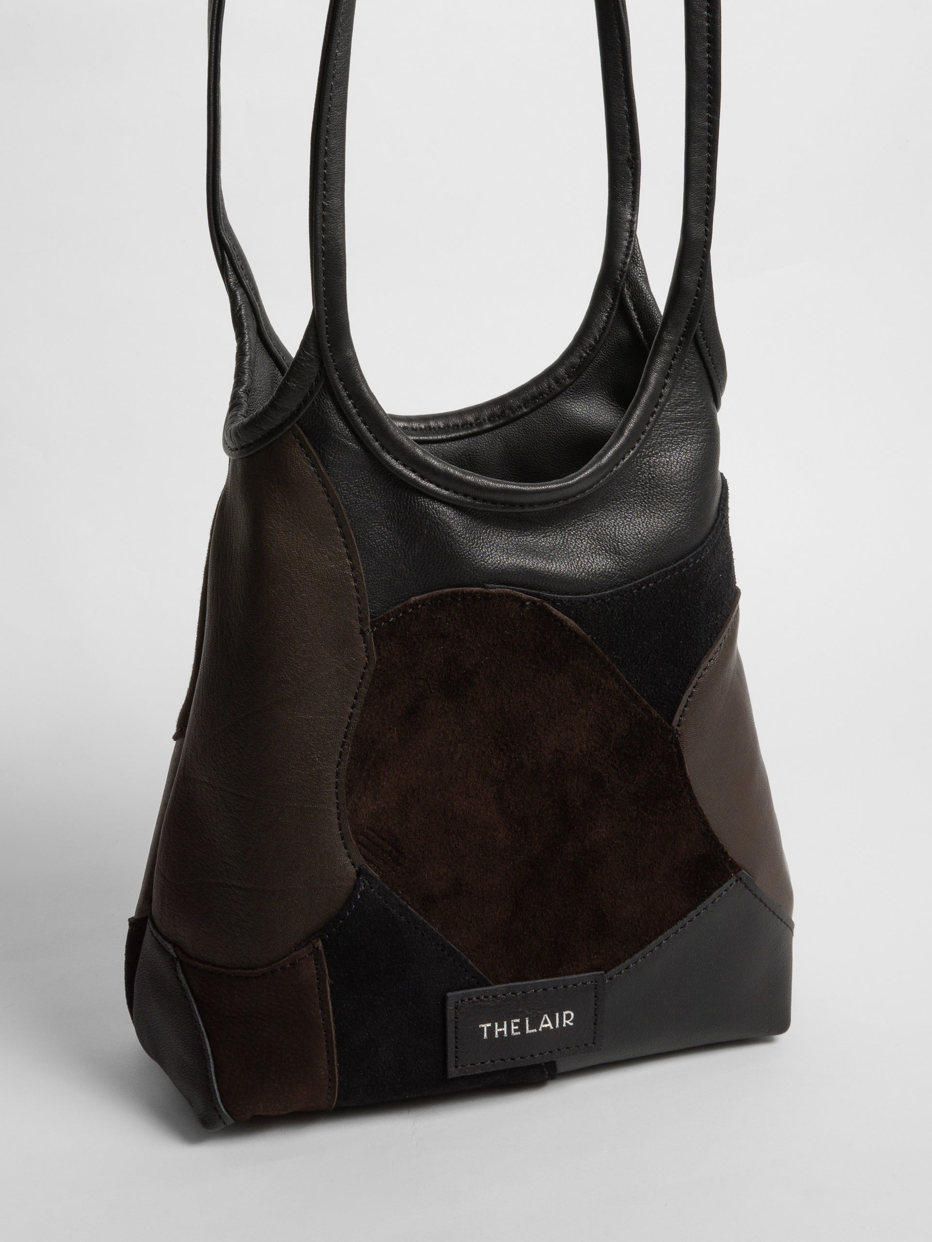 Created slowly in The Lair Studio, Newcastle, Freja is a classic tote bag with an unexpected edge. Crafted from supple yet hardy Italian leathers, this reversible tote offers a unique aesthetic. Whilst one side features meticulously hand-crafted patchwork leather and suede, made entirely from offcuts, the other unveils a smooth black Italian leather, each side as beautiful as the other. Every patchwork pattern is a one-of-a-kind creation, ensuring your bag is as unique as you are. The subtle A-line shape provides ample storage space for a petite bag. The Freja Tote is an exercise in mindfulness due to its slow creation process and serves as a reminder to embrace a thoughtful, deliberate pace in life. As versatile as they come, the Freja Tote offers the practicality of two bags in one, perfect for any occasion.
