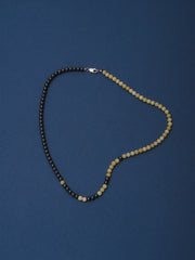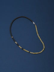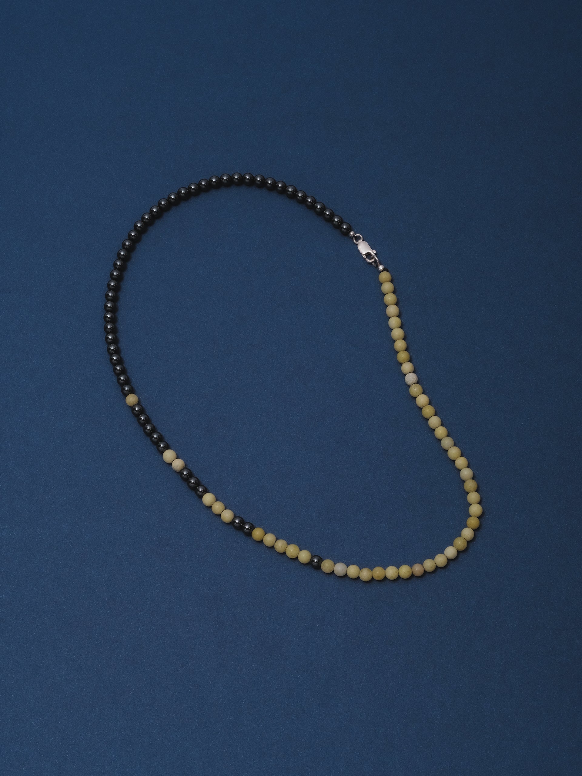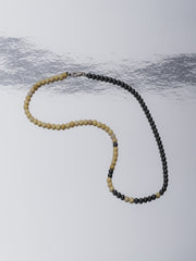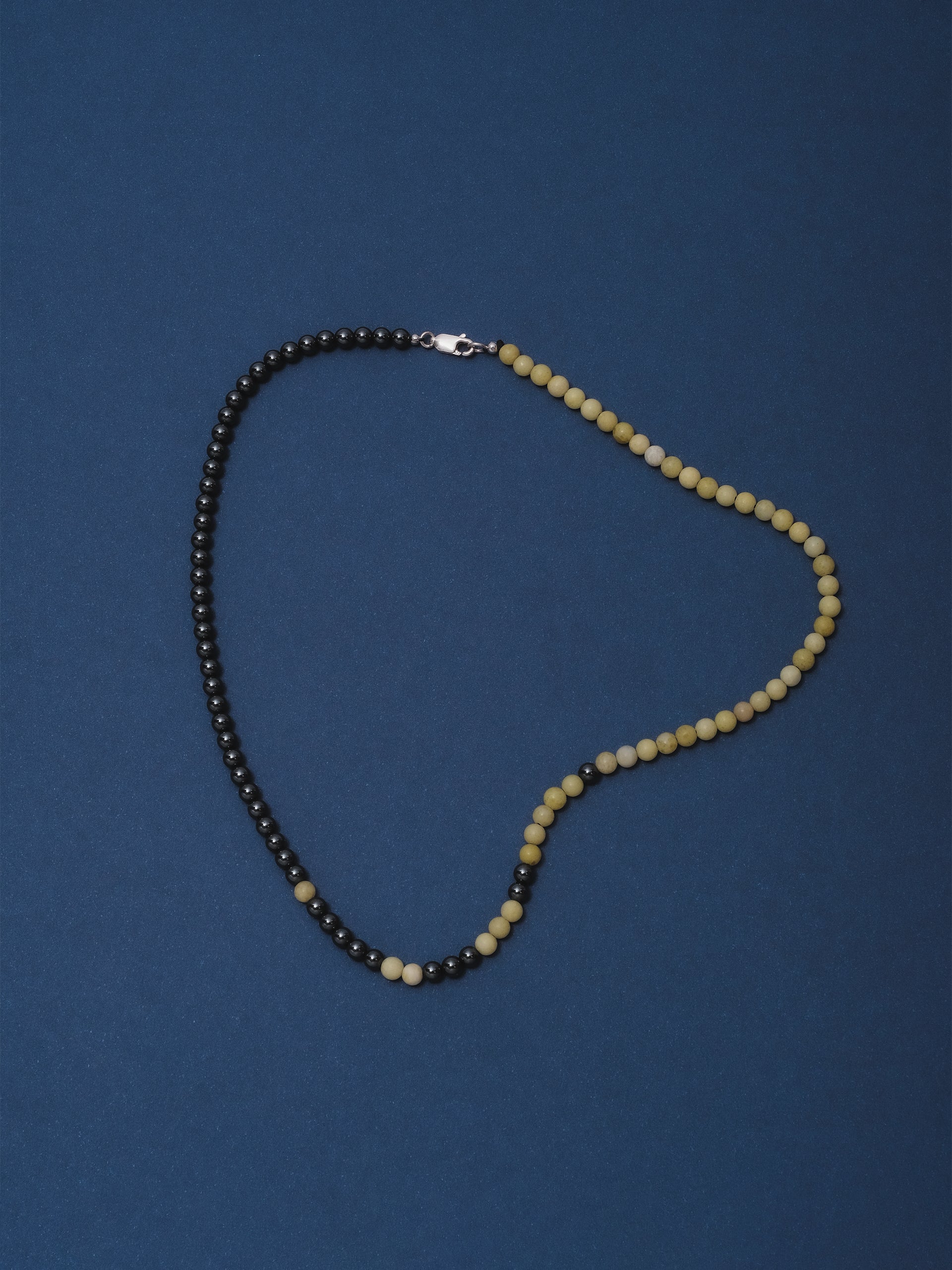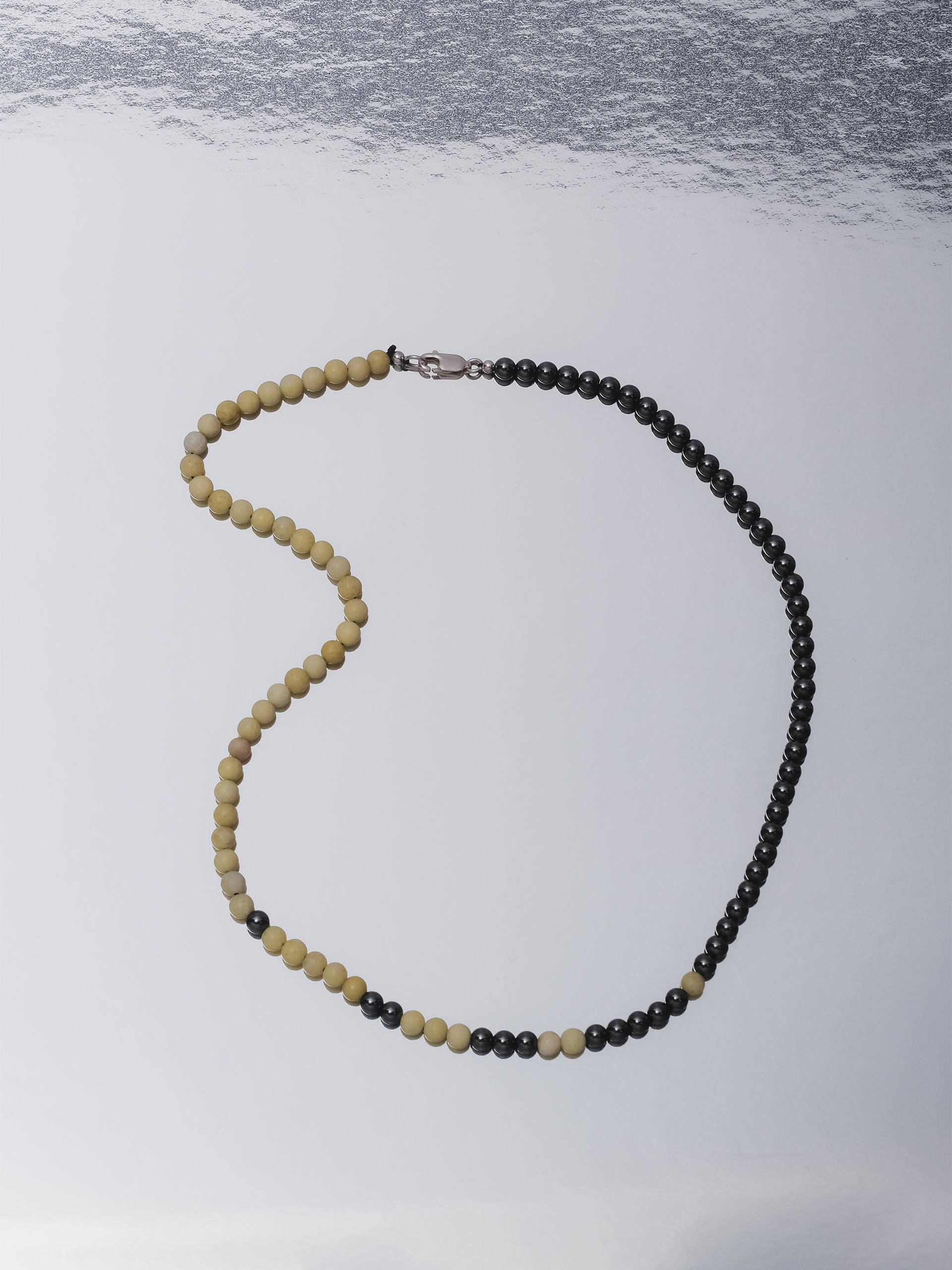 Designed and handcrafted in The Lair Studio, Newcastle, the Bokashi Beaded Necklace explores soft transitions and imperfect balance - its name drawn from the Japanese word for “blur” or “gradation.” Composed of a near half-half arrangement of Hematite and Yellow Serpentine, the strand plays with contrast while resisting symmetry. A scattering of Hematite beads drifts into the opposing side, creating a subtle, off-centre fade reminiscent of tonal Bokashi shading. Sitting close to the collarbone, the piece feels modern, grounded, and quietly expressive.