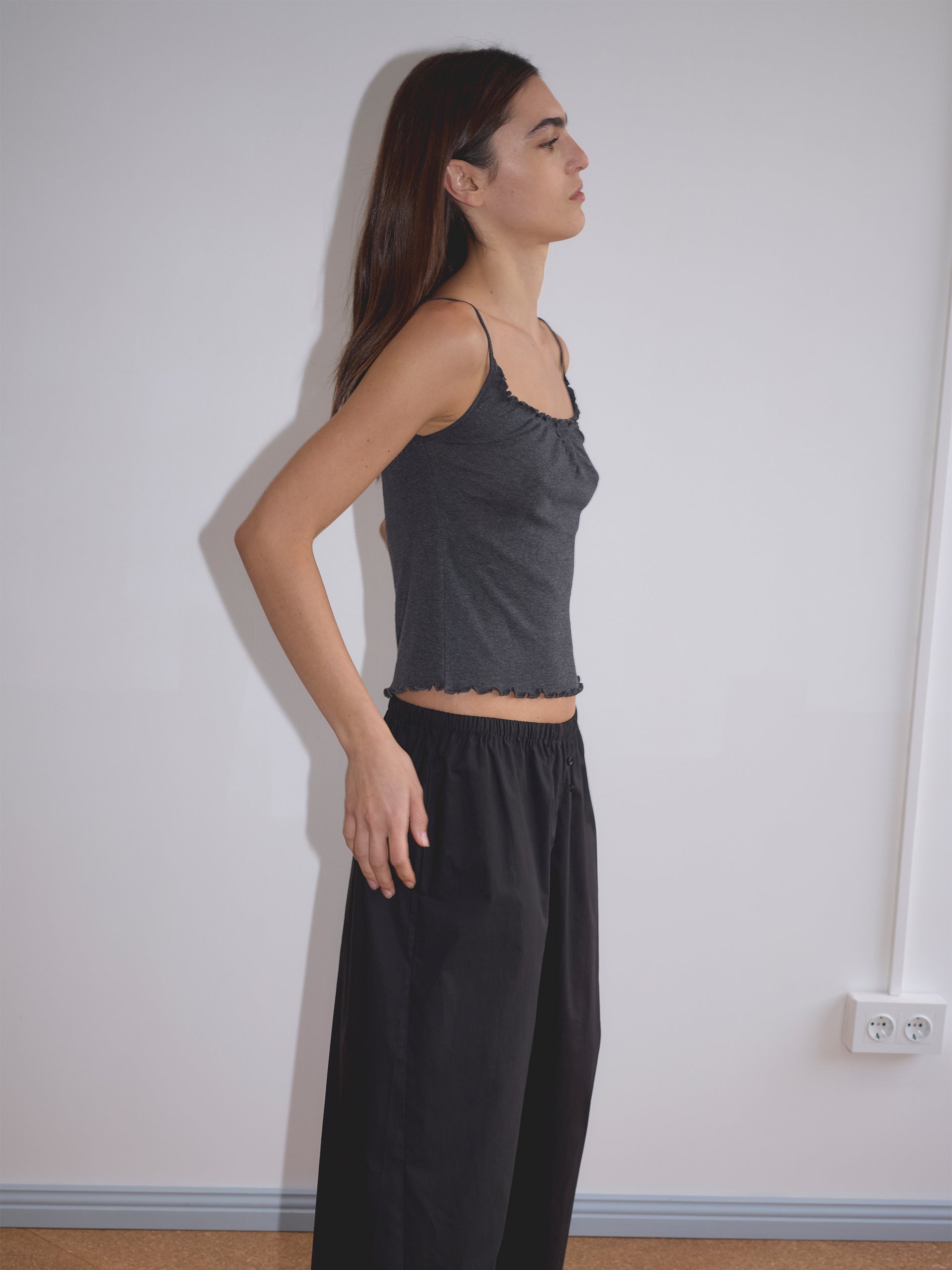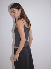 A soft, feminine basic with subtle texture, the Flounce Tank by Deiji Studios features a delicate elastic frill neckline and shirred V-panel detail at the centre front. Finished with fine self-fabric straps and a baby lock hem for a refined touch.