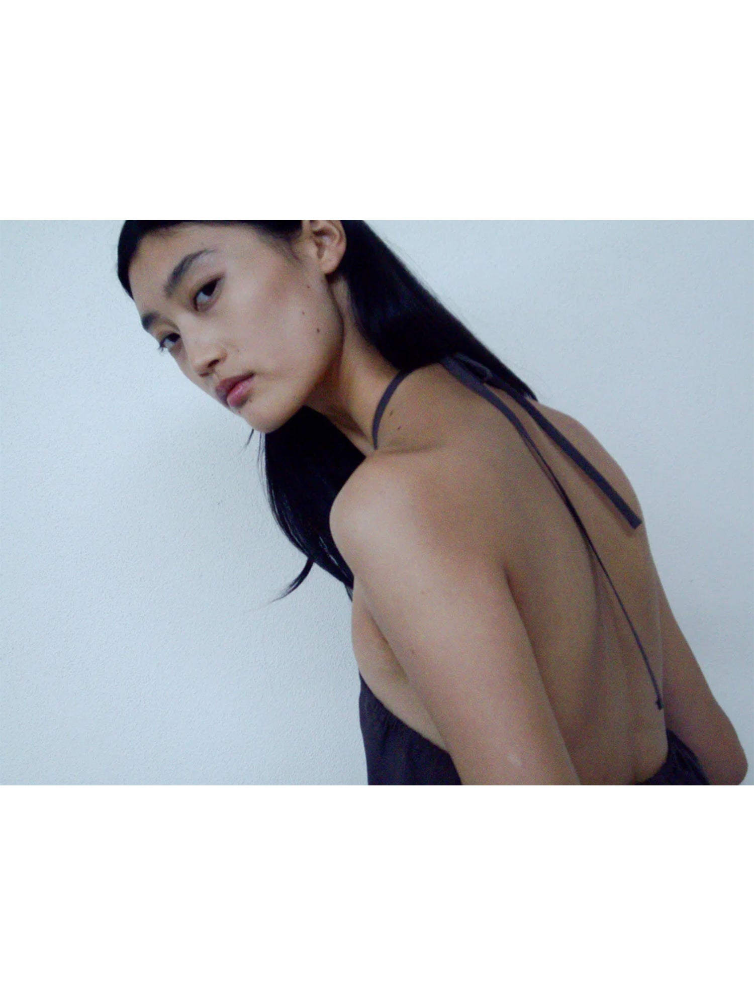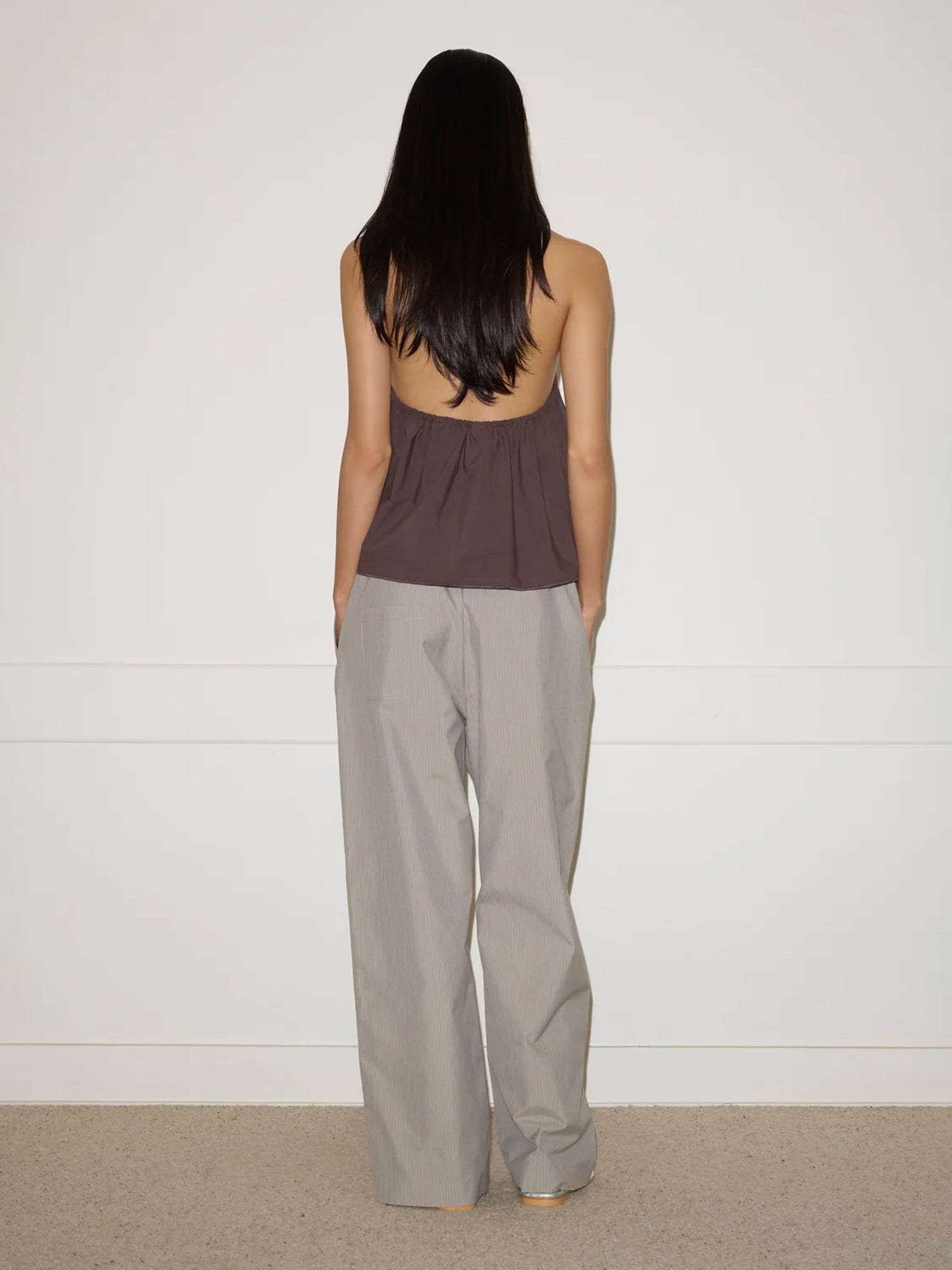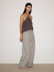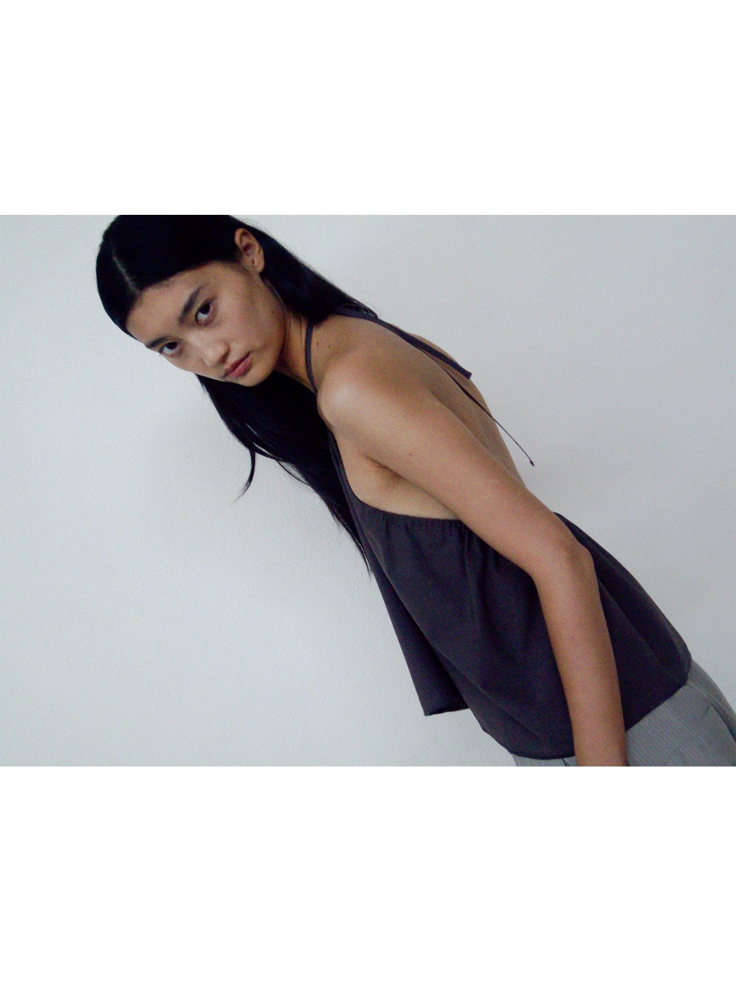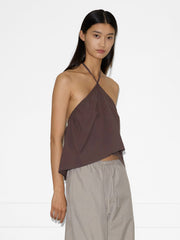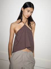 Relaxed wrap-around halter top features a flattering straight neckline, fine tie adjustable neckline, neck tie and babylock hem finish.