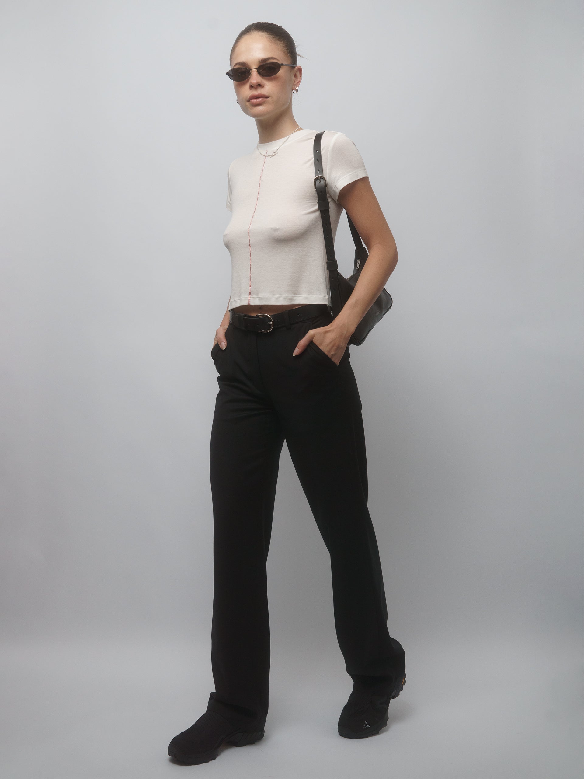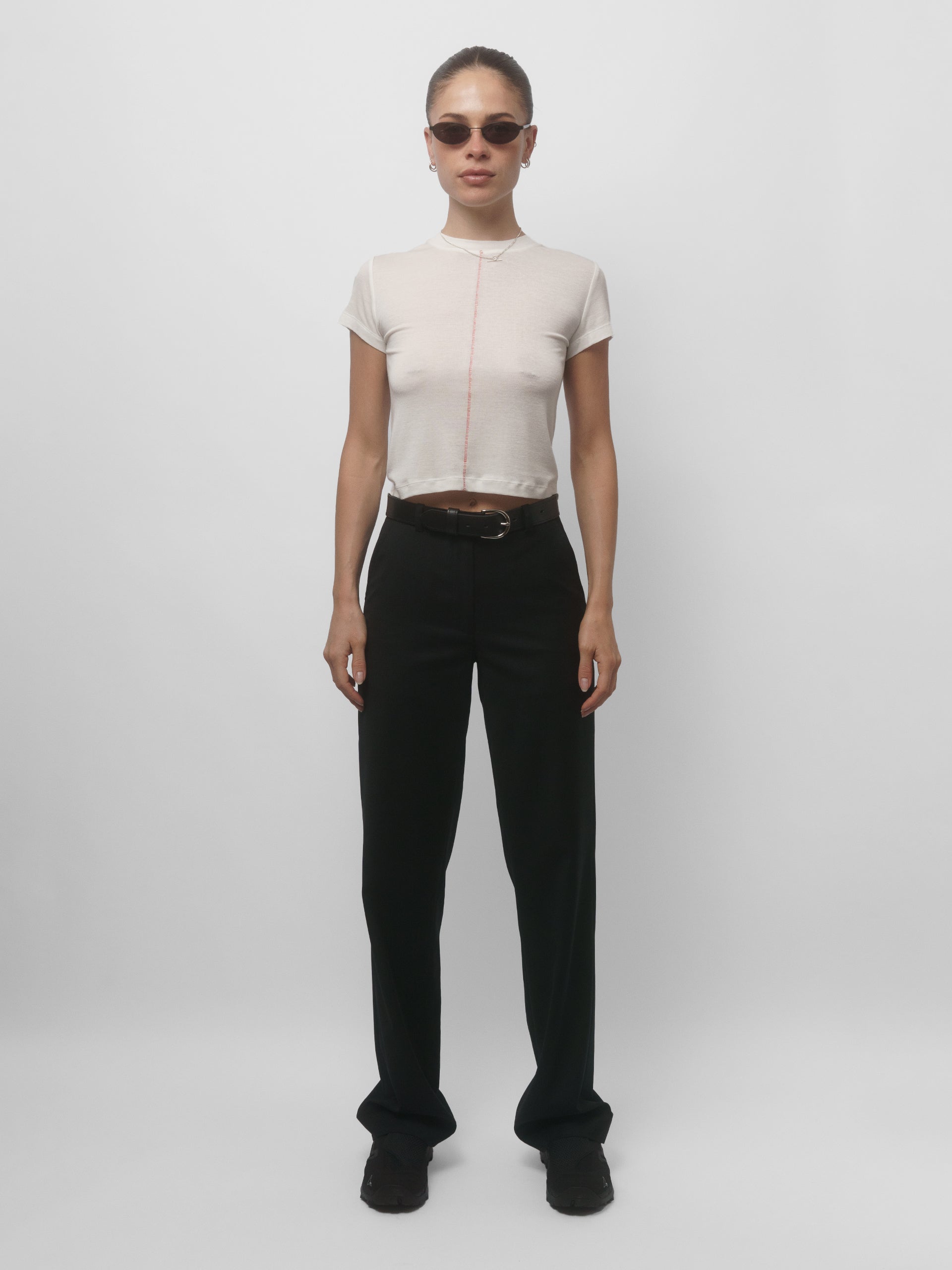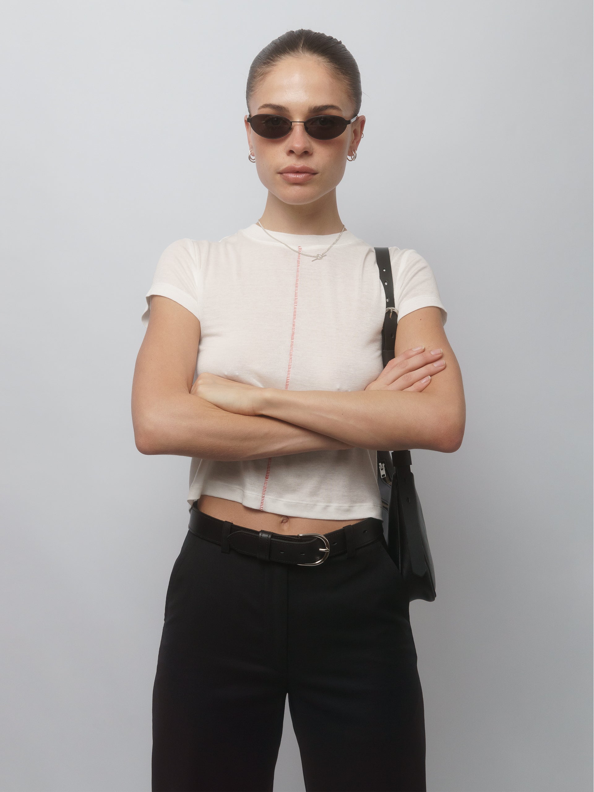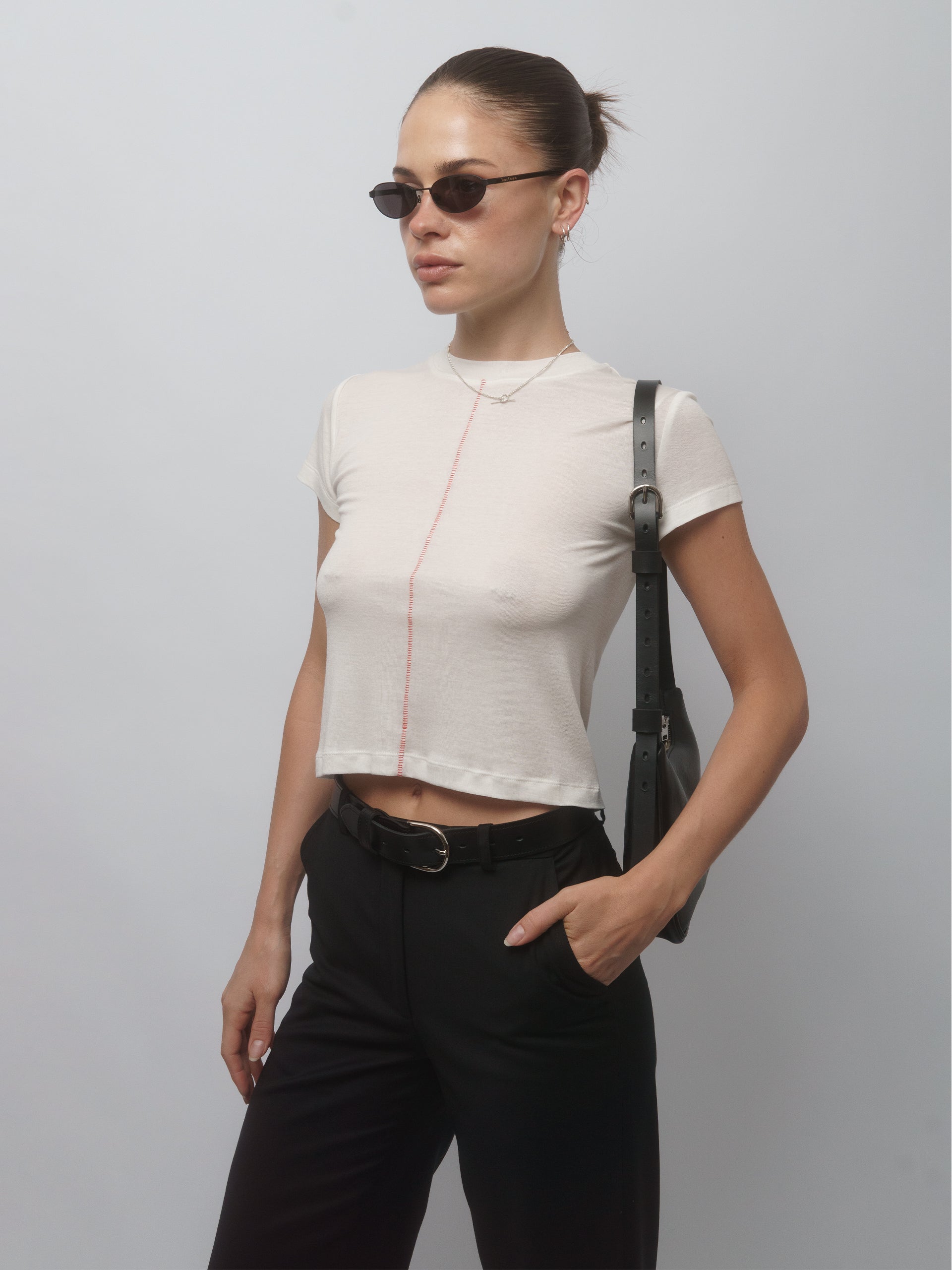 The Matilda Ladder Stitch Tee redefines the classic baby tee. Made from a refined wool/tencel blend, it delivers warmth with a breathable, fluid drape. A clean neckline and exposed contrast stitching down the centre add a subtle, elevated edge to this timeless piece.