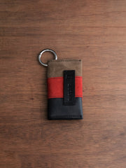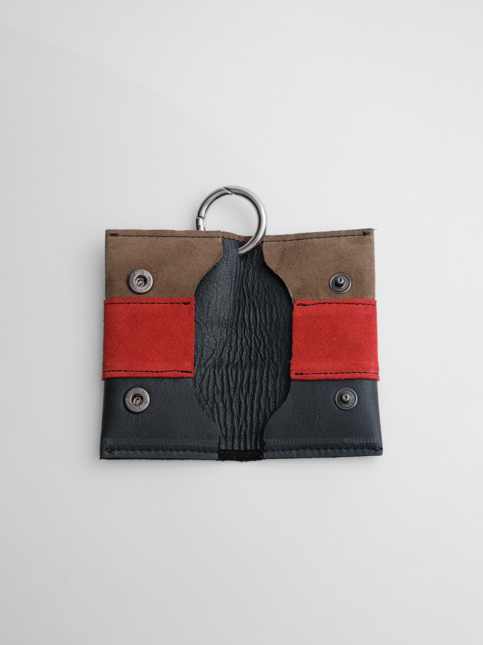 The Gwen Wallet Patchwork edition transforms a simple cardholder into a small act of collage - panels of leather and suede in moody tones of blue, brown, black, and red cut and pieced together into unique arrangements. Finished with a pierced O-ring at the corner, no two are alike.