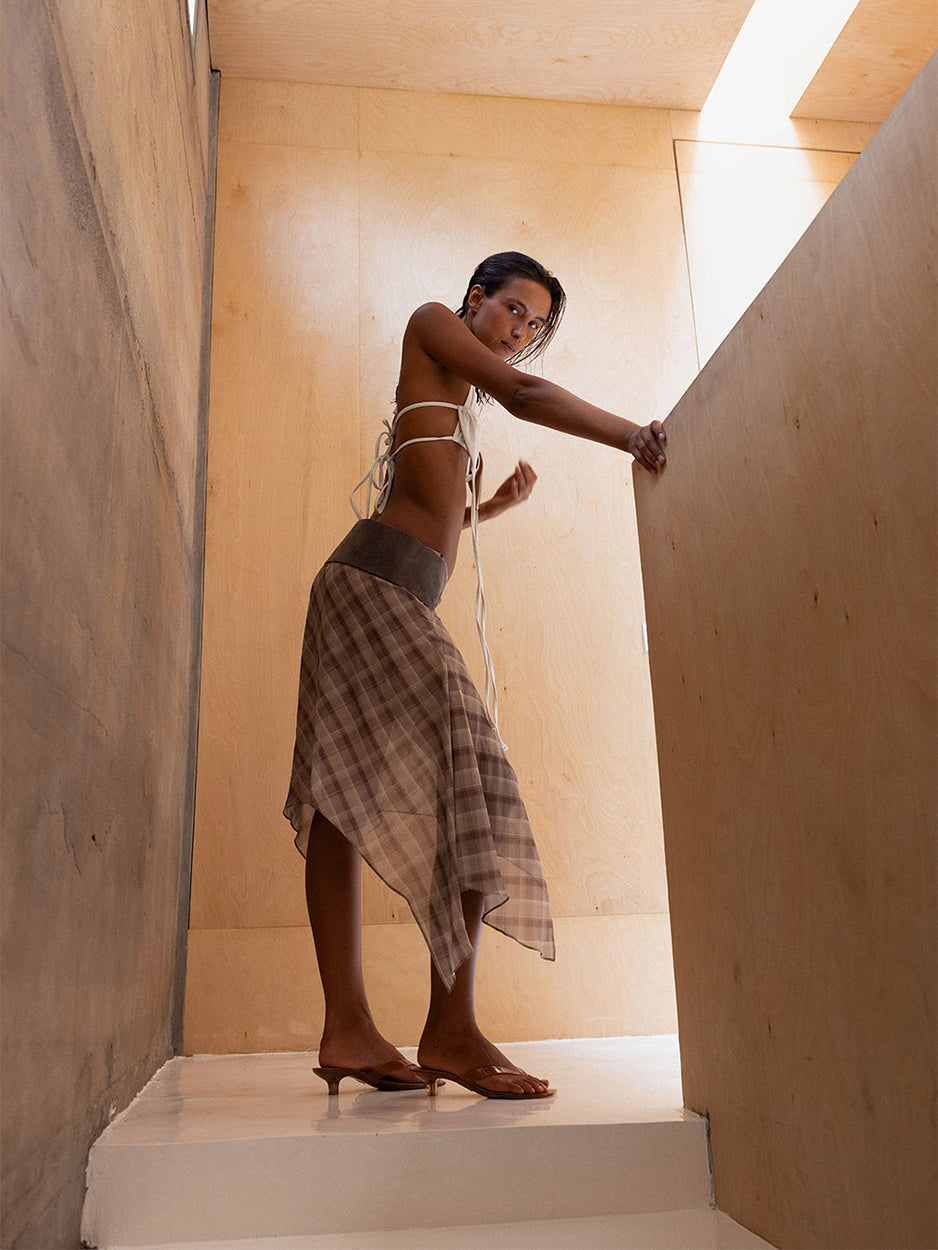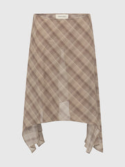 Elevate your wardrobe with this versatile midi silk skirt that effortlessly transitions from day to night. Crafted from luxurious 100% silk with a delicate sheer finish, it features an eye-catching hi-low hemline that creates beautiful movement with every step. The low-rise silhouette and concealed side zipper offer a sleek, refined look, while the understated hazy plaid pattern in neutral tones ensures it pairs seamlessly with your existing pieces.