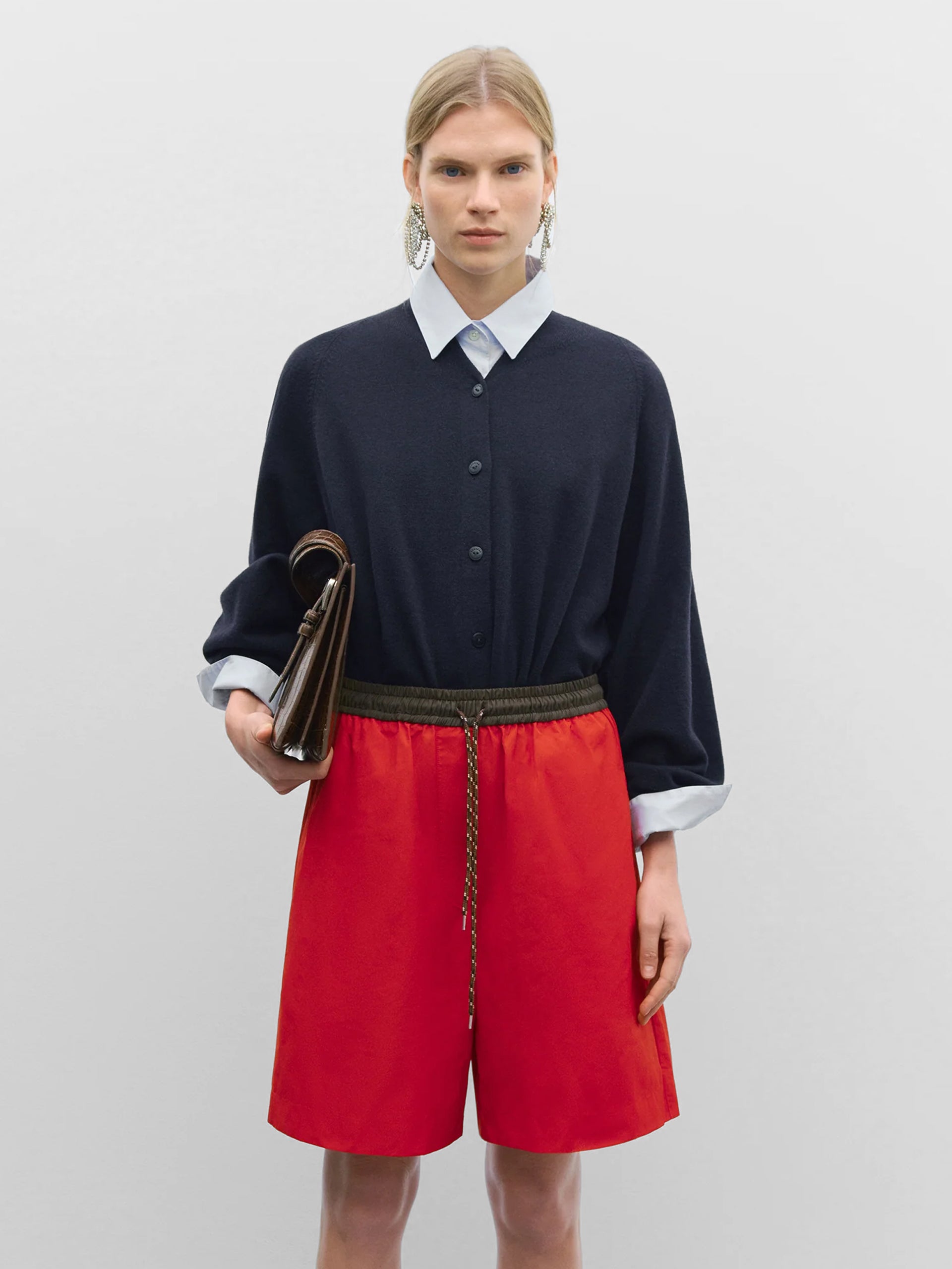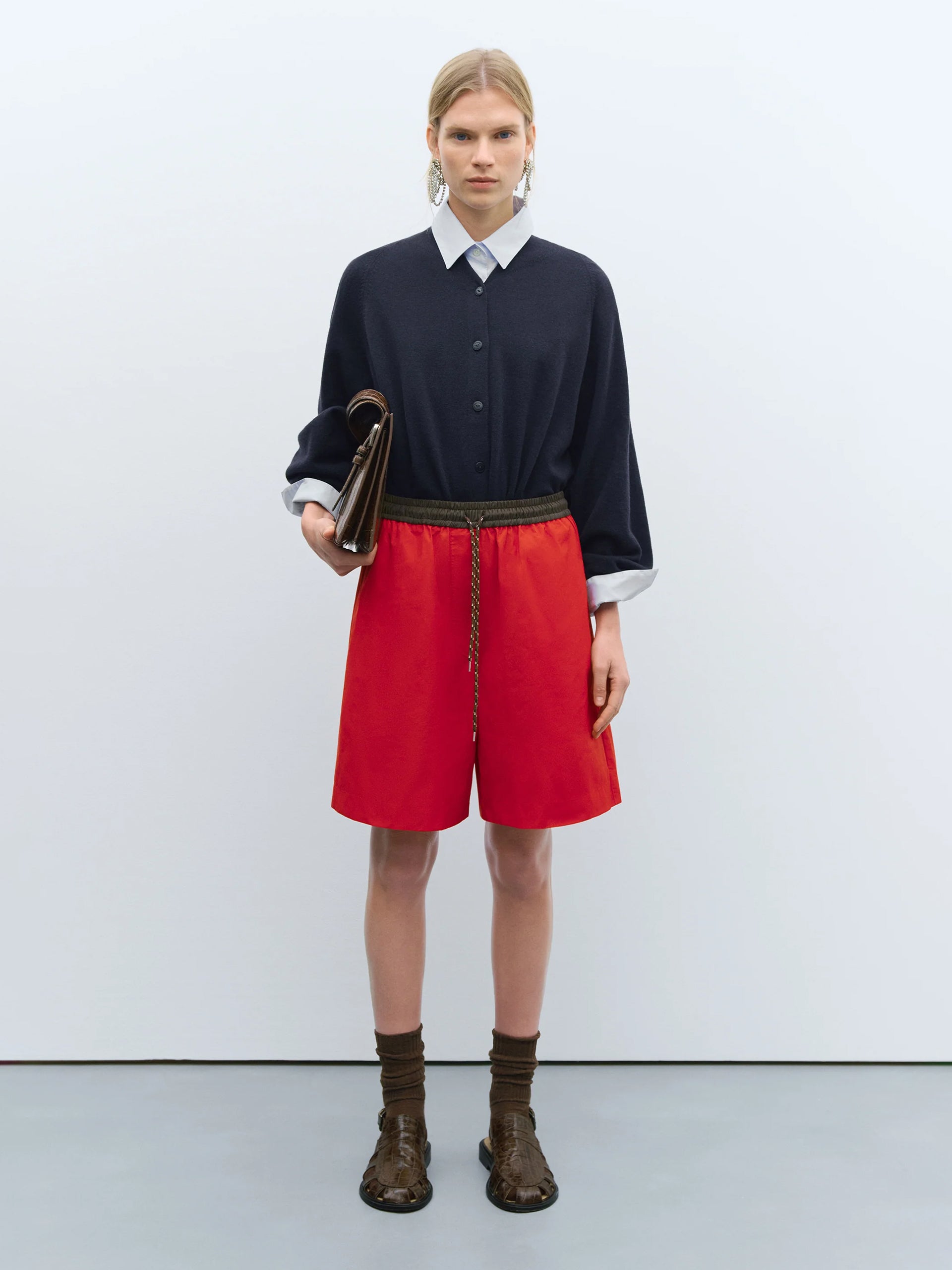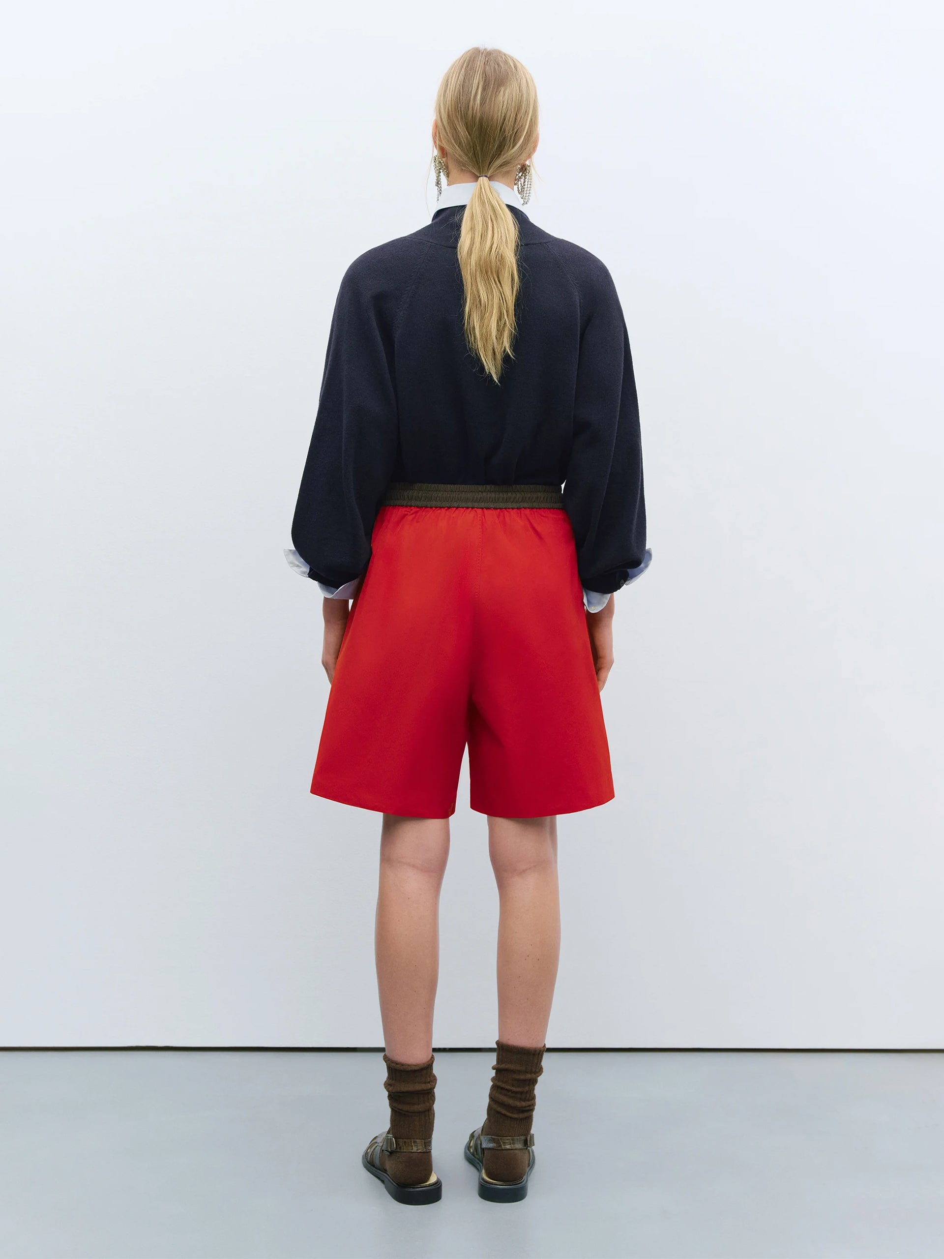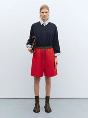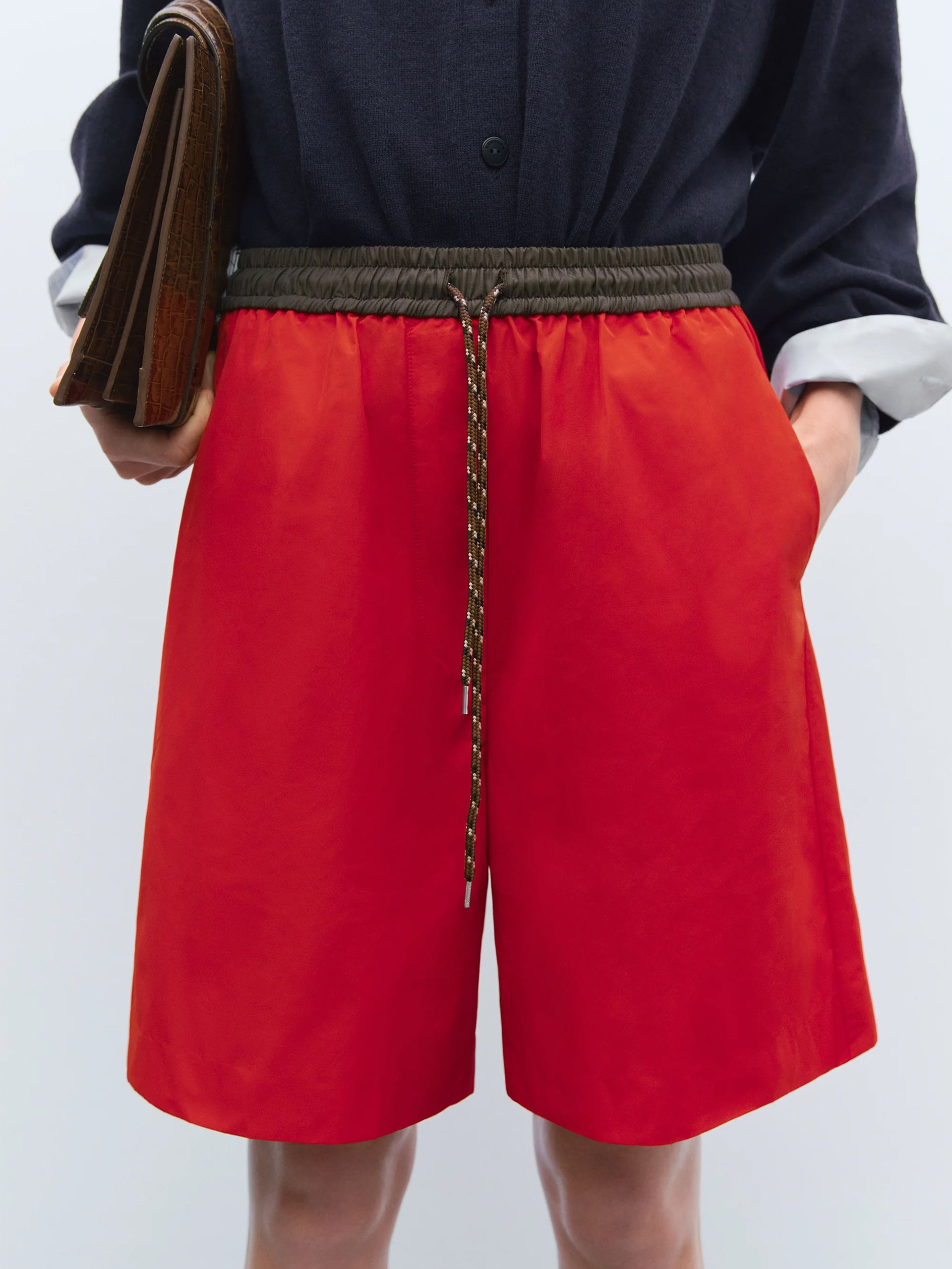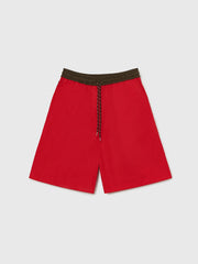 A sporty yet relaxed style in a striking red hue. Designed with a contrasting brown elasticated waistband and a sailor-style cord drawstring for added comfort. This flattering mid-length piece is finished with side pockets for practicality.